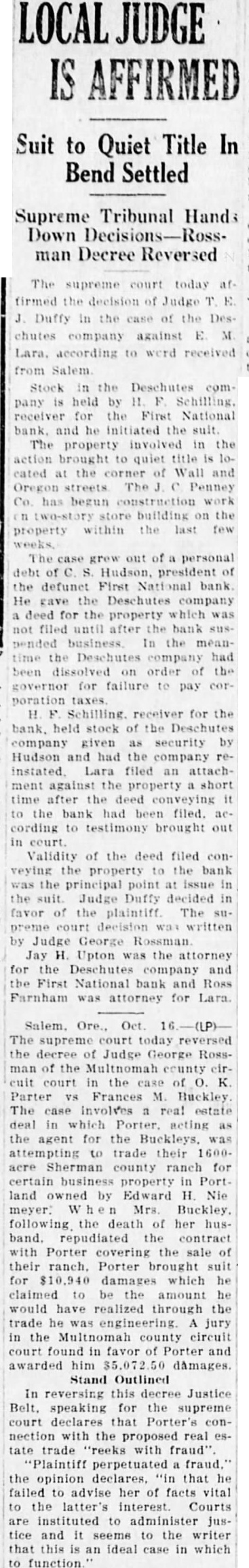 Stock in the Deschutes company is held by 11 F Schilling. receiver for the First National bank. and he initiated the suit. The property involved in the action brought to quiet title is located at the corner of Wall and Oregon streets The J. c Penney Co. has begun construction work on two-story store building on the property within the last few The case grew out of a personal debt of C. S. Hudson, president of the defunct First National bank He gave the Deschutes company a deed for the property which was not filed until after the bank suspended business In the meantime the Deschutes company had been dissolved on order of the governor for failure to pay corporation taxes H F. Schilling. receiver for the bank. held stock of the Deschutes company given as security by Hudson and had the company reinstated. Lara filed an attachment against the property a short time after the deed conveying it to the bank had been filed. according to testimony brought out in Validity of the deed filed conveying the property to the bank was the principal point at issue in the suit. Judge Duffy decided in favor of the plaintiff The supreme court decision was written by Judge George Rossman. Jay H. Upton was the attorney for the Deschutes company and the First National bank and Ross Farnham was attorney for Lara.