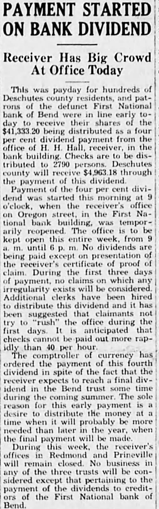 This was payday for hundreds of Deschutes county patthe defunct First National bank of Bend line their shares the being distributed four dividend payment from office H receiver, in bank building. Checks are be tributed 2790 Deschutes county will through the payment this dividend. Payment the four cent diviper dend started this morning o'clock, when the receiver's Oregon street, the First National bank temporreopened. The entire week from No dividends being paid proof During the first three days payment, claims on which irregularity exists considered Additional clerks have been hired distribute dividend been suggested that claimants not the during first days. anticipated that checks paid out hour ordered the payment of this fourth dividend spite the fact that reach final idend the trust time during the The reason for this payment desire the money will be more needed than later the when the final will made During the receiver's Redmond and Prineville will closed. No the trusts will be sidered that to the payment the creditthe First National bank Bend.