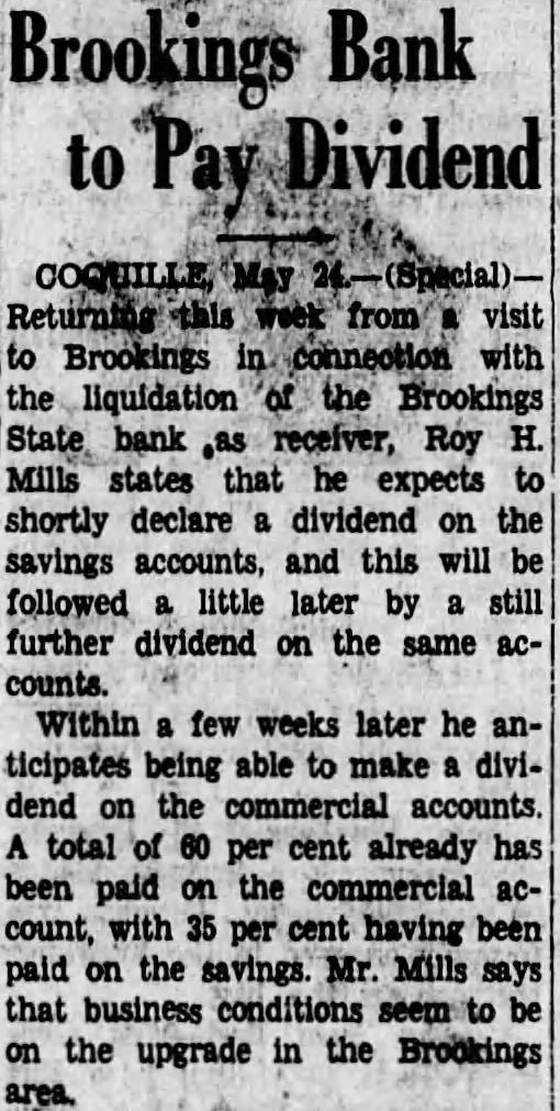Bank Brookings Dividend to May Returning week from visit Brookings connection with the liquidation the Brookings State bank receiver, Roy H. Mills states that he expects shortly declare dividend on the savings accounts, and this will be followed little later by still further dividend on the same counts. Within few weeks later he anticipates being able to make dividend on the commercial accounts. A total 60 per cent already has been paid on the commercial account, with 35 per cent having been paid on the savings. Mr. Mills says that business conditions seem to be on the upgrade in the Brookings