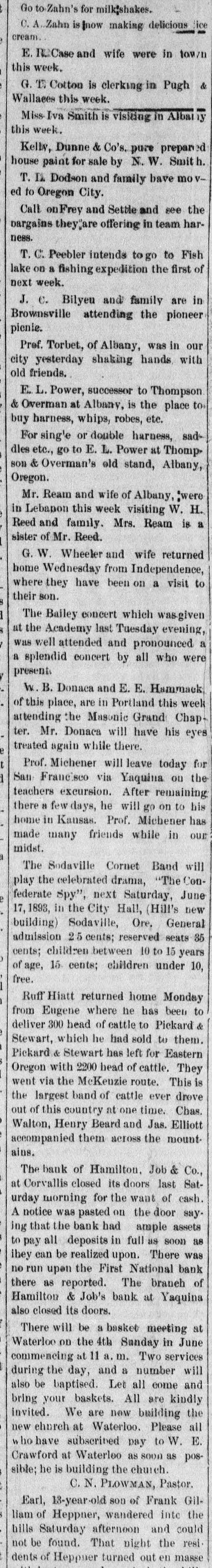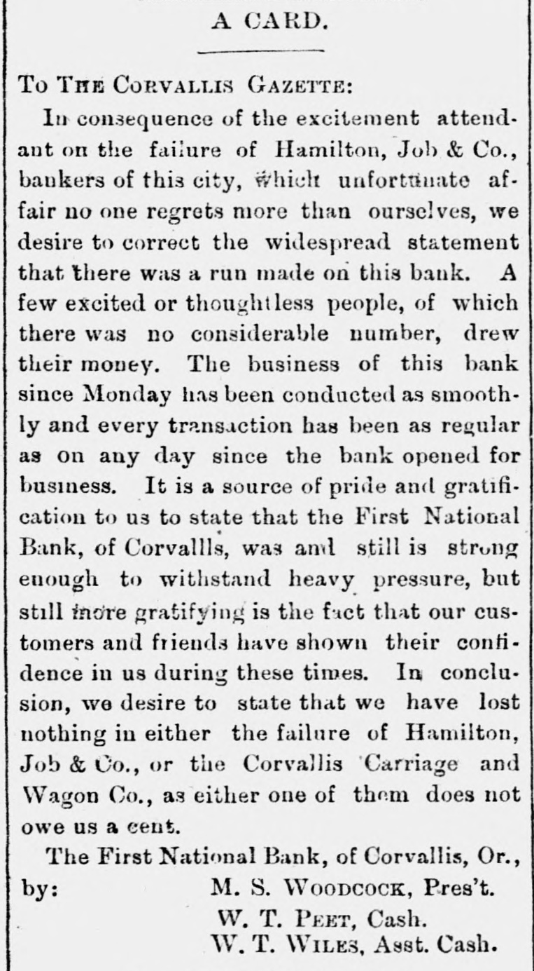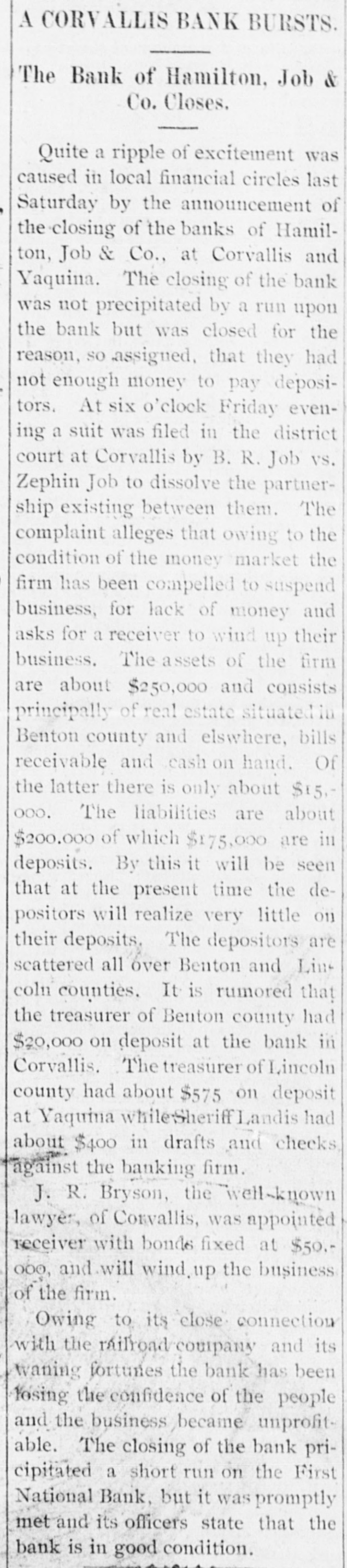 A CORVALLIS BANK BURSTS. The Bank of Hamilton, Job & Co. Closes. Quite a ripple of excitement was caused in local financial circles last Saturday by the announcement of the closing of the banks of Hamilton, Job & Co., at Corvallis and Yaquina. The closing of the bank was not precipitated by a run upon the bank but was closed for the reason, SO assigned, that they had not enough money to pay depositors. At six o'clock Friday evening a suit was filed in the district court at Corvallis by B. R. Job VS. Zephin Job to dissolve the partnership existing between them. The complaint alleges that owing to the condition of the money market the firm has been compelled to suspend business, for lack of money and asks for a receiver to wind up their business. The assets of the firm are about $250,000 and consists principally of real estate situate.III Benton county and elswhere, bills receivable and cash on hand. Of the latter there is only about $15, 000. The liabilities are about $200,000 of which $175,000 are in deposits. By this it will be seen that at the present time the depositors will realize very little on their deposits, The depositors are scattered all over Benton and Line coln counties, It is rumored that the treasurer of Benton county had $20,000 on deposit at the bank in Corvallis. The treasurer of Lincoln county had about $575 on deposit at Yaquina while Sheriff Landis had about $400 in drafts and checks against the banking firm. J. R. Bryson, the "well-known lawyer, of Convallis, was appointed receiver with bonds fixed at $50.OOO, and will wind, up the business of the firm. Owing to its close connection with the ráilroad company and its waning fortunes the bank has been losing the confidence of the people and the business became unprofitable. The closing of the bank pricipitated a short run on the First National Bank, but it was promptly met and its officers state that the bank is in good condition.