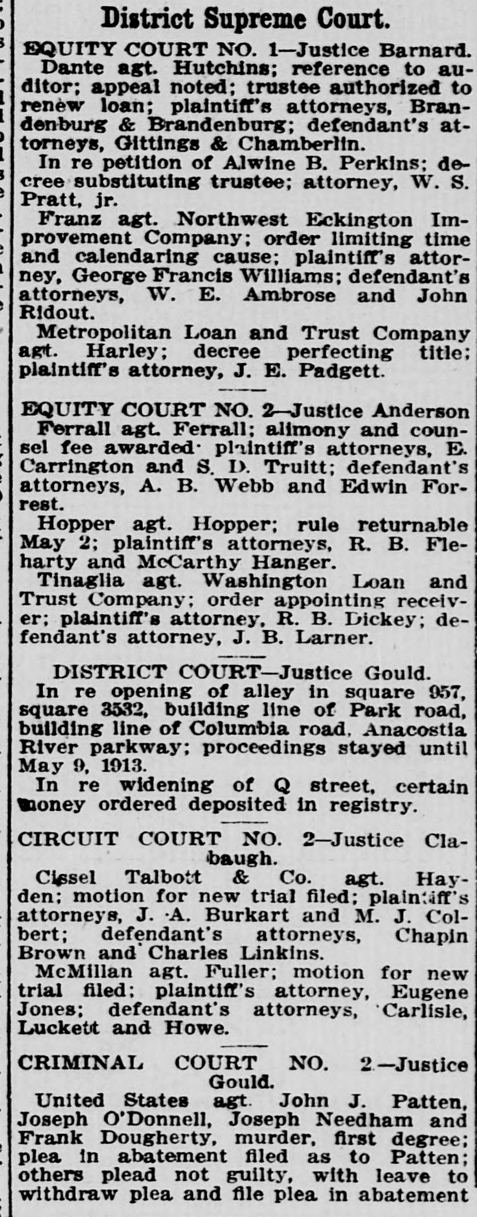District Supreme Court. EQUITY COURT NO. 1-Justice Barnard. Dante agt. Hutchins; reference to auditor; appeal noted; trustee authorized to renèw loan; plaintiff's attorneys, Brandenburg & Brandenburg; defendant's attorneys, Gittings & Chamberlin. In re petition of Alwine B. Perkins; decree substituting trustee; attorney, W. S. Pratt, jr. Franz agt. Northwest Eckington Improvement Company; order limiting time and calendaring cause; plaintiff's attorney, George Francis Williams; defendant's attorneys, W. E. Ambrose and John Ridout. Metropolitan Loan and Trust Company agt. Harley; decree perfecting title: plaintiff's attorney, J. E. Padgett. EQUITY COURT NO. 2-Justice Anderson Ferrall agt. Ferrall: alimony and counsel fee awarded plaintiff's attorneys, E. Carrington and S. D. Truitt; defendant's attorneys, A. B. Webb and Edwin Forrest. Hopper agt. Hopper; rule returnable May 2; plaintiff's attorneys, R. B. Fleharty and McCarthy Hanger. Tinaglia agt. Washington Loan and Trust Company: order appointing receiver; plaintiff's attorney, R. B. Dickey; defendant's attorney, J. B. Larner. DISTRICT COURT-Justice Gould. In re opening of alley in square 957, square 3532, building line of Park road, building line of Columbia road, Anacostia River parkway; proceedings stayed until May 9, 1913. In re widening of Q street, certain money ordered deposited in registry. CIRCUIT COURT NO. 2-Justice Clabaugh. Cissel Talbott & Co. agt. Hayden: motion for new trial filed; plaintiff's attorneys, J. A. Burkart and M. J. Colbert; defendant's attorneys, Chapin Brown and Charles Linkins. McMillan agt. Fuller; motion for new trial filed: plaintiff's attorney, Eugene Jones; defendant's attorneys, Carlisle, Luckett and Howe. CRIMINAL COURT NO. 2-Justice Gould. United States agt. John J. Patten, Joseph O'Donnell, Joseph Needham and Frank Dougherty, murder, first degree; plea in abatement filed as to Patten; others plead not guilty, with leave to withdraw plea and file plea in abatement