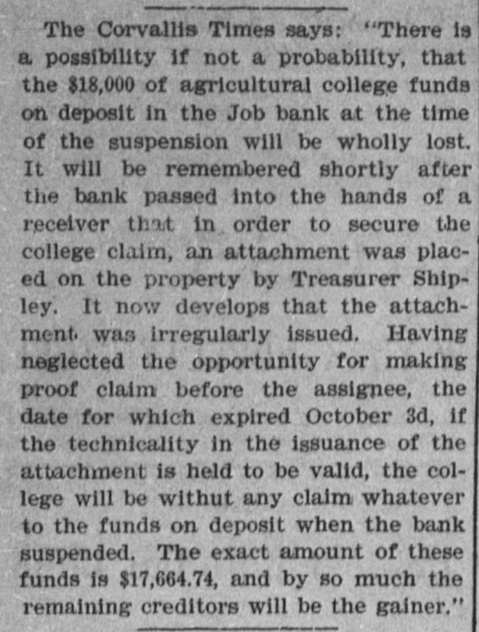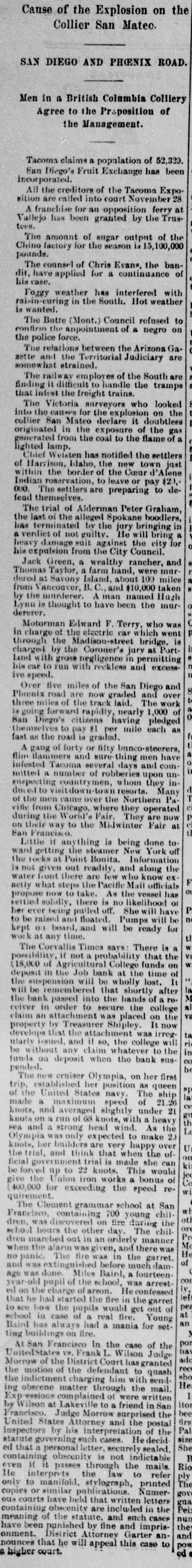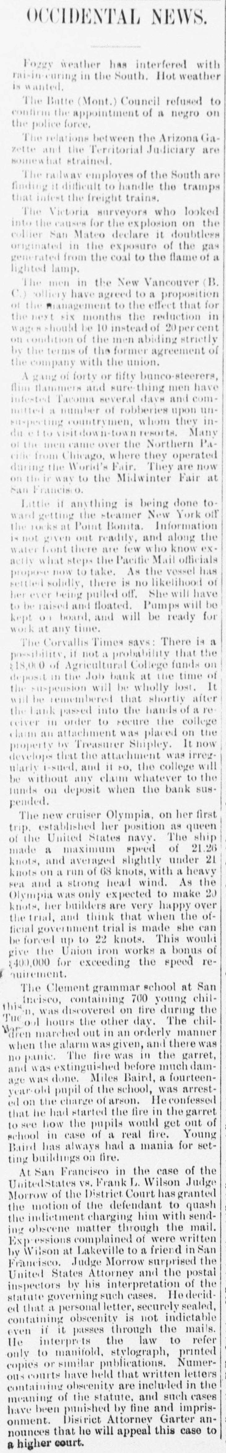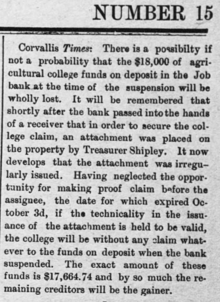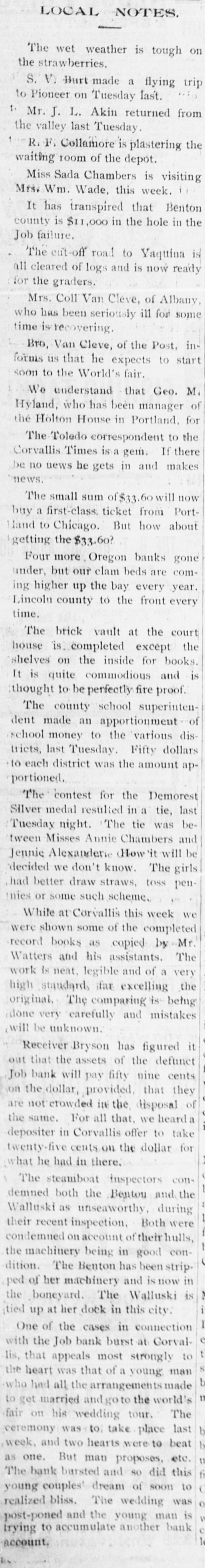 The wet weather is tough on the strawberries. S. V. Burt made a flying trip to Pioneer on Tuesday last. 1. Mr. J. L. Akin returned from the valley last Tuesday. R. F. Collamore is plastering the waiting room of the depot. Miss Sada Chambers is visiting Mrs. Wm. Wade, this week. It has transpired that Benton county is $11,000 in the hole in the Job failure. The cut-off road to Yaquina all cleared of logs and is now ready for the graders. Mrs. Coll Van Cleve, of Albany, who has been seriously ill for some time is recovering Bro, Van Cleve, of the Post, informs us that he expects to start soon to the World's fair. We understand that Geo. M. Hyland, who has been manager for of the Holton House in Portland, The Toledo correspondent to the Corvallis Times is a gem. If there be no news he gets in and makes 'news. The small sum of$33.60 will now buy a first-class ticket from PortHand to Chicago. But how about getting the $33.60? Four more Oregon banks gone under, but our clam beds are coming higher up the bay every year. Lincoln county to the front every time. The brick vault at the court the house is completed except shelves on the inside for books. is It is quite commodious and ;thought to be perfectly fire proof. The county school superinten- of dent made an apportionment disschool money to the various tricts, last Tuesday. Fifty dollars to each district was the amount apportioned. The contest for the Demorest last Silver medal resulted in a tie, beTuesday night. The tie was tween Misses Annie Chambers and be Jennie Alexanderie (How 'it will girls decided we don't know. The had better draw straws, toss pennies or some such scheme. White at Corvallis this week we were shown some of the completed Mr. record books as copied by The Watters and his assistants. work is neat. legible and of a very the high standards ;far excelling original. The comparing is being done very carefully and mistakes will be unknown. Receiver Bryson has figured out that the assets of the defunct cents Job bank will pay fifty nine they on the dollar, provided that of not crowded in the disposal heard are For all that, we in Corvallis offer depositer the same. dollar to take for twenty-five cents on the what he had in there. The steamboat inspectors con- the demned both the Bentou and Walluski as unseaworthy, during were their recent inspection. Both on account of machinery being in the condemned good their been hulls, strip- condition. The Benton has now ped of her machinery and Walluski is the boneyard. The city. {tied up at liet dock in this One of the cases in connection Corvalwith the Job bank burst at to lis, that appeals most strongly man the heart was that of a young made who had all the arrangements world's to get married and go to the The fair on his wedding tour. ceremony was to take place beat last week, and two hearts were to etc. one. But man proposes, this as The bank bursted and so to couples' dream was young wedding of did soon bliss. The is realized and the young man bank account. trying post-poned to accumulate another