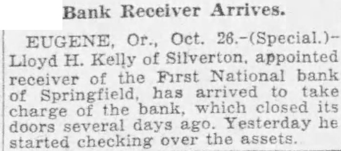 Bank Receiver Arrives. EUGENE, Or., Oct. 26.-(Special.) Lloyd H. Kelly of Silverton. appointed receiver of the First National bank of has arrived to take charge of the bank, which closed its doors several days ago. Yesterday he started checking over the assets.
