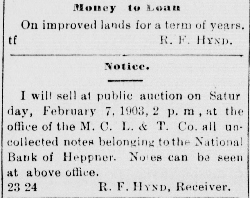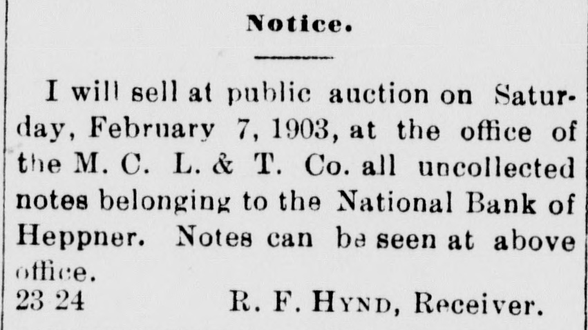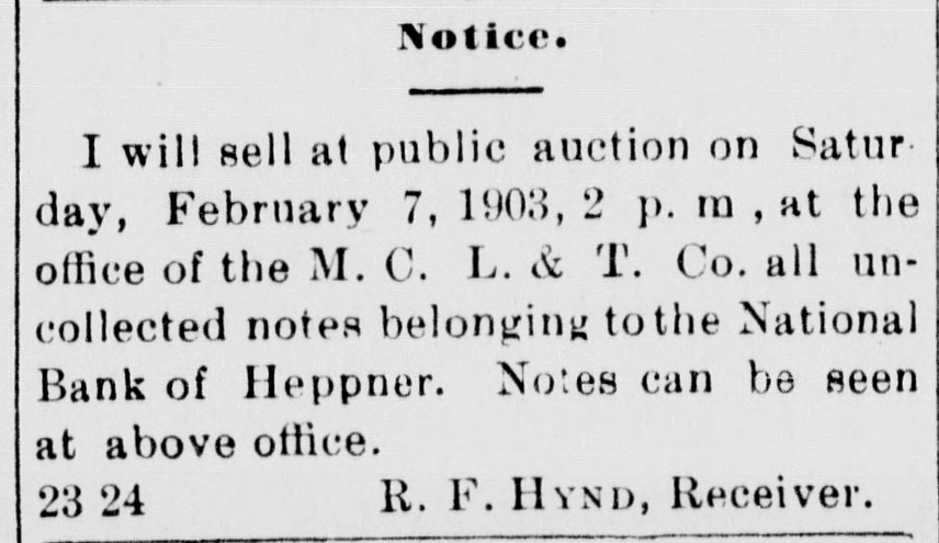 Notice. I will sell at public auction on Saturday, February 7, 1903, at the office of the M. C. L. & T. Co. all uncollected notes belonging to the National Bank of Heppner. Notes can be seen at above office. 23-24 R. F. HYND, Receiver.