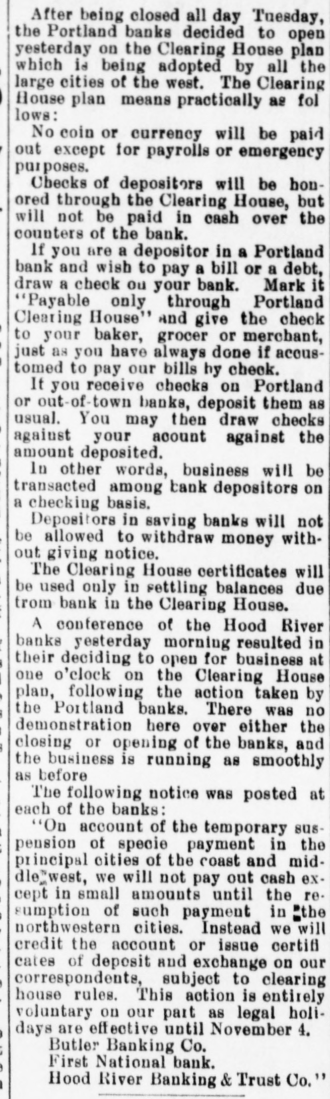 After being closed all day Tuesday, the Portland banks decided to open yesterday on the Clearing House plan which is being adopted by all the large cities of the west. The Clearing House plan means practically as fol lows: No coin or currency will be paid out except for payrolls or emergency purposes. Checks of depositors will be honored through the Clearing House, but will not be paid in cash over the counters of the bank. If you are a depositor in a Portland bank and wish to pay a bill or a debt, draw a check ou your bank. Mark it "Payable only through Portland Clearing House" and give the check to your baker, grocer or merchant, just as you have always done if accustomed to pay our bills by check. It you receive checks on Portland or out-of-town banks, deposit them as usual. You may then draw checks against your acount against the amount deposited. In other words, business will be transacted among bank depositors on a checking basis. Depositors in saving banks will not be allowed to withdraw money without giving notice. The Clearing House certificates will be used only in settling balances due from bank in the Clearing House. A conference of the Hood River banks yesterday morning resulted in their deciding to open for business at one o'clock on the Clearing House plan, following the action taken by the Portland banks. There was no demonstration here over either the closing or opening of the banks, and the business is running as smoothly as before The following notice was posted at each of the banks: "On account of the temporary suspension of specie payment in the principal cities of the coast and middle west, we will not pay out cash except in small amounts until the resumption of such payment in "the northwestern cities. Instead we will credit the account or issue certifi cates of deposit and exchange on our correspondents, subject to clearing house rules. This action is entirely voluntary on our part as legal holidays are effective until November 4. Butler Banking Co. First National bank. Hood River Banking & Trust Co. "