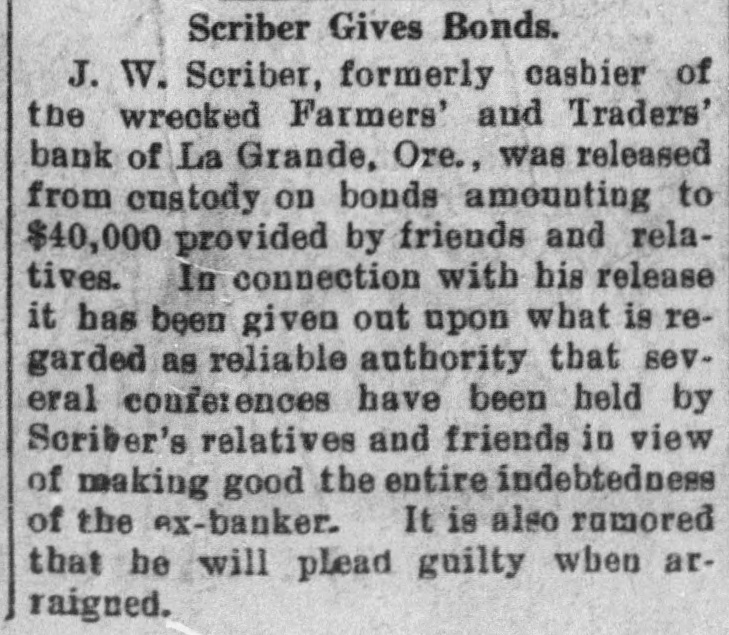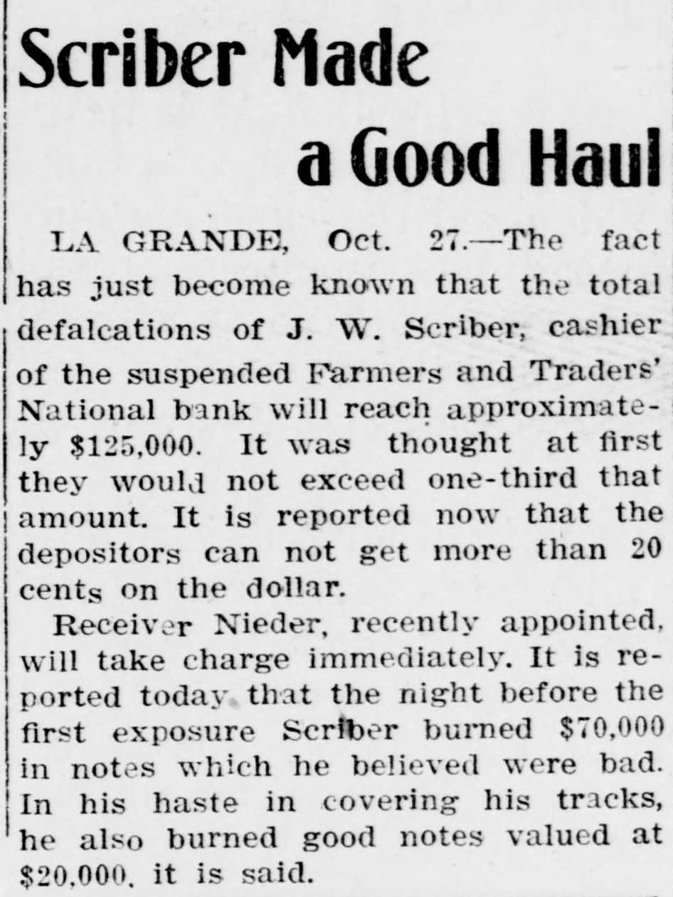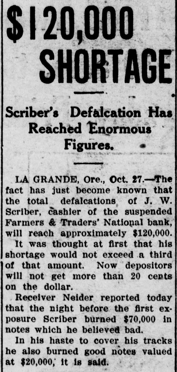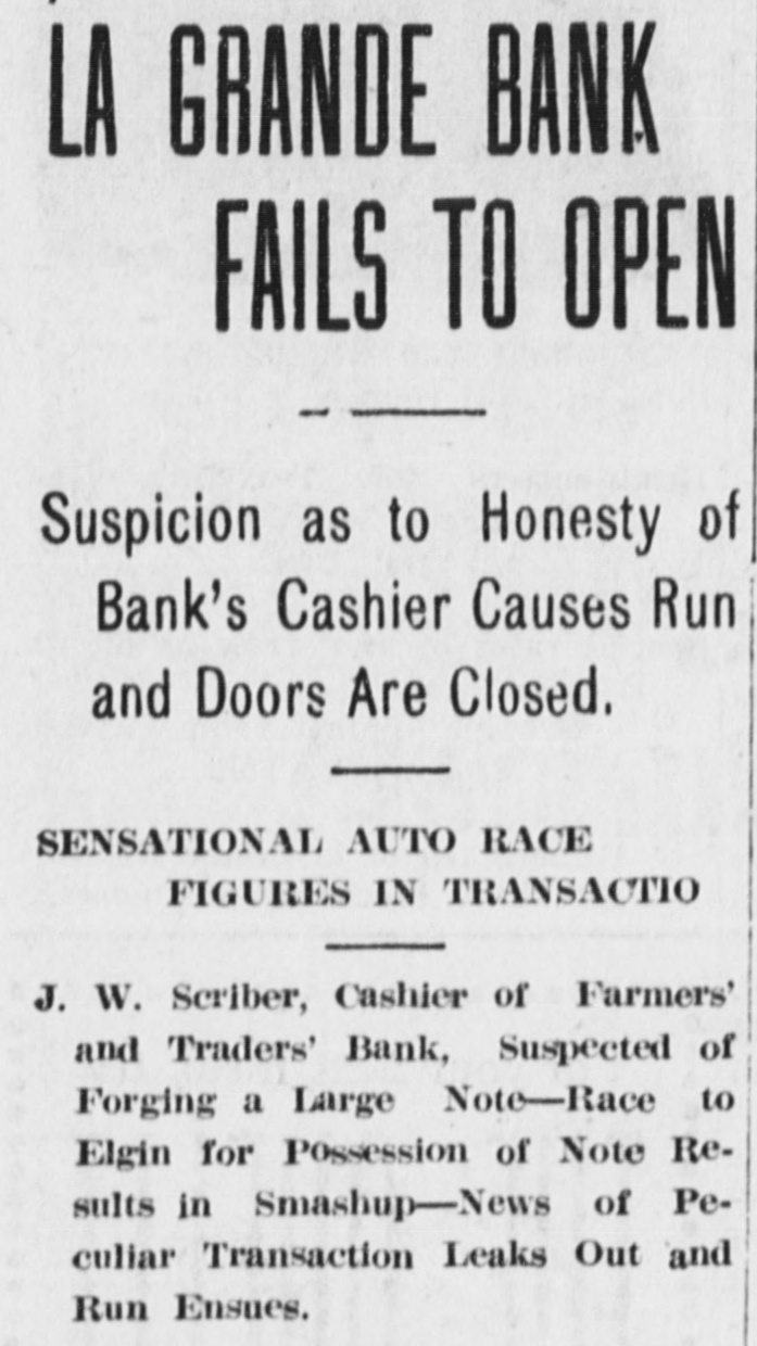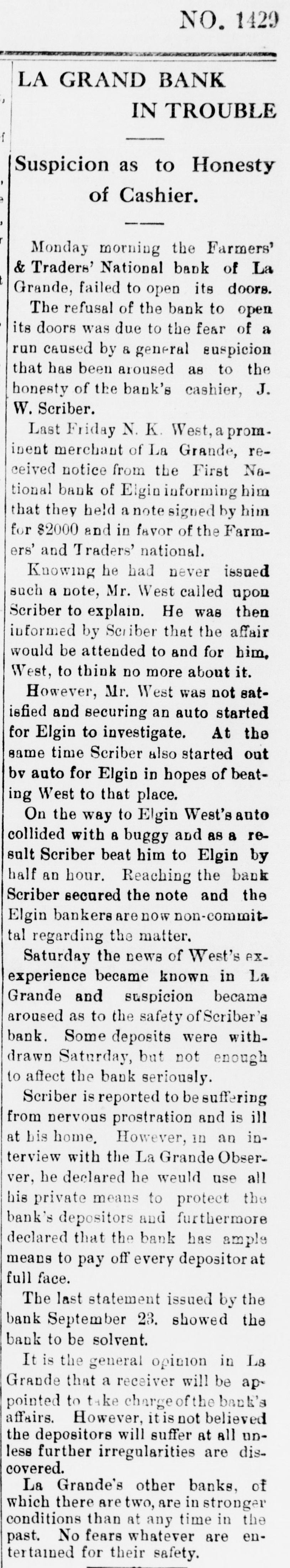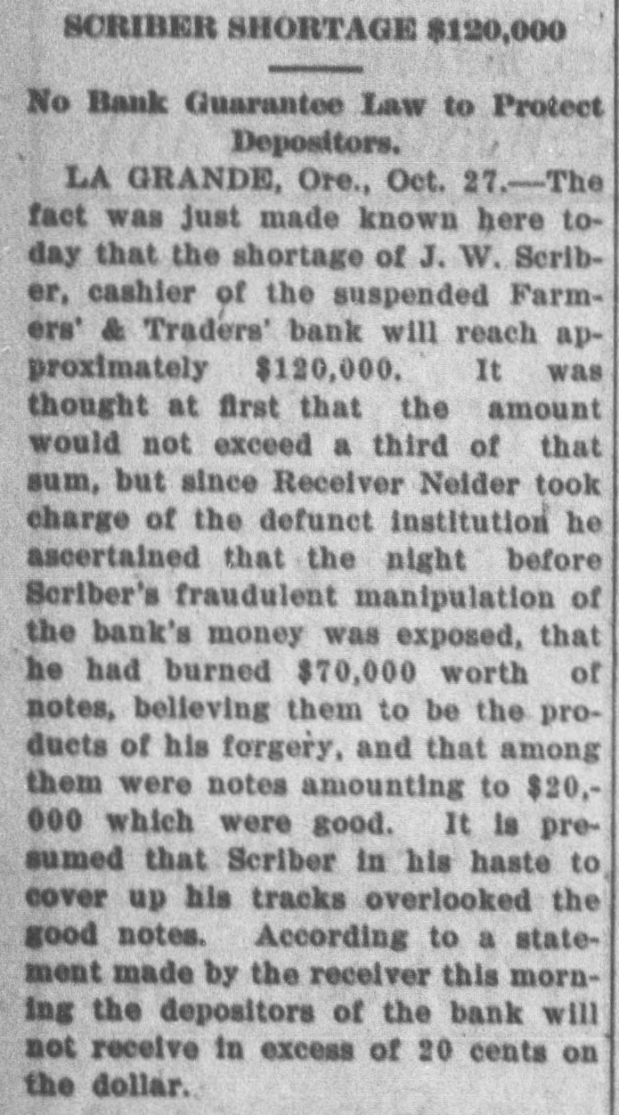 La Grande, Ore., Oct. 12.-(Special.)-This morning the Farmers' & Traders' National bank of this city failed to open its doors and a bank examiner will be here tomorrow to inquire into the condition of its affairs. The refusal of the bank to open its doors this morning was due to the fear of a run caused by a general suspicion that has been aroused as to the honesty of the bank's cashier, J. W. Scriber. Forgery Is Suspected. Last Friday N. K. West, a prominent merchant of this city, received notice from the First National bank at Elgin informing him that they held a note "signed by him for $2000 and in favor of the Farmers' & Traders' national. Knowing he had never issued such a note, Mr. West called upon Scriber to explain. He was then informed by Scriber that the affair would be attended to and for him, West, to think no more about it. Auto Race to Elgin. However, Mr. West was not satisfied and securing an auto started for Elgin to investigate. At the same time Scriber also started out by auto for Elgin in hopes of beating West to that place. On the way to Elgin West's auto collided with a buggy and as a result Scriber beat him to Elgin by half an hour. Reaching the bank Scriber secured the note and the Elgin bankers are now non-committal regarding the matter. Suspicion Causes Run. Saturday the news of West's experience became known in La Grande and suspicion became aroused as to the safety of Scriber's bank. Some deposits were withdrawn Saturday, but not enough to affect the bank seriously. However, it was feared a run would occur today and in consequence Scriber ordered the bank closed today. Today Scriber is reported to be suffering from nervous prostration and is ill at his home. However, in an interview with the La Grande Observer, he declared he would use all his private means to protect the bank's depositors and furthermore declared that the bank has ample means to pay off every depositor at full face. Bank Is Solvent. The last statement issued by the bank September 23, showed the bank to be solvent. At that time the deposits amounted to $190,000 and the notes and securities to $161,000. Cash amounting to $50,000 was then on hand or available. It is the general opinion in La Grande that a reciver will be appointed to take charge of the bank's V affairs. However, it is not believed the depositors will suffer at all undess further irregularities are discovered. La Grande's other banks, of which there are two, are in stronger condiG tions than at any time in the past. No fears whatever are entertained d for their safety. h