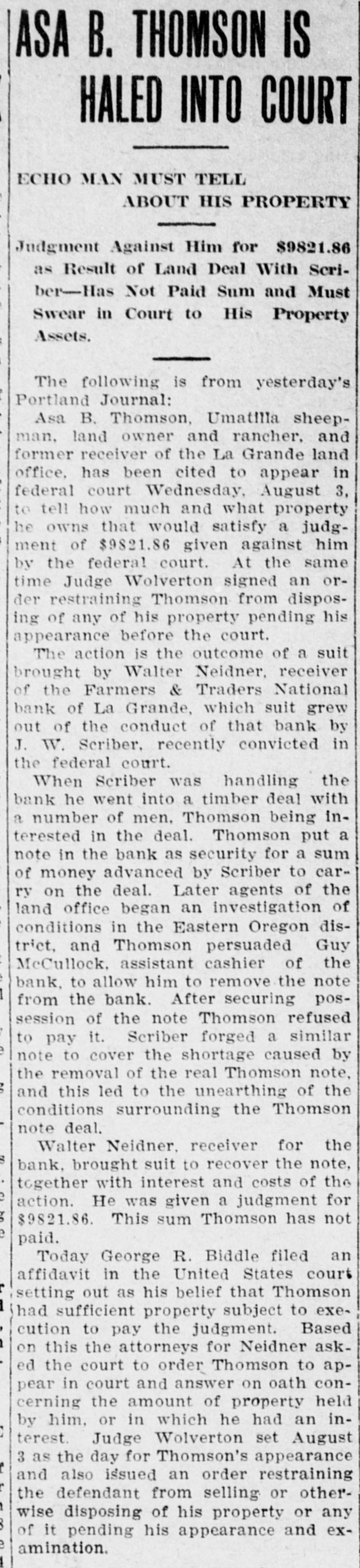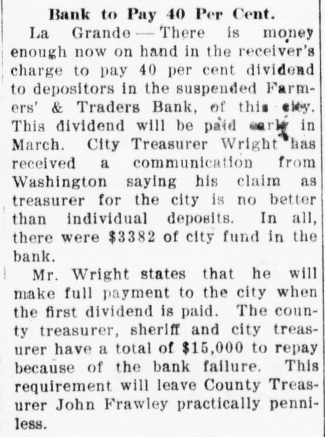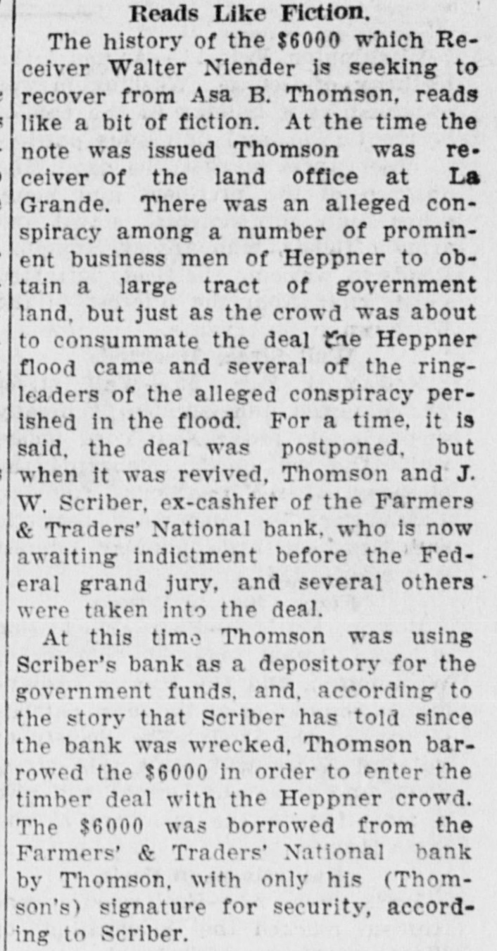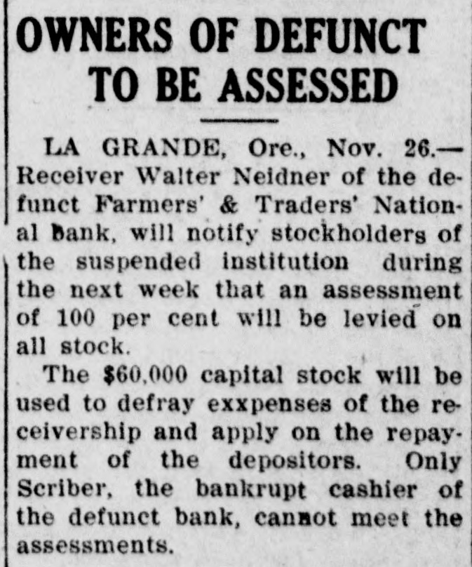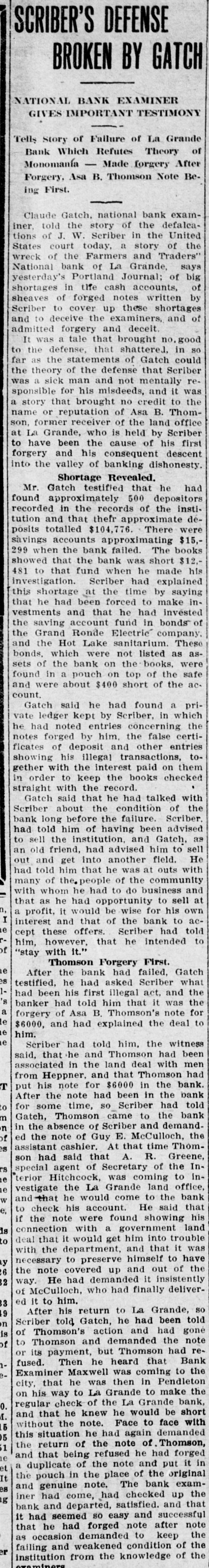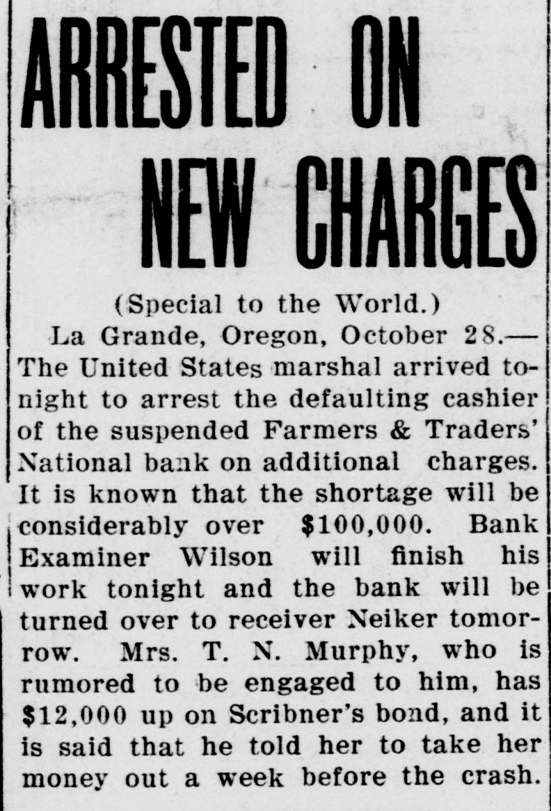 La Grande, Ore., Oct. 12.-(Special.)-This morning the Farmers' & Traders' National bank of this city failed to open its doors and a bank examiner will be here tomorrow to inquire into the condition of its affairs. The refusal of the bank to open its doors this morning was due to the fear of a run caused by a general suspicion that has been aroused as to the honesty of the bank's cashier, J. W. Scriber. Forgery Is Suspected. Last Friday N. K. West, a prominent merchant of this city, received notice from the First National bank at Elgin informing him that they held a note "signed by him for $2000 and in favor of the Farmers' & Traders' national. Knowing he had never issued such a note, Mr. West called upon Scriber to explain. He was then informed by Scriber that the affair would be attended to and for him, West, to think no more about it. Auto Race to Elgin. However, Mr. West was not satisfied and securing an auto started for Elgin to investigate. At the same time Scriber also started out by auto for Elgin in hopes of beating West to that place. On the way to Elgin West's auto collided with a buggy and as a result Scriber beat him to Elgin by half an hour. Reaching the bank Scriber secured the note and the Elgin bankers are now non-committal regarding the matter. Suspicion Causes Run. Saturday the news of West's experience became known in La Grande and suspicion became aroused as to the safety of Scriber's bank. Some deposits were withdrawn Saturday, but not enough to affect the bank seriously. However, it was feared a run would occur today and in consequence Scriber ordered the bank closed today. Today Scriber is reported to be suffering from nervous prostration and is ill at his home. However, in an interview with the La Grande Observer, he declared he would use all his private means to protect the bank's depositors and furthermore declared that the bank has ample means to pay off every depositor at full face. Bank Is Solvent. The last statement issued by the bank September 23, showed the bank to be solvent. At that time the deposits amounted to $190,000 and the notes and securities to $161,000. Cash amounting to $50,000 was then on hand or available. It is the general opinion in La Grande that a reciver will be appointed to take charge of the bank's V affairs. However, it is not believed the depositors will suffer at all undess further irregularities are discovered. La Grande's other banks, of which there are two, are in stronger condiG tions than at any time in the past. No fears whatever are entertained d for their safety. h