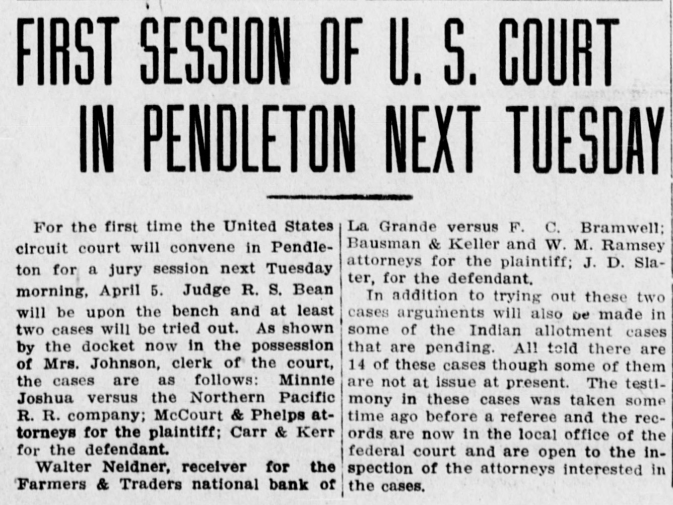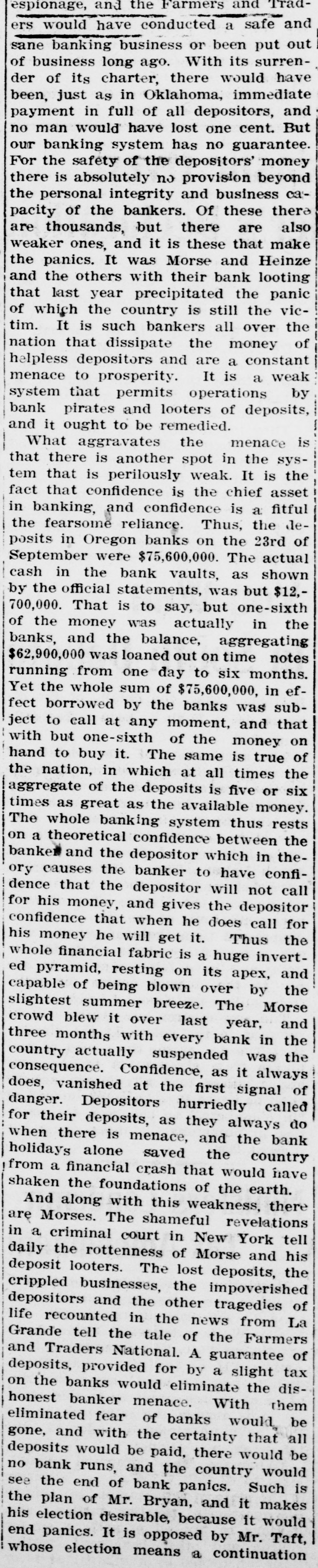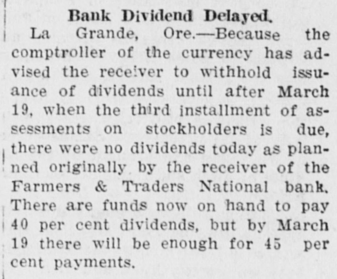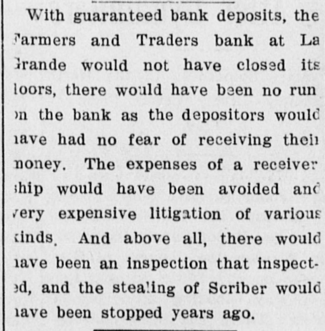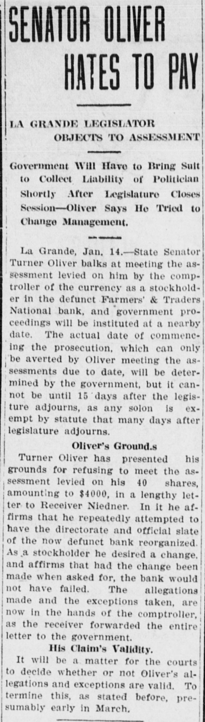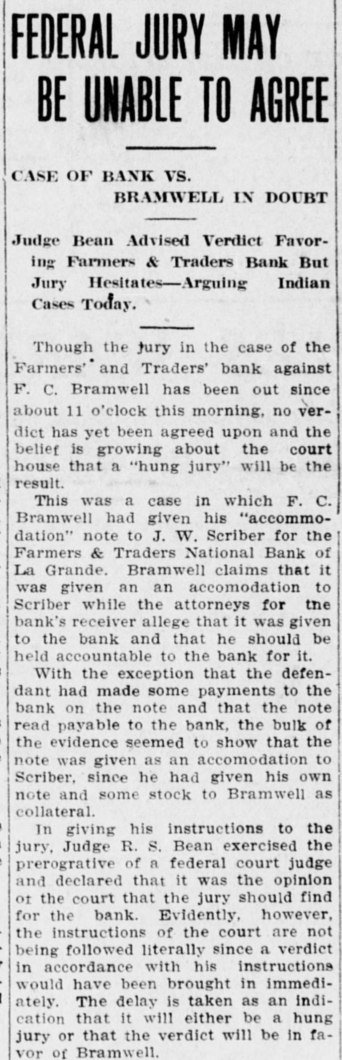 La Grande, Ore., Oct. 12.-(Special.)-This morning the Farmers' & Traders' National bank of this city failed to open its doors and a bank examiner will be here tomorrow to inquire into the condition of its affairs. The refusal of the bank to open its doors this morning was due to the fear of a run caused by a general suspicion that has been aroused as to the honesty of the bank's cashier, J. W. Scriber. Forgery Is Suspected. Last Friday N. K. West, a prominent merchant of this city, received notice from the First National bank at Elgin informing him that they held a note "signed by him for $2000 and in favor of the Farmers' & Traders' national. Knowing he had never issued such a note, Mr. West called upon Scriber to explain. He was then informed by Scriber that the affair would be attended to and for him, West, to think no more about it. Auto Race to Elgin. However, Mr. West was not satisfied and securing an auto started for Elgin to investigate. At the same time Scriber also started out by auto for Elgin in hopes of beating West to that place. On the way to Elgin West's auto collided with a buggy and as a result Scriber beat him to Elgin by half an hour. Reaching the bank Scriber secured the note and the Elgin bankers are now non-committal regarding the matter. Suspicion Causes Run. Saturday the news of West's experience became known in La Grande and suspicion became aroused as to the safety of Scriber's bank. Some deposits were withdrawn Saturday, but not enough to affect the bank seriously. However, it was feared a run would occur today and in consequence Scriber ordered the bank closed today. Today Scriber is reported to be suffering from nervous prostration and is ill at his home. However, in an interview with the La Grande Observer, he declared he would use all his private means to protect the bank's depositors and furthermore declared that the bank has ample means to pay off every depositor at full face. Bank Is Solvent. The last statement issued by the bank September 23, showed the bank to be solvent. At that time the deposits amounted to $190,000 and the notes and securities to $161,000. Cash amounting to $50,000 was then on hand or available. It is the general opinion in La Grande that a reciver will be appointed to take charge of the bank's V affairs. However, it is not believed the depositors will suffer at all undess further irregularities are discovered. La Grande's other banks, of which there are two, are in stronger condiG tions than at any time in the past. No fears whatever are entertained d for their safety. h