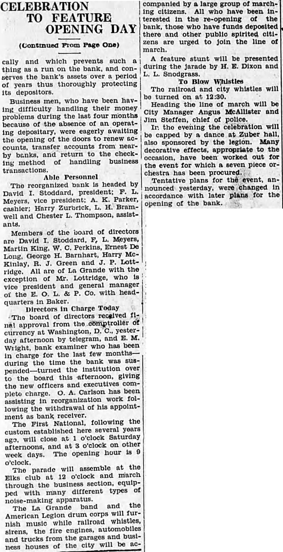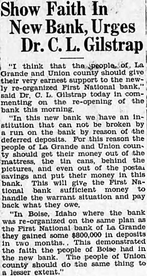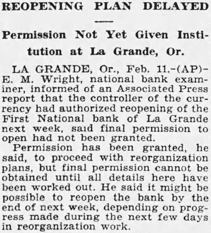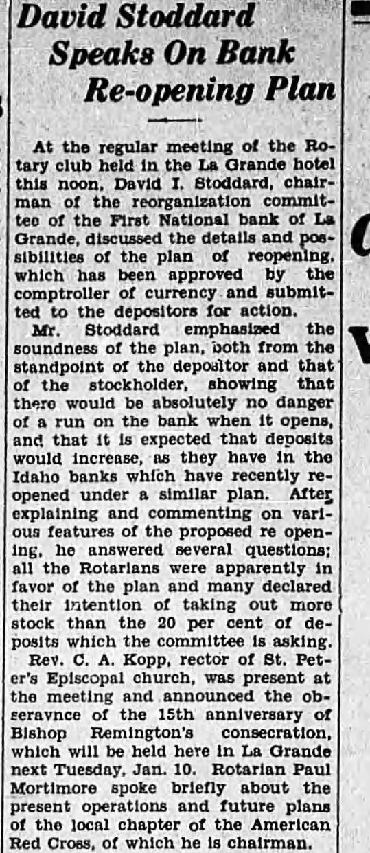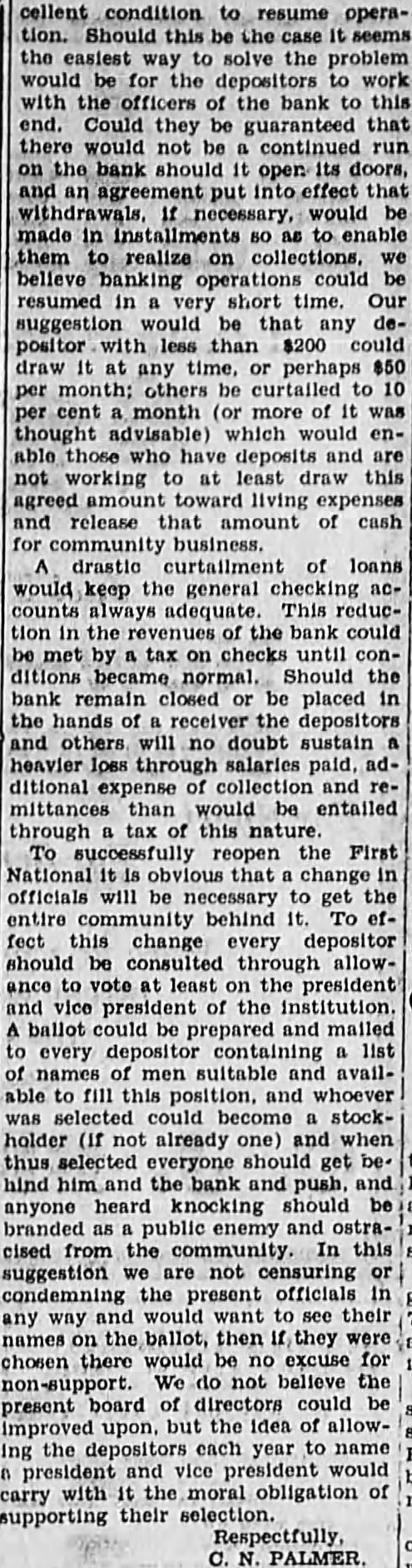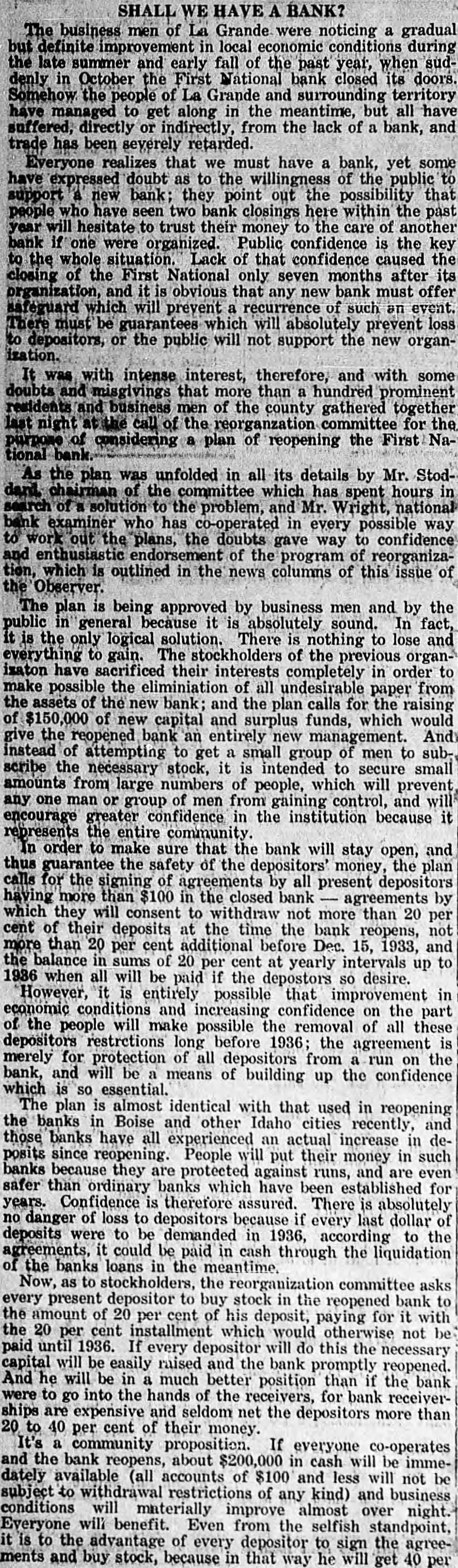 SHALL WE HAVE BANK? The business men of La Grande were noticing a gradual definite improvement in local economic conditions during the late summer and early fall of the past year, when suddenly in October the First National bank closed its doors. Somehow the people of La Grande and surrounding territory have managed to get along in the meantime, but all have suffered, directly or indirectly, from the lack of a bank, and trade has been severely retarded. Everyone realizes that we must have bank, yet some have expressed doubt as to the willingness of the public to support bank; they point out the possibility that people who have seen two bank closings here within the past year will hesitate to trust their money to the care of another bank were organized. Public confidence is the key to the whole situation. Lack of that confidence caused the closing of the First National only seven months after its organization, and it is obvious that any new bank must offer safeguard which will prevent recurrence of such an event. There must be guarantees which will absolutely prevent loss depositors, or the public will not support the new organwas with intense interest, therefore, and with some doubts and misglvings that more than a hundred prominent residents and business men of the county gathered together last of the reorganzation committee for the of considering plan of reopening the tional As the plan was unfolded in all its details by Mr. chairman of the committee which has spent hours in of solution to the problem, and Wright, examiner who has co-operated in every possible way work the plans, the doubts to confidence gave way and endorsement of the program of reorganization, which outlined in the news columns of this issue of the Observer. The plan being approved by business men and by the public general because it is absolutely sound. In fact, is the only logical solution. There is nothing to lose and gain. The stockholders of the previous isaton have sacrificed their interests completely in order to make possible the eliminiation of all undesirable paper from the assets of the new bank; and the plan calls for the raising of $150,000 of new capital and surplus funds, which would give the reopened bank an entirely new management. instead of attempting to get small group of men to scribe the necessary stock, it intended to secure small amounts from large numbers of people, which will prevent any one man or group of men from gaining control, and will encourage greater confidence in the institution because represents entire community. order to make sure that the bank will stay open, and thus guarantee the safety of the depositors' money, the plan for the signing of agreements by all present depositors having more than $100 in the closed bank agreements by which they will consent to withdraw not 20 more than per cent of their deposits at the time the bank reopens, not more than 20 per cent additional before Dec. 15, 1933, and the balance sums of 20 per cent at yearly intervals up to when all will be if the paid depostors desire. However, is entirely that possible improvement in economic conditions and increasing confidence on the part of the people will make possible the removal of all these depositors restrctions long before 1936; the agreement is merely for protection of all depositors from run the bank, and will be means of building up the confidence which so essential. The plan is almost identical with that used in reopening the banks Boise and other Idaho cities recently, and those banks have all experienced actual an increase in deposits since reopening. People will put their money in such banks because they are protected against runs, and are even safer than ordinary banks which have been established for years. Confidence is therefore assured. There is absolutely no danger of loss to depositors because if every last dollar of deposits were to be demanded in 1936, according to the agreements, it could be paid in cash through the liquidation the banks loans in the Now, as to stockholders, the reorganization committee asks every present depositor to buy stock in the reopened bank to the amount of 20 per cent of his deposit, paying for it with the 20 per cent installment which would otherwise not paid until 1936. If depositor will do this every the necessary capital will be easily raised and the bank promptly reopened. And he will be in a much better position than if the bank were to into the hands of the go receivers, for bank receiverships are expensive and seldom net the depositors more than to 40 per cent of their money. It's If community proposition. everyone co-operates and the bank reopens, about $200,000 in cash will be immedately available (all accounts of $100 and less will not be subject to withdrawal restrictions of any kind) and business conditions will materially improve almost over night. Everyone will benefit. Even from the selfish standpoint, it is to the advantage of every depositor to sign the ments and buy stock, because in that way he will get 40