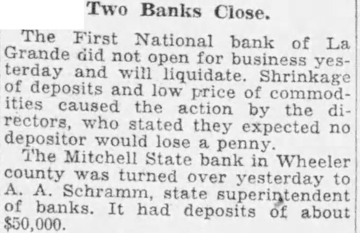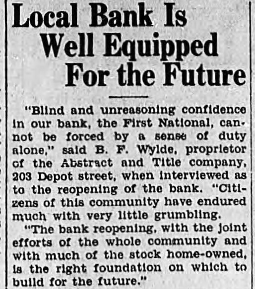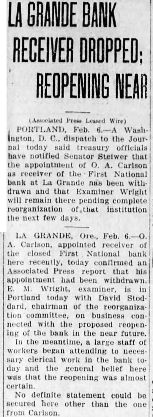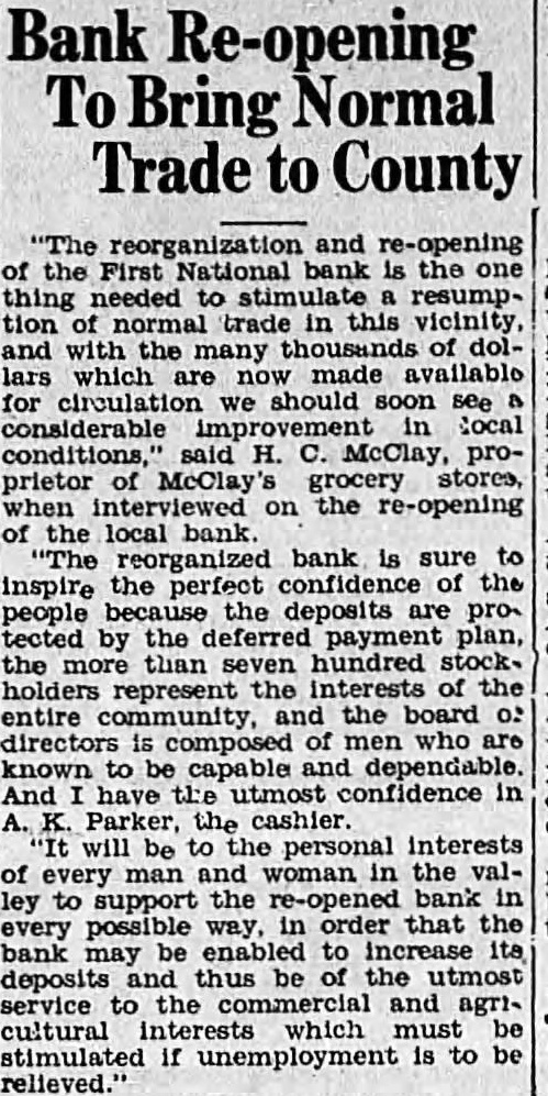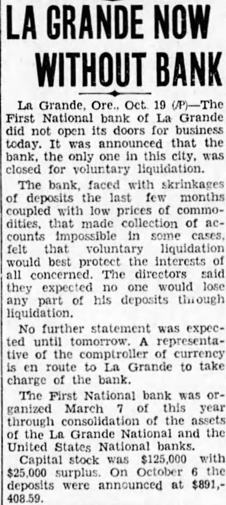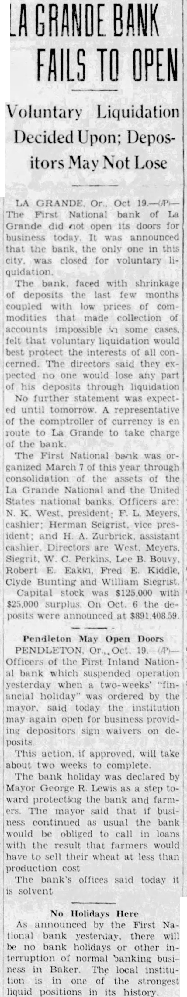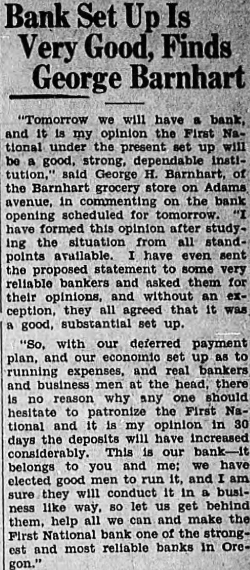 SHALL WE HAVE BANK? The business men of La Grande were noticing a gradual definite improvement in local economic conditions during the late summer and early fall of the past year, when suddenly in October the First National bank closed its doors. Somehow the people of La Grande and surrounding territory have managed to get along in the meantime, but all have suffered, directly or indirectly, from the lack of a bank, and trade has been severely retarded. Everyone realizes that we must have bank, yet some have expressed doubt as to the willingness of the public to support bank; they point out the possibility that people who have seen two bank closings here within the past year will hesitate to trust their money to the care of another bank were organized. Public confidence is the key to the whole situation. Lack of that confidence caused the closing of the First National only seven months after its organization, and it is obvious that any new bank must offer safeguard which will prevent recurrence of such an event. There must be guarantees which will absolutely prevent loss depositors, or the public will not support the new organwas with intense interest, therefore, and with some doubts and misglvings that more than a hundred prominent residents and business men of the county gathered together last of the reorganzation committee for the of considering plan of reopening the tional As the plan was unfolded in all its details by Mr. chairman of the committee which has spent hours in of solution to the problem, and Wright, examiner who has co-operated in every possible way work the plans, the doubts to confidence gave way and endorsement of the program of reorganization, which outlined in the news columns of this issue of the Observer. The plan being approved by business men and by the public general because it is absolutely sound. In fact, is the only logical solution. There is nothing to lose and gain. The stockholders of the previous isaton have sacrificed their interests completely in order to make possible the eliminiation of all undesirable paper from the assets of the new bank; and the plan calls for the raising of $150,000 of new capital and surplus funds, which would give the reopened bank an entirely new management. instead of attempting to get small group of men to scribe the necessary stock, it intended to secure small amounts from large numbers of people, which will prevent any one man or group of men from gaining control, and will encourage greater confidence in the institution because represents entire community. order to make sure that the bank will stay open, and thus guarantee the safety of the depositors' money, the plan for the signing of agreements by all present depositors having more than $100 in the closed bank agreements by which they will consent to withdraw not 20 more than per cent of their deposits at the time the bank reopens, not more than 20 per cent additional before Dec. 15, 1933, and the balance sums of 20 per cent at yearly intervals up to when all will be if the paid depostors desire. However, is entirely that possible improvement in economic conditions and increasing confidence on the part of the people will make possible the removal of all these depositors restrctions long before 1936; the agreement is merely for protection of all depositors from run the bank, and will be means of building up the confidence which so essential. The plan is almost identical with that used in reopening the banks Boise and other Idaho cities recently, and those banks have all experienced actual an increase in deposits since reopening. People will put their money in such banks because they are protected against runs, and are even safer than ordinary banks which have been established for years. Confidence is therefore assured. There is absolutely no danger of loss to depositors because if every last dollar of deposits were to be demanded in 1936, according to the agreements, it could be paid in cash through the liquidation the banks loans in the Now, as to stockholders, the reorganization committee asks every present depositor to buy stock in the reopened bank to the amount of 20 per cent of his deposit, paying for it with the 20 per cent installment which would otherwise not paid until 1936. If depositor will do this every the necessary capital will be easily raised and the bank promptly reopened. And he will be in a much better position than if the bank were to into the hands of the go receivers, for bank receiverships are expensive and seldom net the depositors more than to 40 per cent of their money. It's If community proposition. everyone co-operates and the bank reopens, about $200,000 in cash will be immedately available (all accounts of $100 and less will not be subject to withdrawal restrictions of any kind) and business conditions will materially improve almost over night. Everyone will benefit. Even from the selfish standpoint, it is to the advantage of every depositor to sign the ments and buy stock, because in that way he will get 40