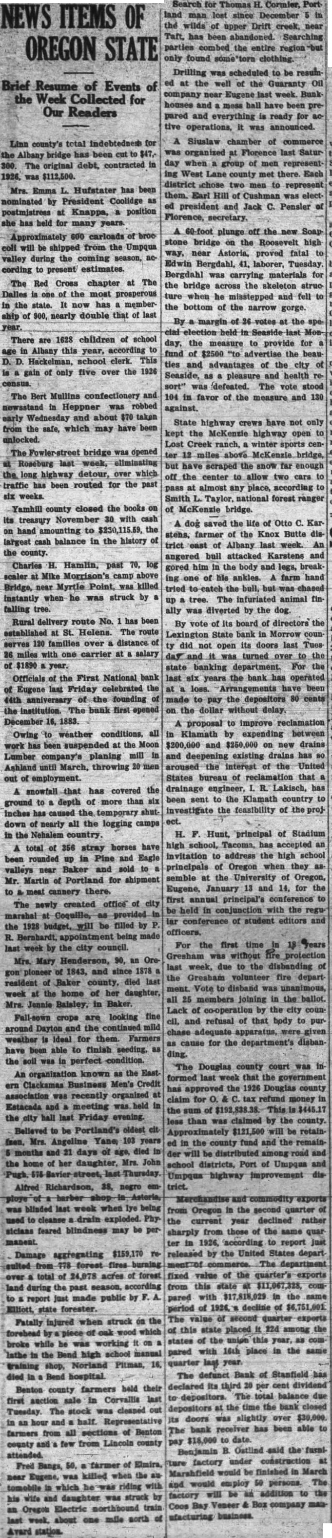NEWS ITEMS OF OREGON STATE Resume of Events of the Week Collected for Our Readers Linn county's total indebtedness for Albany bridge has been to $47.300. The original debt, contracted 1926, was $112,500. Mrs. Emma Hufstater has been nominated by President Coolidge as postmistress at Knappa, position she has held for many years. Approximately 600 carloads broo coll will be shipped from the Umpqua valley during the coming season, according to present estimates. The Red Cross chapter The Dalles of the most prosperous the state. It now has membership of 900, nearly double that of last year. There are 1628 children of school age in Albany this year, according to Hackelman, school clerk. This of only five over the 1926 gain census. The Bert Mullins confectionery and in Heppner was robbed early Wednesday and about $70 taken from the safe, which may have been unlocked. The Fowler-street bridge was opened Roseburg last week, eliminating long highway detour, over which traffic has been routed for the past six weeks. Yamhill county closed the books its treasury November 30 with cash on hand amounting to $230,115.59, the largest cash balance in the history of the county. Charles Hamlin, past log scaler at Mike Morrison's camp above Bridge, Myrtle Point, was killed when he was struck falling tree. Rural delivery route No. has been established at St. Helens. route 120 families distance of serves over 26 miles with one carrier salary $1890 year. Officials of the First National bank of Eugene last Friday celebrated the anniversary founding the institution. The bank first opened December 16, 1883. weather conditions, all Owing work has suspended at the Moon Lumber planing mill company's Ashland until March, throwing 20 men out of employment. snowfall has covered the to depth of more than six ground inches has caused the temporary shutdown of nearly all the logging camps the Nehalem country. total of 356 stray horses have been rounded up in Pine and Eagle valleys near Baker and sold Mr. Martin of Portland for shipment to meat cannery there. The newly created office city marshal provided the 1928 budget, be filled R. Bernhardt, being made last by the city council. Mrs. Mary Henderson, 90, an Oreploneer 1843, and since resident Baker county, died last week at the home of her daughter, Mrs. Jennie Baisley, in Baker. Fall-sown crops are looking fine around Dayton and the mild weather for them. Farmers have been able to finish seeding, was perfect condition. An organization known as the East ern Clackamas Business Men's Credit association was recently organized Estacada and meeting held the city hall last Friday evening. Believed to be oldest Mrs. 103 years Angeline and days of age, died the home her daughter, Mrs. John Pugh, last Thursday. Alfred Richardson, 38, negro emblinded last week when lye being used to cleanse drain exploded. sicians feared blindness may permanent. aggregating $159,170 re- released by the United States depart Damage department acres forest fixed value of the quarter's exports total from this state $11,067,328, comland during the past made public pared with $17,818,029 in the report just period of decline of Elliott, state forester. The value of second quarter exports Fatally injured when struck this state placed 22d among the wood states of the union year, broke while he was working pared with 16th place in the same lathe the Bend high school manual Pitman, year. training shop, Norland died hospital. The defunct Bank of Stanfield declared its third per cent dividend Benton county farmers held their The total balance due depositors. first auction sale Corvallis at the time the bank closed The stock was cleaned out Tuesday. doors was slightly over $30,000. an hour and half. Representative bank receiver has been able The farmers from all sections of Benton $18,000 to date. county few from Lincoln county Benjamin Ostlind said under construction of factory Fred Bangs, farmer Marshfield be finished in March Eugene, was killed when the would persons. The employ tomobile which riding with be addition the factory his wife and daughter was struck Coos Bay company Oregon Electric train business. about one mile north station. Search for Thomas Cormier, Port land man lost since December the wilds of upper Drift creek, near Taft, has been Searching parties combed the entire only found clothing. Drilling was scheduled to be resumat the well of the Guaranty company near Eugene last week. Bunk houses and mess hall have been prepared and everything ready for tive operations, was announced. Siuslaw chamber of commerce organized Florence last Satur day when group of men representing West Lane county met there Each district chose two to represent them. Earl Hill Cushman was elected president and Jack Pensler Florence, secretary. 60-foot plunge off the Soap stone bridge on the Roosevelt high way, near Astoria, proved fatal Bergdahl, laborer, Tuesday Bergdahl was materials for the bridge the skeleton when he misstepped and fell to the bottom of the narrow gorge. By margin votes the clal held in Seaside last day, the measure to provide for fund of $2500 "to advertise the beauties and advantages of the city Seaside, pleasure and health resort" was defeated. The vote stood 104 in favor of the measure and 130 against. State highway crews have not only kept the McKenzie open Lost Creek ranch, winter sports center miles above bridge, but have scraped the snow far enough off the center to allow two cars pass almost any place, according to Smith Taylor, national forest ranger of McKenzie bridge. saved the life of Otto Karstens, farmer of the Knox Butte district of Albany last week. An angered bull attacked Karstens and gored him in the body and legs, breaking one of his ankles. farm hand tried the bull, chased tree. The infuriated animal finally was diverted by the dog. By vote of its board of directors the Lexington State bank in Morrow county did not open its doors last turned state banking department. For the la