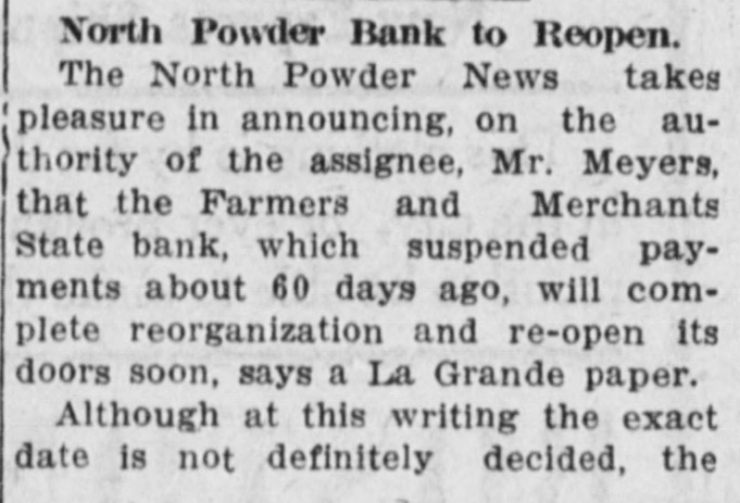North Powder Bank to Reopen. The North Powder News takes pleasure in announcing, on the authority of the assignee, Mr. Meyers, that the Farmers and Merchants State bank, which suspended payments about 60 days ago, will complete reorganization and re-open its doors soon, says a La Grande paper. Although at this writing the exact date is not definitely decided, the