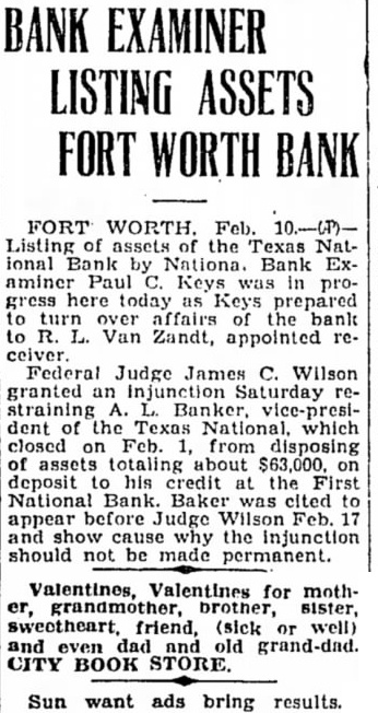 By The United Press. FORT WORTH, Tex.-Two Fort Worth banks were closed yesterday, the result of heavy withdrawals by depositors. They were the Texas National Bank and the Polytechnic State Bank. Assurance was given by officials of the Texas National Bank which also controls the Poly Bank. that no depositor would lose even cent. Officials of the Texas National Bank insist the condition of that institution is healthy and that the closing down was brought by a run late Friday caused by rumors.