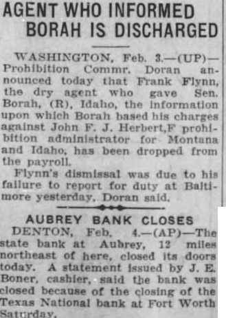 DENTON, Feb. 4.-Failure of the Texas National Bank at Fort Worth to open its doors Saturday was blamed today for closing of the First State Bank at Aubrey, near here. The Aubrey bank had deposits in the Fort Worth institution totaling more than $25,000. sum greater than the bank's capital stock. Prior to the closing of the Fort Worth bank. the Aubrey bank was in "excellent condition, statement issued by Cashier J. E. Boner. Representatives of the State Banking Department held Aubrey bank officials blameless for the closing, he said. Its deposits totaled $85,000.