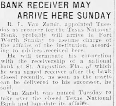 R. Vau Zandr. whose appointment Texas National Bank was anopunced in Vashington Tuesday morning by Comptroller of the Currency Poole, has been instructed to proceed to Fort Worth as soon possible according to disfrom Van Zandt St Augustine, has acting as ceiver national bank. Actual liquidation of Texas National Bank require some time, officials the Treasury indicated Tuesday in Washington. They stated had no information as yet which would to indicate when funds held by the bank be available 12 depositors