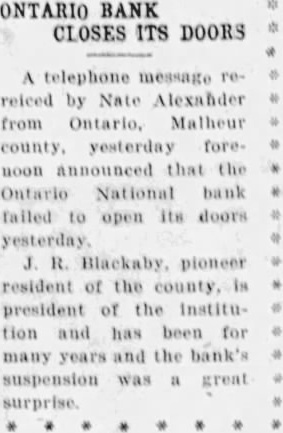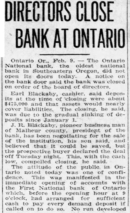 DIRECTORS CLOSE BANK AT ONTARIO Ontario Or., Feb. The Ontario National bank, the oldest national bank in Southeastern Oregon, did not open its doors today. notice on the bank door said the bank was closed on order of the board of directors. Earl Blackaby, cashier, said deposits at time of "closing about $475,000 and that assets cover liabilities. The closing, he said, was to the gradual sinking of deposits since R. Blackaby, business man of Malheur president of the for the sale of the institution, his said, and believed that could be saved, but the prospective buyer declared the deal off Tuesday night. This, with the cash low compelled closing, he said. The attitude of the public Ontario noted today was one of confidence. This manifested in the immediate opening of accounts with the First National bank of Ontario which, before the opening hour at o'clock, had arranged for sufficient cash pay every demand deposit called on to do so. No run developed