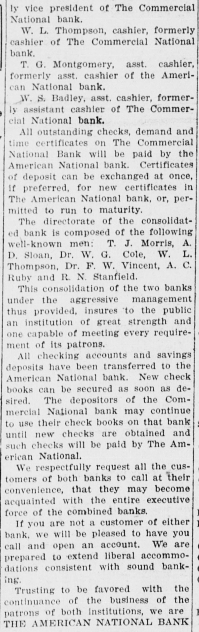 ly vice president of The Commercial National bank. W. L. Thompson, cashier, formerly cashier of The Commercial National bank. T. G. Montgomery, asst. cashier, formerly asst. cashier of the American National bank. W. S. Badley, asst. cashier, formerly assistant cashier of The Commercial National bank. All outstanding checks, demand and time certificates on The Commercial National Bank will be paid by the American National bank. Certificates of deposit can be exchanged at once, if preferred, for new certificates in The American National bank, or, permitted to run to maturity. The directorate of the consolidated bank is composed of the following well-known men: T. J. Morris, A. D. Sloan, Dr. W. G. Cole, W. L. Thompson, Dr. F. W. Vincent, A. C. Ruby and R. N. Stanfield. This consolidation of the two banks under the aggressive management thus provided, insures to the public an institution of great strength and one capable of meeting every requirement of its patrons. All checking accounts and savings deposits have been transferred to the American National bank. New check books can be secured as soon as desired. The depositors of the Commercial National bank may continue to use their check books on that bank until new checks are obtained and such checks will be paid by The American National. We respectfully request all the customers of both banks to call at their convenience, that they may become acquainted with the entire executive force of the combined banks. If you are not a customer of either bank, we will be pleased to have you call and open an account. We are prepared to extend liberal accommodations consistent with sound banking. Trusting to be favored with the continuance of the business of the patrons of both institutions, we are THE AMERICAN NATIONAL BANK