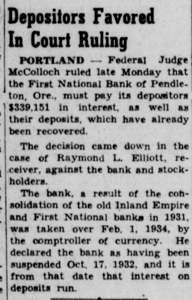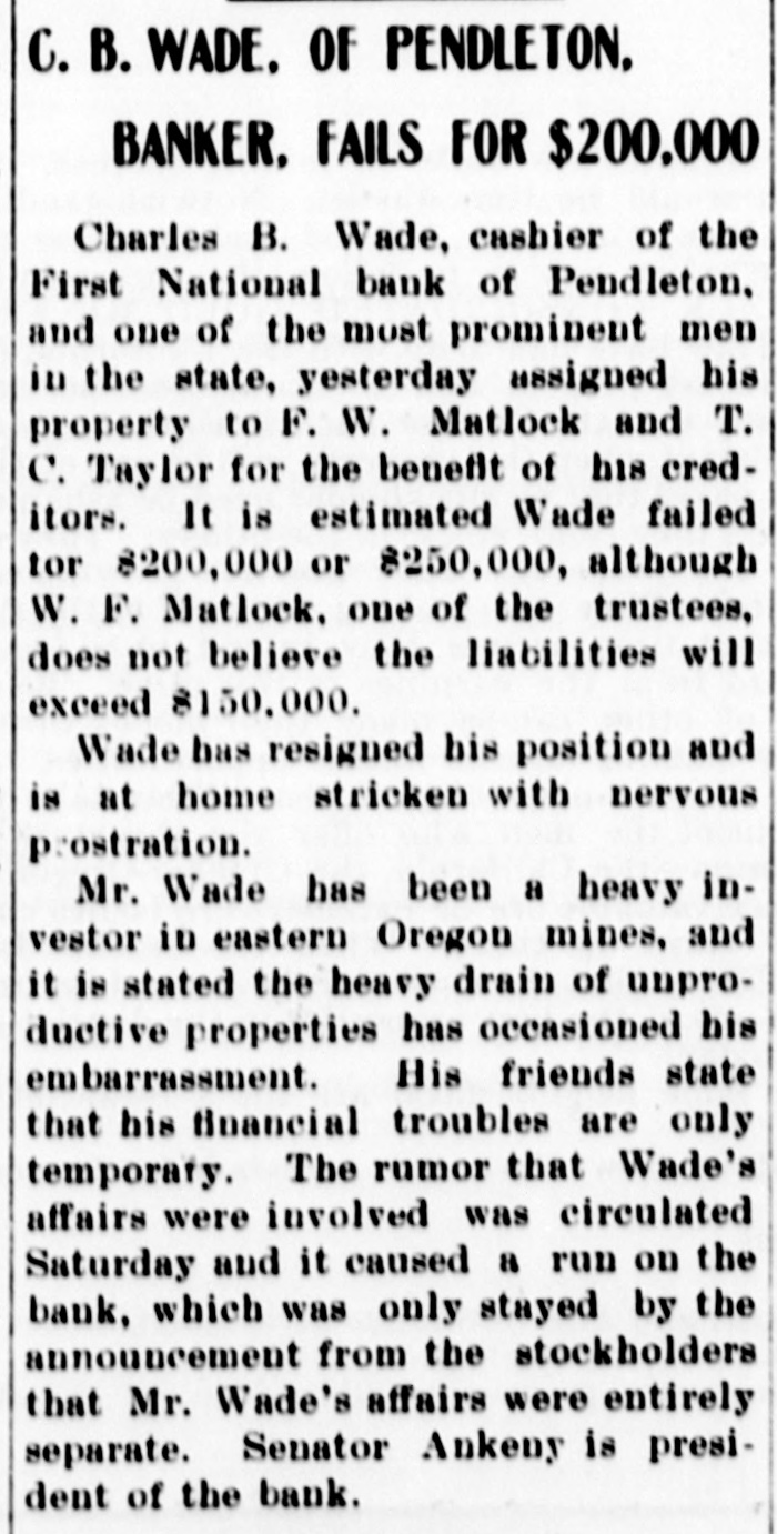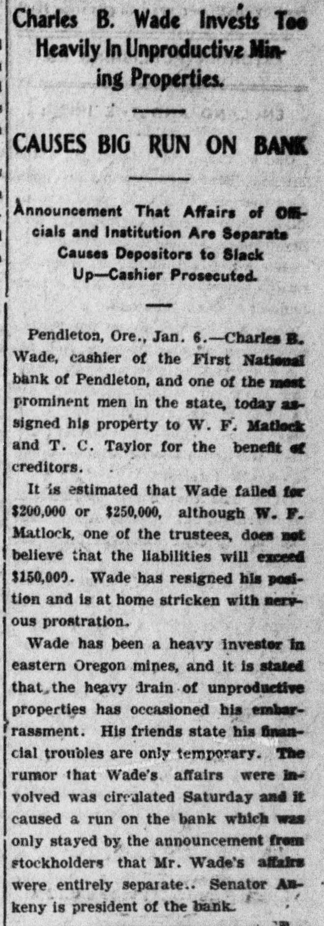 Charles B. Wade Invests Too Heavily In Unproductive Mining Properties. CAUSES BIG RUN ON BANK Announcement That Affairs of Officials and Institution Are Separate Causes Depositors to Slack Up-Cashier Prosecuted. I Pendleton, Ore., Jan. 6.-Charles B. Wade, cashier of the First National bank of Pendleton, and one of the most prominent men in the state, today assigned his property to W. F. Matlock and T. C. Taylor for the benefit of creditors. It is estimated that Wade failed for $200,000 or $250,000, although W. F. Matlock, one of the trustees, does not believe that the liabilities will exceed $150,000. Wade has resigned his position and is at home stricken with nervous prostration. Wade has been a heavy investor in eastern Oregon mines, and it is stated that, the heavy drain of unproductive properties has occasioned his embarrassment. His friends state his financial troubles are only temporary. The rumor that Wade's affairs were involved was circulated Saturday and it. caused a run on the bank which was only stayed by the announcement from stockholders that Mr. Wade's affairs were entirely separate.. Senator ABkeny is president of the bank.