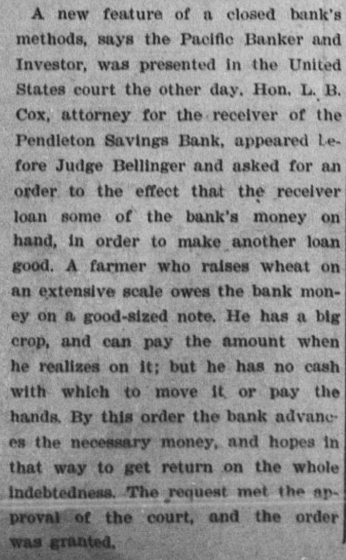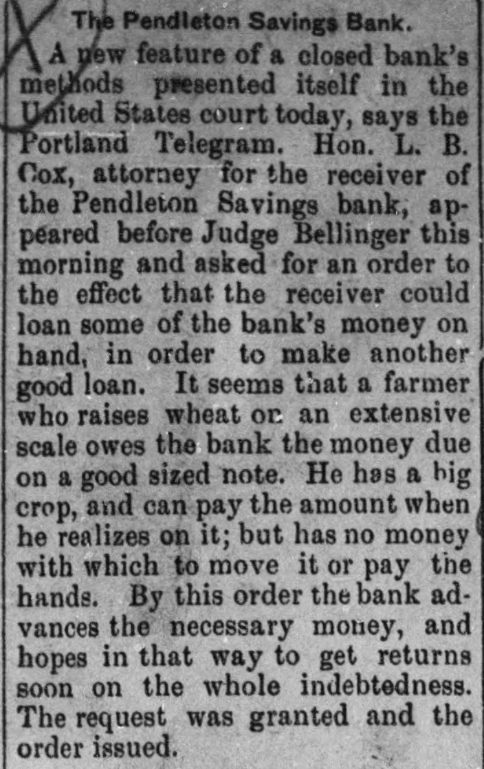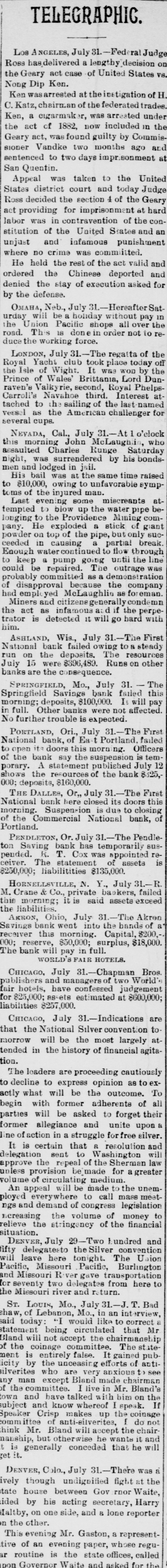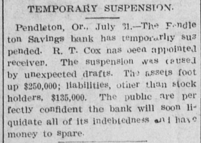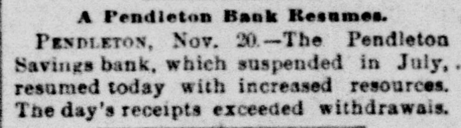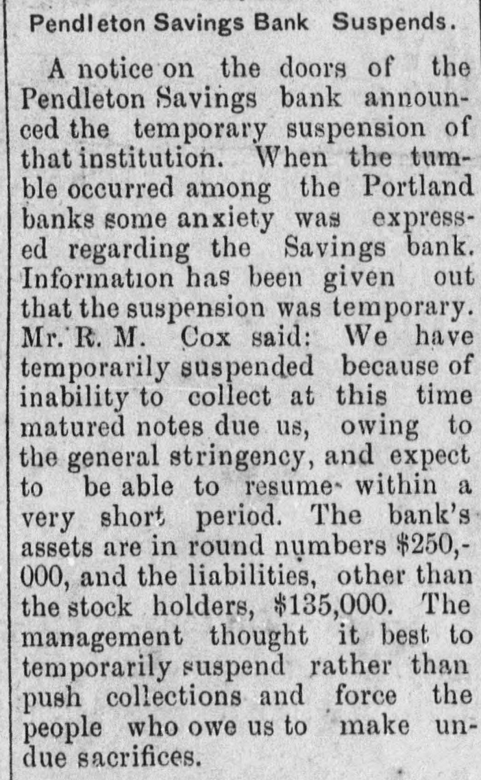 ACTION OF BANKS. Some Post the Sixty Days' Notice and Others Fail to Open Their Doors. FALL RIVER, Mase., July 31 morning the four savings banks of the city took advantage of their by-laws to prevent any further withdrawale of deposits. Hereafter until further notice is given deposit ors will not be allowed to withdraw large sums except after having given 30 or 60 days' notice. In some banks the amount is $50 and in others the amount is $100. This action was necessitated as a result of heavy withdrawals during the past two weeks, but more particularly during the past few days. It is said that last week the withdrawals were $100,000 in xcess of the deposits. BROOKLYN, N. Y., July 31.-The sixty days notice order of the Brooklyn banks, compelling depositors to give notice before they could withdraw their deposits, caused several runs on the savings banks to-day. The greatest run was on the Brooklyn Savings bank. When the doors of the bank opened at 10 o'clock this morning an enormous crowd was waiting to draw its money. When they entered the bank they found notices posted on the walls compelling depositors to give eixty days' notice before they could draw their money. Great indignation was caused by these notices. Threats were made, but as these were of no avail the crowd went away in an ugly mood. Slight runs were also made on the South Brooklyn Savings institution and on the Dime Savings bank. UPPER SANDUSKY, O., July 31.-The Wyandotte County bank went into the hands of 8 receiver this morning. The bank officials claim the assets are sufficient to pay depositors three times over. CEDAR RAPIDS, Ia., July 31.-A. Daniels & Co., private bankers at Marion, made an assignment to C. H. Kuriz. The property is valued at $200,000 for the: benefit of all their creditors. PORTLAND, Ore., July 31.-The First National bank of East Portland failed to open its doors this morning. The officers of the bank say the suspension is temporary. A statement published July 12 shows resources of $300,000 and deposits of $150,000. THE DALLES, July 31.-The First National bank closed its doors this morning. The suspension is due to the closing of the Commercial National bank of Portland. PENDLETON, Ore., July 31.-The Pendleton Savings bank has temporarily suspended, Assets, $250,000; liabilities, $135,000. WORCESTER, Mass., July 31.-The Worcester savings banks give notice to-night that beginning to-morrow they will, in common with the majority of the savings banks throughout the state, enforce the provisions of their by-laws which requires notice of withdrawal of amounts exceeding $50.