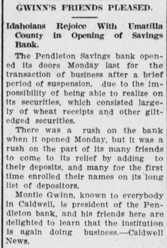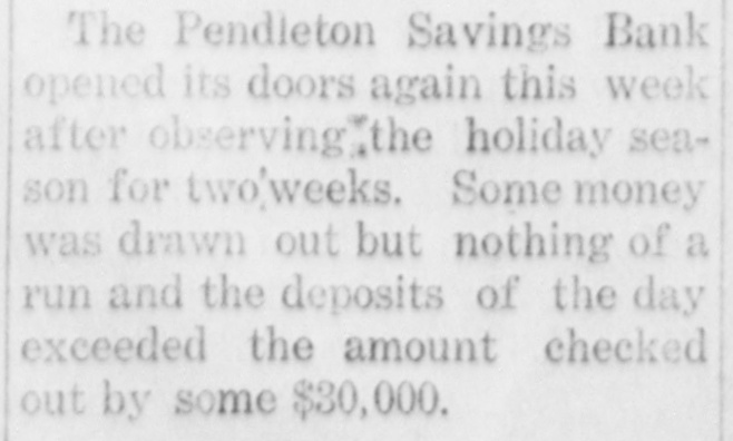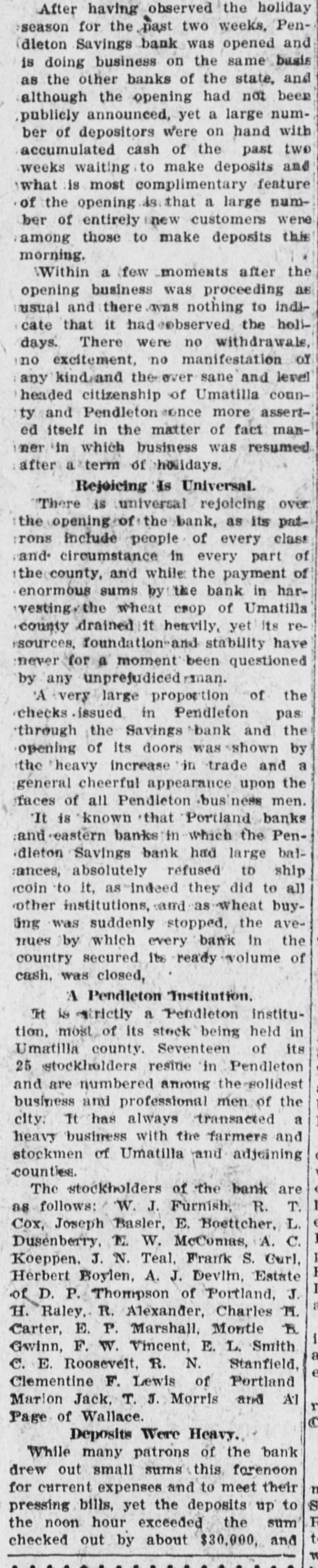 After having observed the holiday Penfor the past two weeks, and dieton season Savings bank was opened basis doing business on the same and is the other banks of the state, been as although the opening had not numpublicly announced, yet a large with ber of depositors were on hand two accumulated cash of the past and weeks waiting to make deposits what is most complimentary feature of the opening às that a large number of entirely new customers wene this among those to make deposits morning. Within a few moments after the opening business was proceeding indt- as usual and there was nothing to holicate that it had observed the days. There were no withdrawals, of no excitement, no manifestation level any kindland the over sane and counheaded citizenship of Umatilla and Pendleton once more assertty ed itself in the matter of fact manner in which business was resumed after a term of holidays. Rejeicing Is Universal. There is universal rejoicing over the opening of the bank, as its class patrons include people of every of and circumstance in every part of the county, and while the payment harenormous sums by the bank in vesting the wheat crop of Umatilla its recounty drained it heavily, yet have foundation-and stability sources, never for a moment been questioned by any unprejudiced rman. A very large proportion of the checks issued in Pendleton pass through the Savings bank and the by opening of its doors was shown a the heavy increase in trade and the general cheerful appearance upon faces of all Pendleton bus ness men. It is known that Portland banks and eastern banks in which the Pen- baldieton Savings bank had large rances, absolutely refused to ship all coin to it, as indeed they did to other institutions, and as wheat buyling was suddenly stopped, the ave- the nues by which every bank in of country secured its ready volume cash, was closed, A Pendleton Institution. TH is directly a Pendleton institution. most of its stock being held its in Umatilla county. Seventeen of 25 stockholders reside in Pendleton and are numbered among the solidest business and professional men of the a city: It has always transacted heavy business with the farmers and stockmen of Umatilla and adjeining counties. The stockholders of the bank are follows: / W. J. Furnish, R. L. T. Cox, as Joseph Basler, E. Boettcher, C. Dusenberry. E. W. McComas, A. Koeppen. J. N. Teal, Frank S. Curl, Herbert Boylen, A. J. Devim, Estate J. of P. Thompson of Portland, M. H. Raley. R. Alexander, Charles B. Carter, E. P. Marshall, Montie Gwinn, F. W. Vincent, E. L. Smith E. Roosevelt, R. N. Stanfield, Clementine C. F. Lewis of Portland Marion Jack, T. J. Morris and A1 C Page of Wallace. Deposits Were Heavy. While many patrons of the bank drew out small sums this forenoon n for current expenses and to meet their to S F pressing bills, yet the deposits up sum the noon hour exceeded the t checked out by about $30,000, and