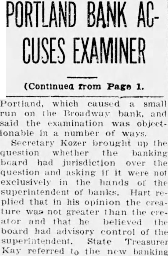 Demand Know. In reply question bv State Treasurer Kay Hart, attorney for the bank. replied that the purpose of the hearing to find out the Portland bank has not been made depository for state funds: why banks have been refused permission to deposit their serves with us and why we are being discriminated against Hart read series of letters that passed Bramwell in which he insisted on knowing why permission serve as reserve depository had been refused the bank. He accused Bramwell of having evaded direct and said: "We demand to reply. know now." Secretary Kozer brought up the question whether banking law board had jurisdiction and asking were exclusively in the hands of superintendent banks. Hart replied that his opinion the creature was not greater than the creator and that believed the board had advisory control of the superintendent. State Treasurer Kay referred to the new banking code saying that it took from the board about all the power had except that of appointing bank superintendent. granting bank charters and annroving charters. Bramwell Explains. Superintendent Bramwell explained that the new code does not change of the board but that the authority charters as reserve degranting positories has always been discretion with the superintendent. has always been poor law." said Governor Pierce. very poor in this day and age. 'Have you any other evidence to support of present?" asked Kay. statements that you have made that would tend to show that Bramwell has unfair. arbitrary or incompetent been might cause the board to and that consider his removal? Bramwell wanted to know At this was on what want to said "That's think they have right to ahead and present all they added Bramwell. the call in and hear my side. me Several country bankers were duced by Mr. Haines to testify be Portland National They half of the had been advised testified that they