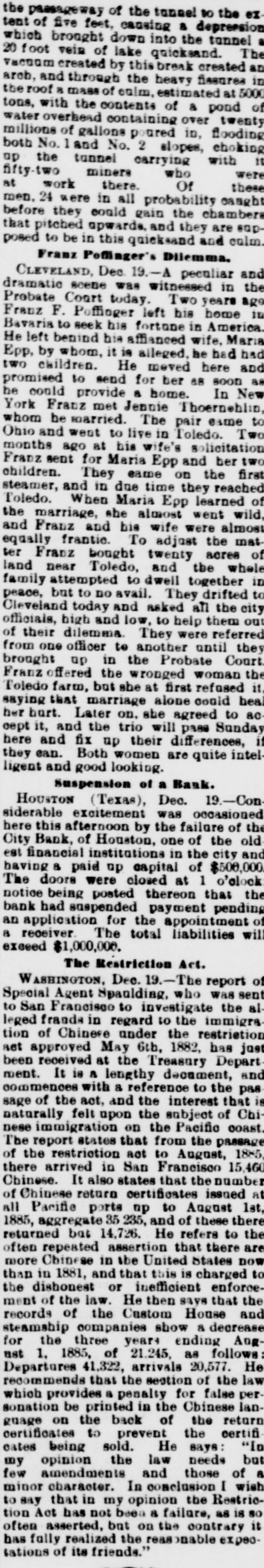 up the tunnel earrying with fifty-two miners who we at work there. Of the men. 24 were in all probability caugi before they could gain the chambe that pitched upwards, and they are en posed to be in this quicksand and call Franz Poffinger's Dilemma. CLEVELAND, Dec. 19.-A peenliar an dramatic scene was witnessed in ti Probate Coart today. Two years as Franz F. Poffinger left bis home 1 Bavaria to seek bis fortune in Americ He left benind bis affianced wife, Mar Epp, by whom, it is alleged, be had be two children. He moved here an promised to send for her 88 soon / be could provide a home. In Ne York Franz met Jennie Thoernehis whom be married. The pair eame 1 Ohio and went to live in Toledo. Tv months ago at bis wife's solicitatio Franz sent for Maria Epp and her to children. They came on the fir steamer, and in due time they reache Toledo. When Maria Epp learned e the marriage, she almost went will and Franz and bis wife were almo equally frantie. To adjust the ma ter Franz bought twenty acree e land near Toledo, and the who family attempted to dwell together i peace, but to no avail. They drifted Cleveland today and asked all the eit officials, high and low, to help them o of their dilemma. They were referre from one officer to another until the brought up in the Probate Cour Franz offered the wronged woman th Toledo farm, but she at first refused i saying that marriage alone coold be her burt. Later on, she agreed to a cept it, and the trio will pass Sunds here and fix up their differences, they can. Both women are quite inte ligent and good looking. Suspension of a Bank. HOUSTON (Texas), Dec. 19.-Co siderable excitement was occasione here this afternoon by the failure of ti City Bank, of Houston, one of the ol est financial institutions in the city at having & paid up capital of $500,00 The doors were closed at 1 o'oloc notice being posted thereon that th bank had suspended payment pendir an application for the appointment a receiver. The total liabilities wi exceed $1,000,000. The Restriction Act. WASHINGTON, Dec. 19.-The report e Special Agent Spaulding, who was ser to San Francisco to investigate the a leged frands in regard to the immigr tion of Chinese under the restrictio net approved May 6th, 1882, has ja been received at the Treasury Depar ment. It is a lengthy decument, an commences with a reference to the pa sage of the act, and the interest that naturally felt upon the subject of Cb nese immigration on the Pacific coas The report states that from the passas of the restriction act to August, 188 there arrived in San Francisco 15,46 Chinese. It also states that the number of Chinese return certificates issued a all Pacific ports up to August ls 1885, aggregate 35 235, and of these the returned but 14,726. He refers to th often repeated assertion that there as more Chinese in the United States no than in 1881, and that this is charged I the dishonest or inefficient enfore ment of the law. He then says that th records of the Custom House an steamship companies show a decreas for the three