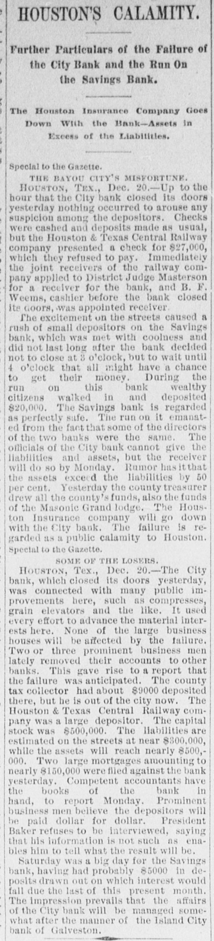 HOUSTON'S CALAMITY. Further Particulars of the Failure of the City Bank and the Run On the Savings Bank. The Houston Insurance Company Goes Down With the Bank-Assets in Excess of the Liabilities. Special to the Gazette. THE BAYOU CITY'S MISFORTUNE. HOUSTON, TEX., Dec. 20.-Up to the hour that the City bank closed its doors yesterday nothing occurred to arouse any suspicion among the depositors. Checks were cashed and deposits made as usual, but the Houston & Texas Central Railway company presented a check for $27,000, which they refused to pay. Immediately the joint receivers of the railway company applied to District Judge Masterson for a receiver for the bank, and B. F. Weems, cashier before the bank closed its Goors, was appointed receiver. The excitement on the streets caused a rush of small depositors on the Savings bank, which was met with coolness and did not last long after the bank decided not to close at 3 o'clock, but to wait until 4 o'clock that all might have a chance to get their money. During the run on this bank wealthy citizens walked in and deposited $20,000. The Savings bank is regarded as perfectly sufe. The run on it emanated from the fact that some of the directors of the two banks were the same. The officials of the City bank cannot give the liabilities and assets, but the receiver will do so by Monday. Rumor has it that the assets exceed the liabilities by 50 per cent. Yesterday the county treasurer drew all the county's funds, also the funds of the Masonic Grand lodge. The Houston Insurance company will go down with the City bank. The failure is regarded as a public calamity to Houston. Special to the Gazette. SOME OF THE LOSERS. HOUSTON, Tex., Dec. 20.-The City bank, which closed its doors yesterday, was connected with many public improvements here, such as compresses, grain elevators and the like. It used every effort to advance the material interests here. None of the large business houses will be affected by the failure. Two or three prominent business men lately removed their accounts to other banks. This gave rise to a report that the failure was anticipated. The county tax collector had about $9000 deposited there, but he is out of the city now. The Houston & Texas Central Railway company was a large depositor. The capital stock was $500,000. The liabilities are estimated on the streets at near $800,000, while the assets will reach nearly $500,000. Two large mortgages amounting to nearly $150,000 were filed against the bank yesterday. Competent accountants have the books of the bank in hand, to report Monday. Prominent business men believe the depositors will be paid dollar for dollar. President Baker refuses to be interviewed, saying that his information is not such as enables him to tell what the result will be. Saturday was a big day for the Savings bank, having had probably $5000 in deposits drawn out on which interest would fall due the last of this present month. The impression prevails that the affairs of the will he