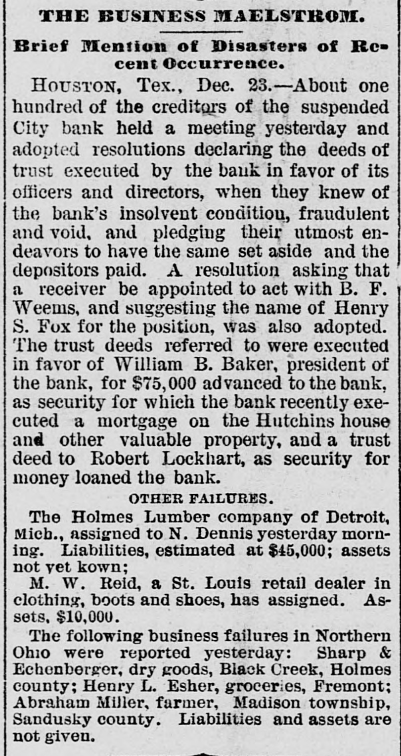 THE BUSINESS MAELSTRON. Brief Mention of Disasters of Rccent Occurrence. HOUSTON, Tex., Dec. 23.-About one hundred of the creditors of the suspended City bank held a meeting yesterday and adopted resolutions declaring the deeds of trust executed by the bank in favor of its officers and directors, when they knew of the bank's insolvent condition, fraudulent and void, and pledging their utmost endeavors to have the same set aside and the depositors paid. A resolution asking that a receiver be appointed to act with B. F. Weems, and suggesting the name of Henry S. Fox for the position, was also adopted. The trust deeds referred to were executed in favor of William B. Baker, president of the bank, for $75,000 advanced to the bank, as security for which the bank recently executed a mortgage on the Hutchins house and other valuable property, and a trust deed to Robert Lockhart, as security for money loaned the bank. OTHER FAILURES. The Holmes Lumber company of Detroit, Mich., assigned to N. Dennis yesterday morning. Liabilities, estimated at $45,000; assets not yet kown; M. W. Reid, a St. Louis retail dealer in clothing, boots and shoes, has assigned. Assets, $10,000. The following business failures in Northern Ohio were reported yesterday: Sharp & Echenberger, dry goods, Black Creek, Holmes county; Henry L. Esher, groceries, Fremont; Abraham Miller, farmer, Madison township, Sandusky county. Liabilities and assets are not given.