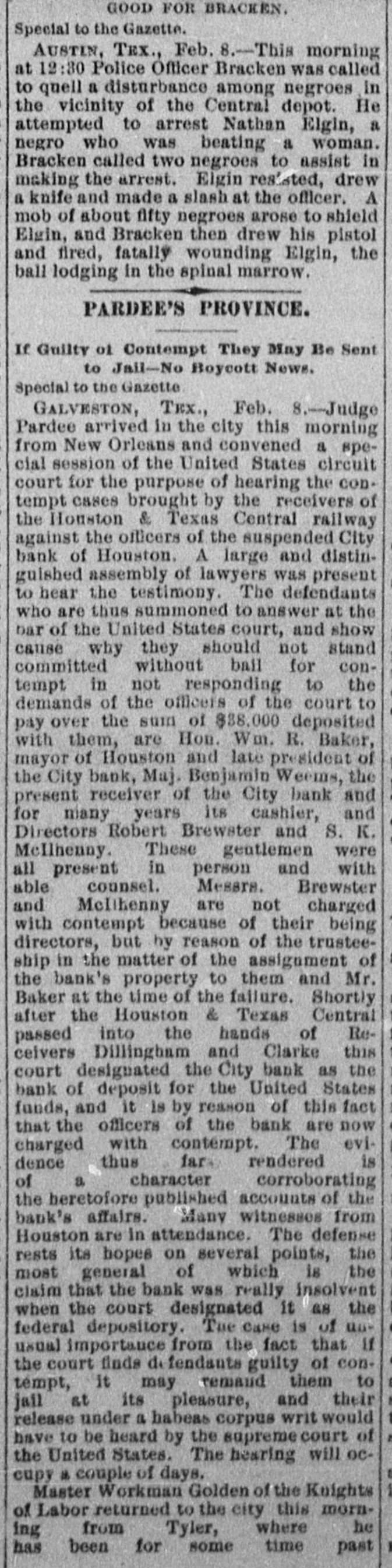 GOOD FOR BRACKEN. Special to the Gazette. AUSTIN, TEX., Feb. 8.-This morning at 12:30 Police Officer Bracken was called to quell a disturbance among negroes in the vicinity of the Central depot. He attempted to arrest Nathan Elgin, a negro who was beating a woman. Bracken called two negroes to assist in making the arrest. Elgin resisted, drew a knife and made a slash at the officer. A mob of about fifty negroes arose to shield Elgin, and Bracken then drew his pistol and fired, fatally wounding Elgin, the ball lodging in the spinal marrow. PARDEE'S PROVINCE. If Guilty of Contempt They May Be Sent to Jail-No Boycott News. Special to the Gazette GALVESTON, TEX., Feb. 8.-Judge Pardee arrived in the city this morning from New Orleans and convened a special session of the United States circuit court for the purpose of hearing the contempt cases brought by the receivers of the Houston & Texas Central railway against the officers of the suspended City bank of Houston. A large and distinguished assembly of lawyers was present to hear the testimony. The defendants who are thus summoned to answer at the bar of the United States court, and show cause why they should not stand committed without ball for contempt in not responding to the demands of the officers of the court to pay over the sum of $88,000 deposited with them, are Hon. Wm. R. Baker, mayor of Houston and late president of the City bank, Maj. Benjamin Weems, the present receiver of the City bank and for many years its cashier, and Directors Robert Brewster and S. K. Mellhenny. These gentlemen were all present in person and with able counsel. Messrs. Brewster and Mclihenny are not charged with contempt because of their being directors, but by reason of the trusteeship in the matter of the assignment of the bank's property to them and Mr. Baker at the time of the failure. Shortly after the Houston & Texas Central passed into the hands of Receivers Dillingham and Clarke this court designated the City bank as the bank of deposit for the United States funds, and it is by reason of this fact that the officers of the bank are now charged with contempt. The evidence thus far rendered is of a character corroborating the heretofore published accounts of the bank's affairs. Many witnesses from Houston are in attendance. The defense rests its hopes on several points, the most general of which is the claim that the bank was really insolvent when the court designated it as the federal depository. Tue case is of unusual importance from the fact that If the court finds de fendants guilty of conI tempt, it may remand them to jail at its pleasure, and their 1 release under a habeas corpus writ would . have to be heard by the supreme court of the United States. The hearing will oca cupy a couple of days. 1 Master Workman Golden of the Knights of Labor returned to the city this morning from Tyler, where he I has been for some time past