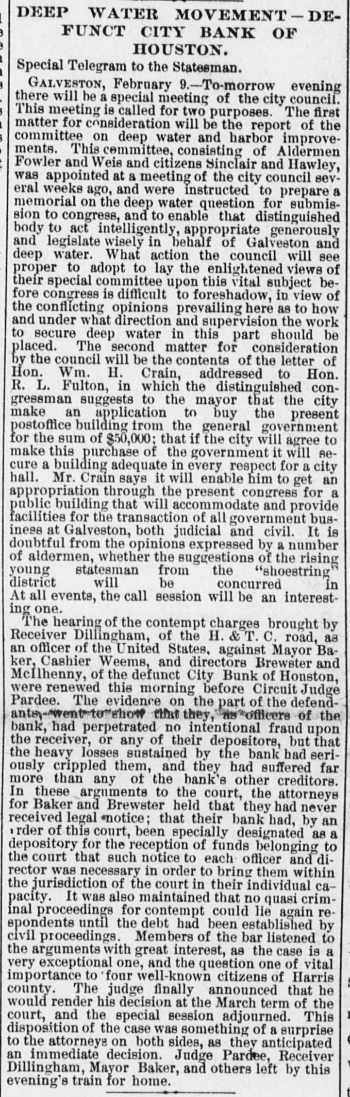 DEEP WATER MOVEMENT - DEFUNCT CITY BANK OF HOUSTON. Special Telegram to the Statesman. GALVESTON, February 9.-To-morrow evening there will be a special meeting of the city council. This meeting is called for two purposes. The first matter for consideration will be the report of the committee on deep water and harbor improvements. This committee, consisting of Aldermen Fowler and Weis and citizens Sinclair and Hawley, was appointed at a meeting of the city council several weeks ago, and were instructed to prepare a memorial on the deep water question for submission to congress, and to enable that distinguished body to act intelligently, appropriate generously and legislate wisely in behalf of Galveston and deep water. What action the council will see proper to adopt to lay the enlightened views of their special committee upon this vital subject before congress is difficult to foreshadow, in view of the conflicting opinions prevailing here as to how and under what direction and supervision the work to secure deep water in this part should be placed. The second matter for consideration by the council will be the contents of the letter of Hon. Wm. H. Crain, addressed to Hon. R. L. Fulton, in which the distinguished congressman suggests to the mayor that the city make an application to buy the present postoffice building from the general government for the sum of $50,000; that if the city will agree to make this purchase of the government it will secure a building adequate in every respect for a city hall. Mr. Crain says it will enable him to get an appropriation through the present congress for a public building that will accommodate and provide facilities for the transaction of all government business at Galveston, both judicial and civil. It is doubtful from the opinions expressed by a number of aldermen, whether the suggestions of the rising young statesman from the "shoestring district will be concurred in At all events, the call session will be an interesting one. The hearing of the contempt charges brought by Receiver Dillingham, of the H. & T. C. road, as an officer of the United States. against Mayor Baker, Cashier Weems, and directors Brewster and McIlhenny, of the defunct City Bunk of Houston, were renewed this morning before Circuit Judge Pardee. The evidence on the part of the defendanter-went-to that they, as officers of the bank, had perpetrated no intentional fraud upon the receiver, or any of their depositors, but that the heavy losses sustained by the bank had seriously crippled them, and they had suffered far more than any of the bank's other creditors. In these arguments to the court, the attorneys for Baker and Brewster held that they had never received legal *notice; that their bank had, by an rder of this court, been specially designated as a depository for the reception of funds belonging to the court that such notice to each officer and director was necessary in order to bring them within the jurisdiction of the court in their individual capacity. It was also maintained that no quasi criminal proceedings for contempt could lie again respondents until the debt had been established by civil proceedings. Members of the bar listened to the arguments with great interest, as the case is a very exceptional one, and the question one of vital importance to four well-known citizens of Harris county. The judge finally announced that he would render his decision at the March term of the court, and the special session adjourned. This disposition of the case was something of a surprise to the attorneys on both sides, as they anticipated an immediate decision. Judge Pardee, Receiver Dillingham, Mayor Baker, and others left by this evening's train for home.