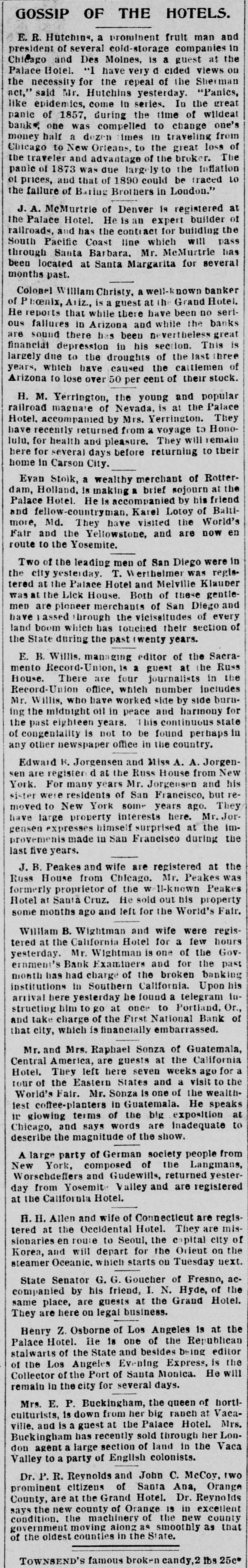 GOSSIP OF THE HOTELS. E. R. Hutchins, a prominent fruit man and president of several cold-storage companies in Chicago and Des Moines, is a guest at the Palace Hotel. "I have very d cided views on the necessity for the repeal of the Sherman act," said Mr. Hutchins yesterday. "Panics, like epidemics, come In series. In the great panic of 1857, during the time of wildeat banks, one was compelled to change one's money half a dozen imes in traveling from Chicago to New Orteans, to the great loss of the traveler and advantage of the broker. The panic of 1873 was due largely to the Inflation of prices, and that of 1890 could be traced to the failure of Baring Brothers in London." J. A. McMurtrie of Denver is registered at the Palace Hotel. He is an expert builder of railroads, and has the contract for building the South Pacific Coast line which will pass through Santa Barbara, Mr. McMurtrie has been located at Santa Margarita for several months past. Colonel William Christy, a well-known banker of P hoenix, Ariz., is a guest at the Grand Hotel. He reports that while there have been no serious failures in Arizona and while the banks are sound there has been nevertheless great financial depression in his section. This is largely due to the droughts of the last three years, which have caused the cattlemen of Arizona to lose over 50 per cent of their stock. H. M. Verrington, the young and popular railroad magnate of Nevada, is at the Palace Hotel. accompanied by Mrs. Yerrington. They have recently returned from a voyage to Honolulu, for health and pleasure. They will remain here for several days before returning to their home in Carson City. Evan Stolk, a wealthy merchant of Rotterdam, Holland, is making a brief sojourn at the Palace Hotel. He is accompanied by his friend and fellow-countryman, Karel Lotoy of Baltimore, Md. They have visited the World's Fair and the Yellowstone, and are now en route to the Yosemite. Two of the leading men of San Diego were in the city yesterday. T. Werthelmer was registered at the Palace Hotel and Melville Klauber was at the Lick House. Both of these gentlemen are pioneer merchants of San Diego and have assed through the vicissitudes of every land boom which bas touched their section of the State during the past (wenty years. E. B. Willis. managing editor of the Sacramento Record-Union, is a guest at the Russ House. There are four journalists in the Record-Union office, which number includes Mr. Willis, who have worked side by side burning the midnight oil in peace and harmony for the past eighteen years. This continuous state of congentality is not to be found perhaps in any other newspaper office in the country. Edward B. Jorgensen and Miss A. A. Jorgensen are register d at the Russ House from New York. For many years Mr. Jorgensen and his sister were residents of San Francisco, but removed to New York some years ago. They have large property interests here. Mr. Jorgensen expresses himself surprised at the improvemenis made in San Francisco during the last five years. J. B. Peakes and wife are registered at the Russ House from Chicago. Mr. Peakes was formerly proprietor of the well-known Peakes Hotel at Santa Cruz. He sold out his property some months ago and left for the World's Fair. William B. Wightman and wife were registered at the California Hotel for a few hours yesterday. Mr. Wightman is one of the Government's Bank Examiners and for the past month has had charge of the broken banking institutions in Southern California. Upon his arrival here yesterday he found a telegram Instructing him to go at once to Portland, Or., and take charge of the First National Bank of that city, which is financially embarrassed. Mr. and Mrs. Raphael Sonza of Guatemala, Central America, are guests at the California Hotel. They left here seven weeks ago for a tour of the Eastern States and a visit to the World's Fair. Mr. Sonza is one of the wealthfest coffee-planters in Guatemala. He speaks in glowing terms of the big exposition at Chicago, and says words are inadequate to describe the magnitude of the show. A large party of German society people from New York, composed of the Langmans, Worschdeffers and Gudewills, returned yesterday from Yosemite Valley and are registered at the California Hotel. H. H. Allen and wife of Connecticut are registered at the Occidental Hotel. They are missionaries en route to Seoul, the capital city of Korea, and will depart for the Orient on the steamer Oceanic, which starts on Tuesday next. State Senator G. G. Goucher of Fresno, accompanied by his friend, I. N. Hyde, of the same place, are guests at the Grand Hotel. They are here on legal business.