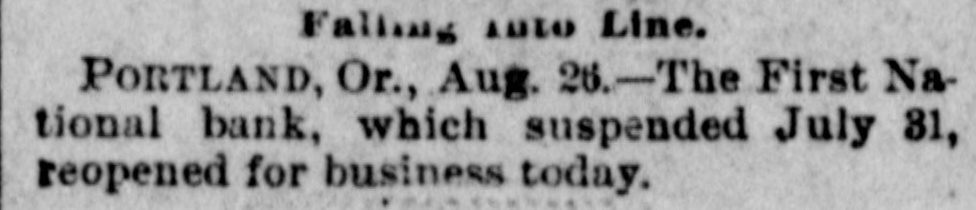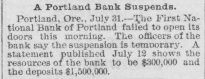 Slight run on First National on July 29 amid multiple Portland bank suspensions/withdrawals (Commercial National, Portland Savings, Ainsworth National) and general local stringency.