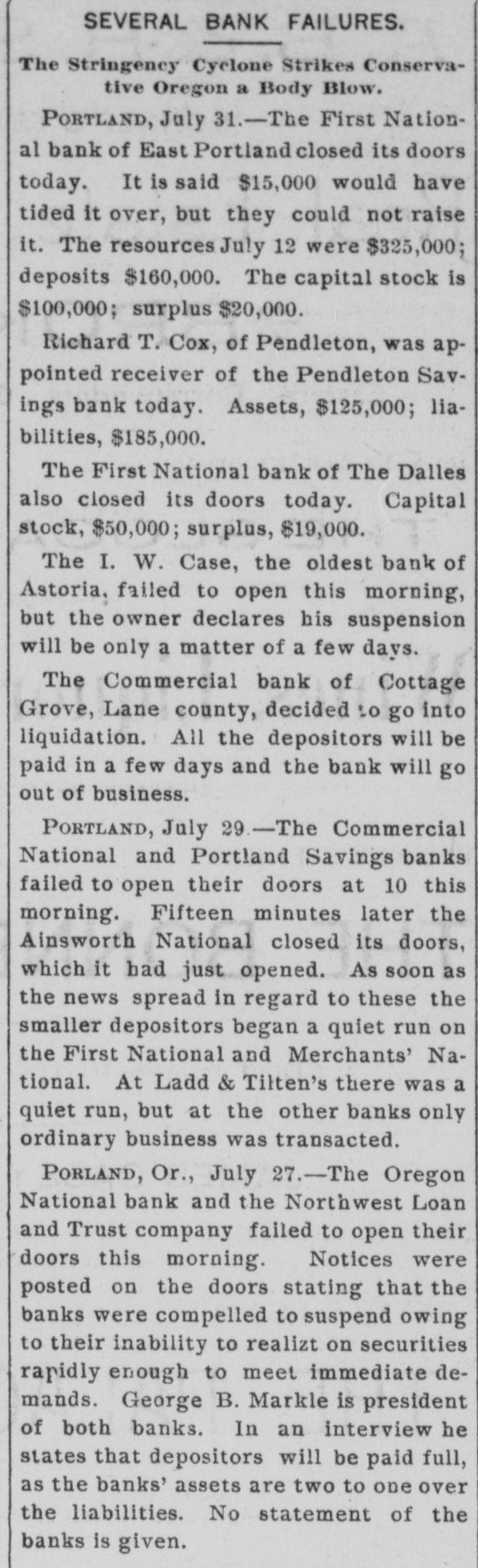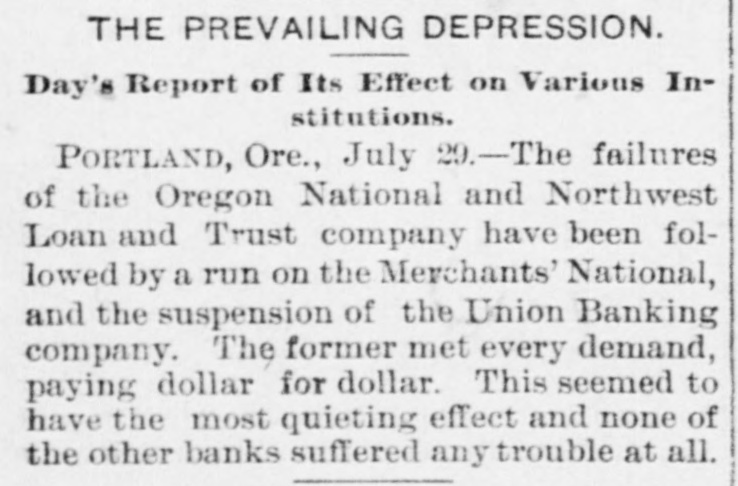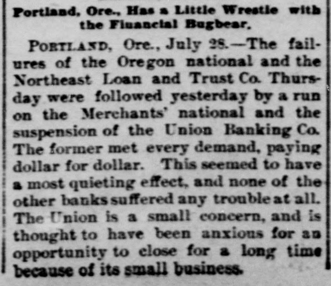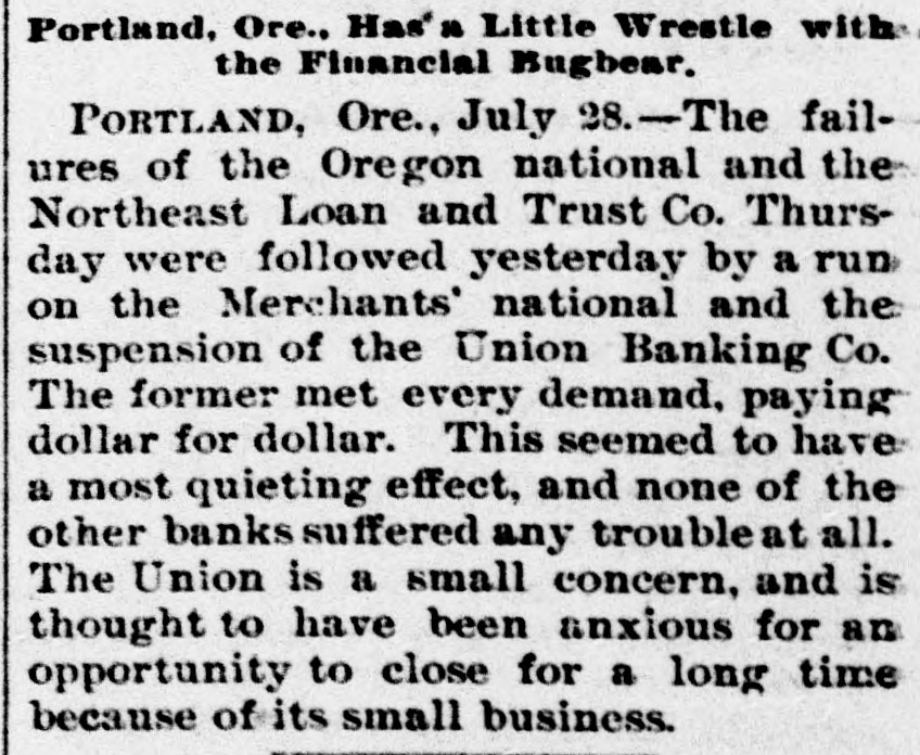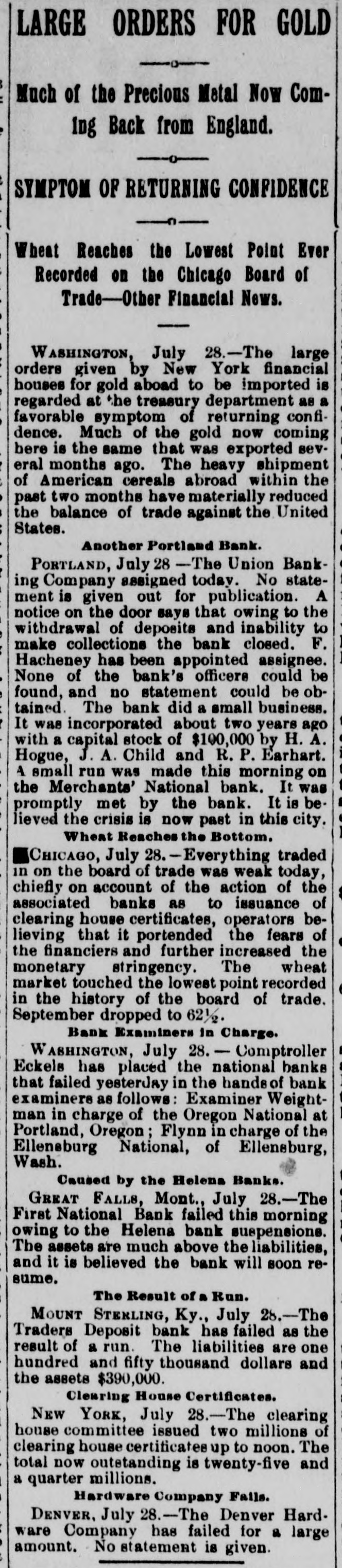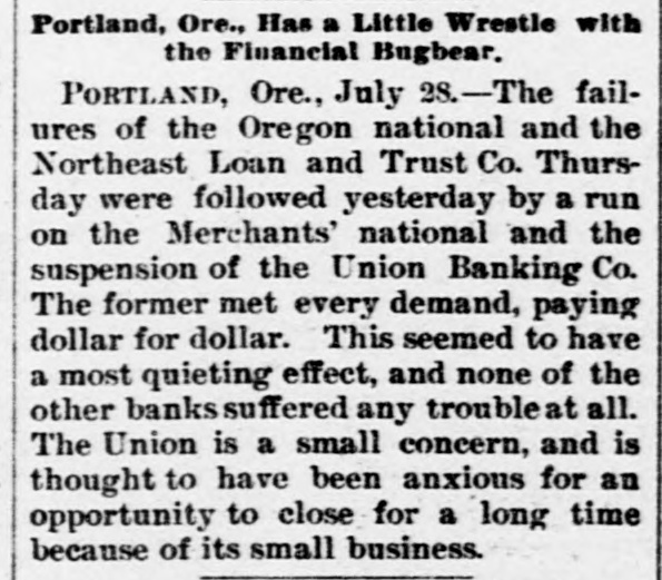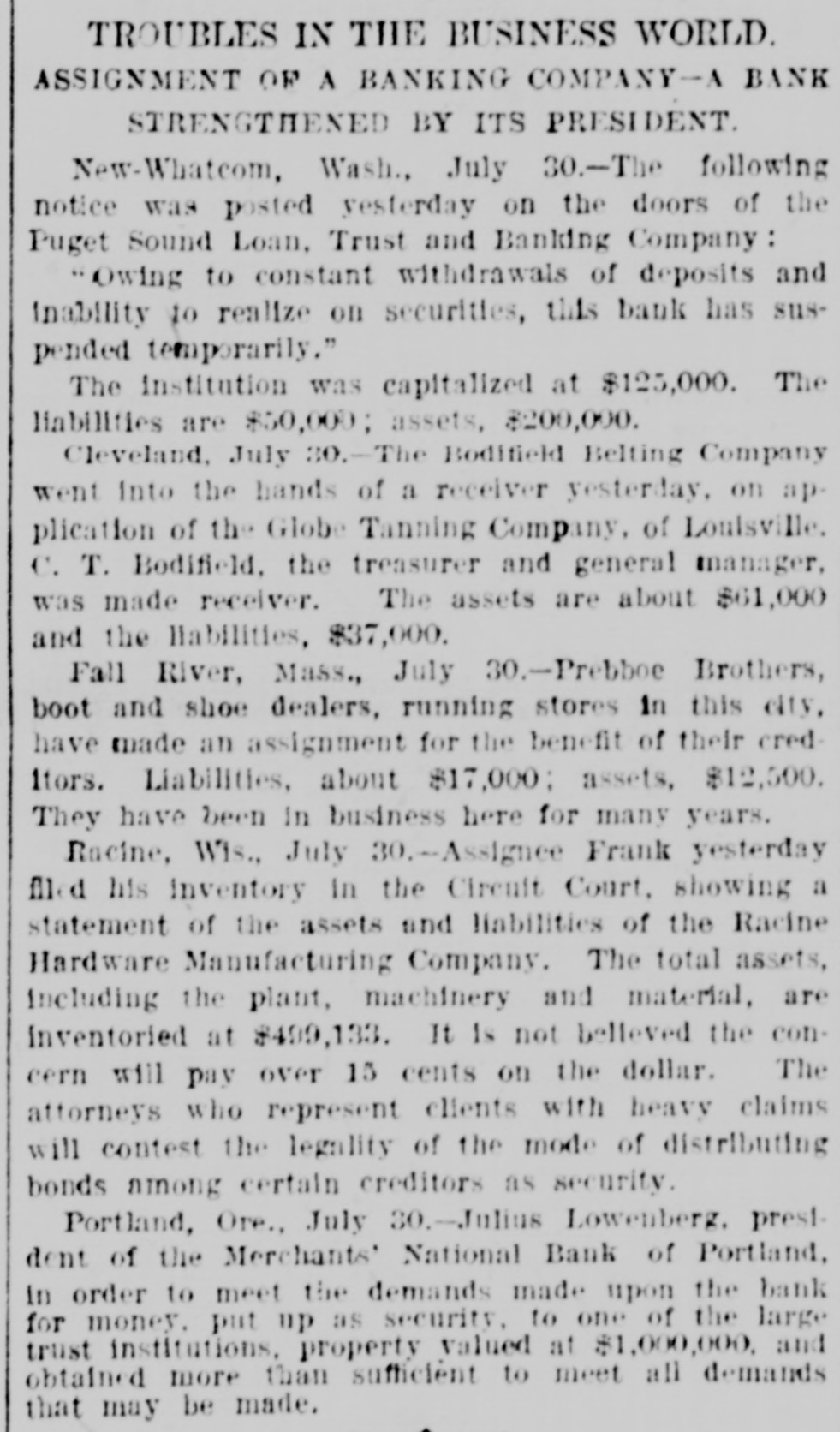 TROUBLES IN THE BUSINESS WORLD. ASSIGNMENT OF A BANKING COMPANY-A BANK STRENGTHENED BY ITS PRESIDENT. New-Whatcom, Wash., July 30.-The following notice was posted yesterday on the doors of the Puget Sound Loan, Trust and Banking Company: "Owing to constant withdrawals of deposits and inability to realize on securities, this bank has suspended temporarily." The institution was capitalized at $125,000. The liabilities are $50,000; assets, $200,000. Cleveland, July 30.-The Bodifield Belting Company went into the hands of a receiver yesterday, on application of the Globe Tanning Company, of Louisville. C. T. Bodifield, the treasurer and general manager, was made receiver. The assets are about $61,000 and the Habilities, $37,000. Fall River, Mass., July 30.-Prebboe Brothers, boot and shoe dealers, running stores In this city, have made an assignment for the benefit of their cred1tors. Liabilities, about $17,000; assets, $12,500. They have been in business here for many years. Racine, Wis., July 30.-Assignee Frank yesterday filed his inventory In the Circuit Court, showing a statement of the assets and liabilities of the Racine Hardware Manufacturing Company. The total assets, including the plant, machinery and material, are inventoried at $499,133. It is not believed the concern will pay over 15 cents on the dollar. The attorneys who represent clients with heavy claims will contest the legality of the mode of distributing bonds among certain creditors as security. Portland, Ore., July 30.-Julius Lowenberg. prestdent of the Merchants' National Bank of Portland, In order to meet the demands made upon the bank for money. put up as security, to one of the large trust institutions, property valued at $1,000,000, and obtained more than sufficient to meet all demands that may be made.