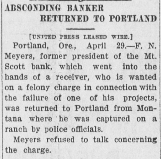 ABSCONDING BANKER RETURNED TO PORTLAND [UNITED PRESS LEASED WIRE.] Portland, Ore., April 29.-F. N. Meyers, former president of the Mt. Scott bank, which went into the hands of a receiver, who is wanted on a felony charge in connection with the failure of one of his projects, was returned to Portland from Montana where he was captured on a ranch by police officials. Meyers refused to talk concerning the charge.