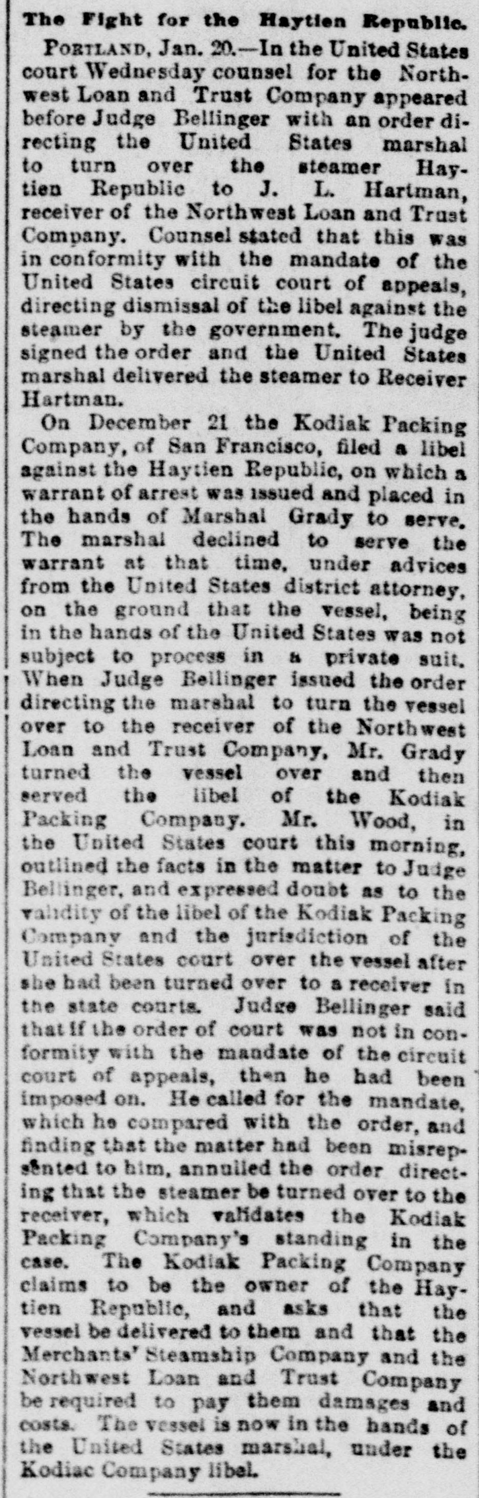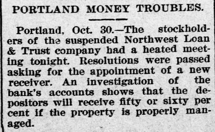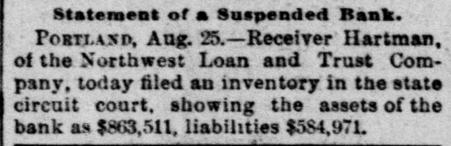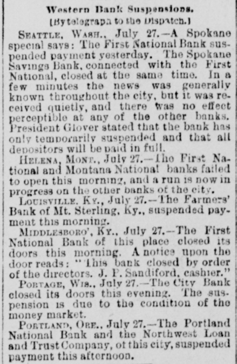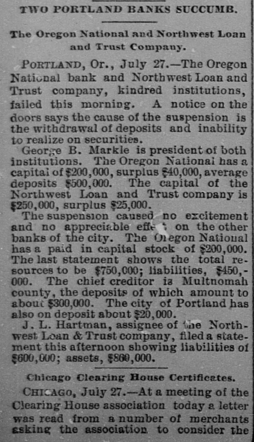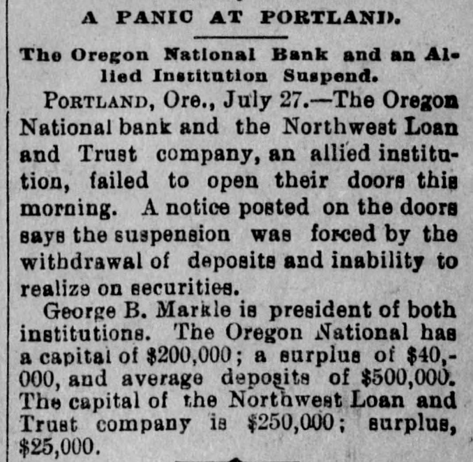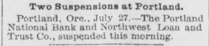 WIDELY SCATTERED. Hard Times in Varions Sections of the Country. PORTLAND, Ore., July 27. - -The Oregon National bank and the Northwest Loan and Trust Co., kindred institutions, failed this morning. The suspension caused no excitement and had no appreciable effect on the other banks of the city. The Oregon National's last statement shows total resources of $750,000. liabilities of $450,000. The ohief creditor is Multnomab county, the deposit of which amounts to about $300,000. The city of Portland has also on deposit about $20,000. J. L. Hartman, assignee of the Northwest Loan and Trust company, filed n statement this afternoon showing liabilities of $600,000 and Reacts of 860,000. EXETER, N. H., July 27.--The National Granite State Bank temporarily suspended this morning. The institution is declared perfectly sound, embarrassment being caused by the drainage of cash and delayed remittances from Boston. Immediate 16sumption is expected. WILMINGTON, Del., July 27.-A receiver has been appointed for the Wilmington Dental Manufacturing Co. The company is perfectly solvent. Inability to realize on bills caused the directors to take this action for protection. ELLENBBURG, Wash.. July 27.-The Ellensburg National bank suspended payment to-day. George B. Markle, president of the two banks which failed in Portland today, is also president of the Ellensburg bank. SPARTA, Wis., July 27.-M. A. Thayer's bank and the Bank of Spartn closed to-day. Liabilities of the former $175,000. assets $225,000; liabilities of the latter $210.000, assets $300,000. PORTAGE, Wis., July 27. - The City Bank of Portage closed its doors to-day. It was capitalized at $25,000. H. B eese, secretary of state, was president of the bank. PHILADELPHIA, Pa., July 27.-S. H. Morrison, AD extensive lumber merobant, suspended, owing to slow collections, etc. Liabilities $100,000. MIDDLESBORO, Ky.. July -The First National bank failed this morning. No statement.