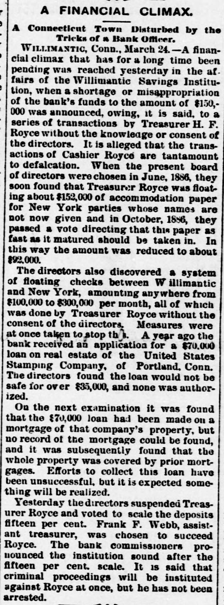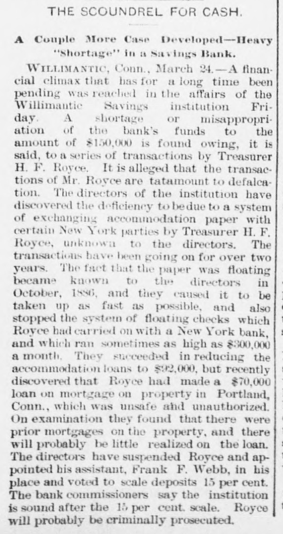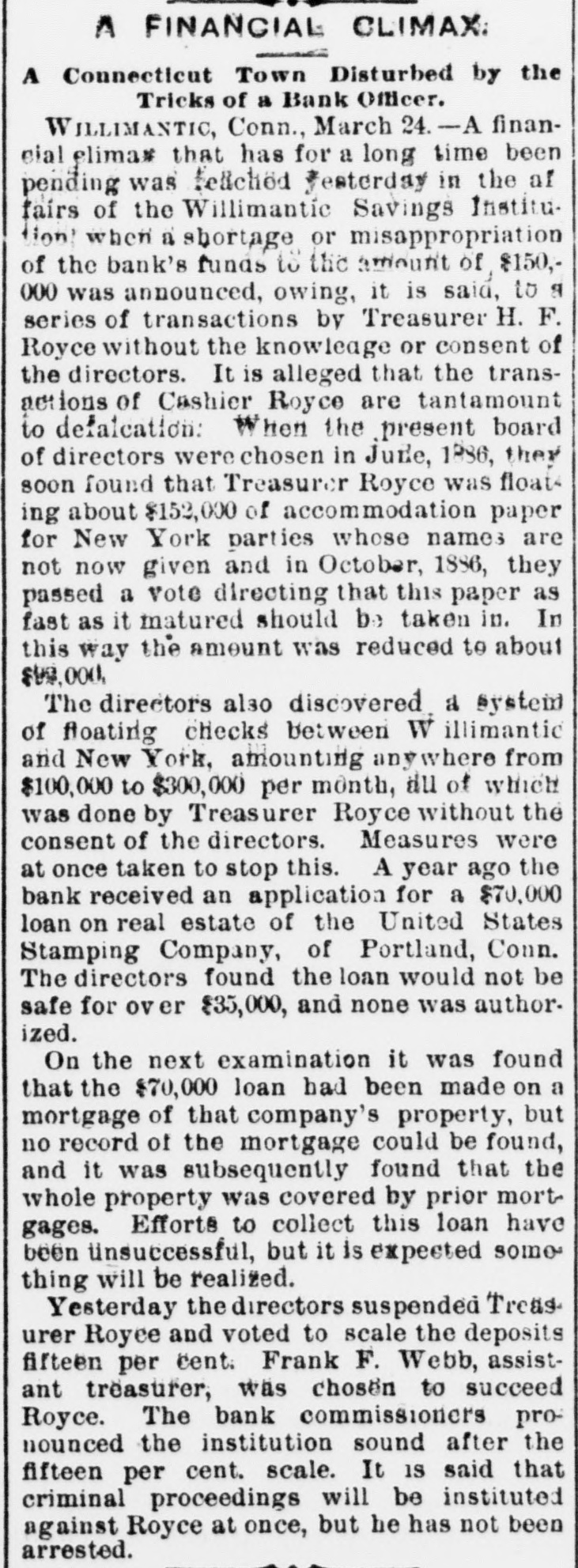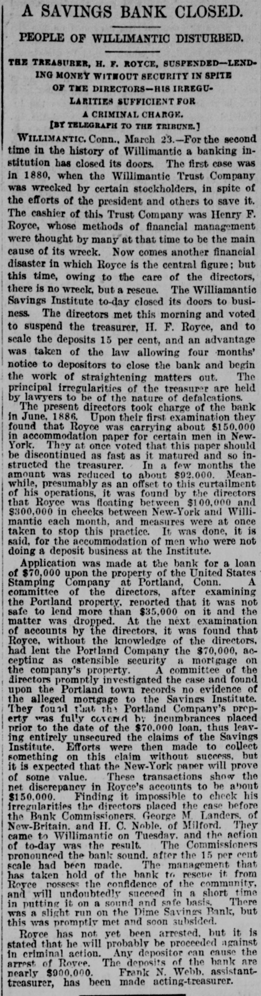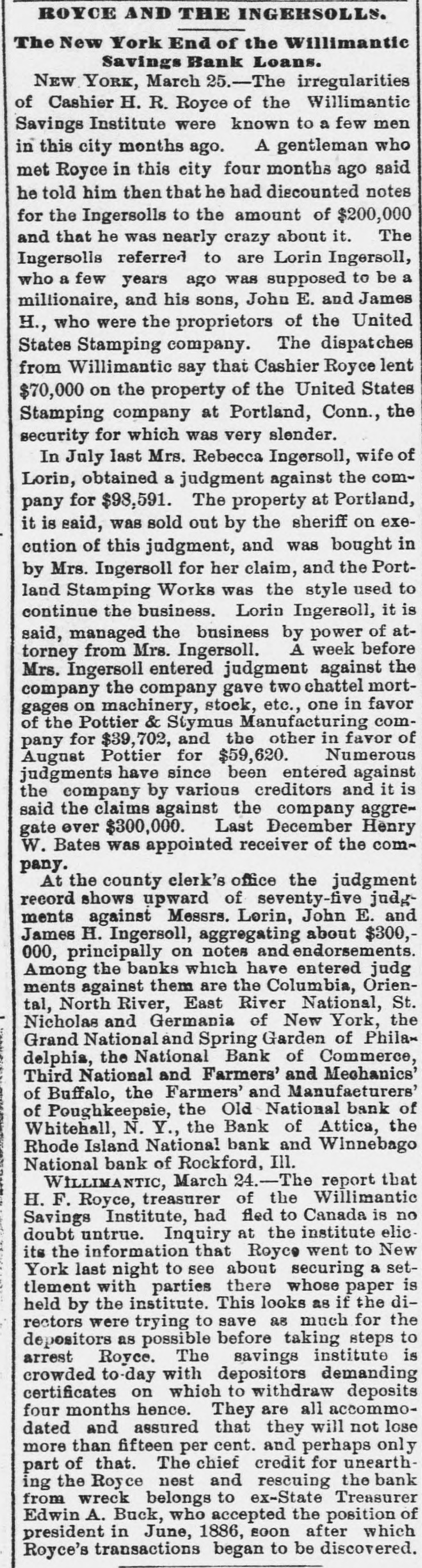 ROYCE AND THE INGERSOLLS. The New York End of the Willimantic Savings Bank Loans. NEW YORK, March 25.-The irregularities of Cashier H. R. Royce of the Willimantic Savings Institute were known to a few men in this city months ago. A gentleman who met Royce in this city four months ago said he told him then that he had discounted notes for the Ingersolls to the amount of $200,000 and that he was nearly crazy about it. The Ingersolls referred to are Lorin Ingersoll, who a few years ago was supposed to be a millionaire, and his sons, John E. and James H., who were the proprietors of the United States Stamping company. The dispatches from Willimantic say that Cashier Royce lent $70,000 on the property of the United States Stamping company at Portland, Conn., the security for which was very slender. In July last Mrs. Rebecca Ingersoll, wife of Lorin, obtained a judgment against the company for $98,591. The property at Portland, it is said, was sold out by the sheriff on execution of this judgment, and was bought in by Mrs. Ingersoll for her claim, and the Portland Stamping Works was the style used to continue the business. Lorin Ingersoll, it is said, managed the business by power of attorney from Mrs. Ingersoll. A week before Mrs. Ingersoll entered judgment against the company the company gave two chattel mortgages on machinery, stock, etc., one in favor of the Pottier & Stymus Manufacturing company for $39,702, and the other in favor of August Pottier for $59,620. Numerous judgments have since been entered against the company by various creditors and it is said the claims against the company aggregate ever $300,000. Last December Henry W. Bates was appointed receiver of the company. At the county clerk's office the judgment record shows upward of seventy-five judgments against Messrs. Lorin, John E. and James H. Ingersoll, aggregating about $300,000, principally on notes and endorsements. Among the banks which have entered judg ments against them are the Columbia, Oriental, North River, East River National, St. Nicholas and Germania of New York, the Grand National and Spring Garden of Philadelphia, the National Bank of Commerce, Third National and Farmers' and Mechanics' of Buffalo, the Farmers' and Manufacturers' of Poughkeepsie, the Old National bank of Whitehall, N. Y., the Bank of Attica, the Rhode Island National bank and Winnebago National bank of Rockford, Ill. WILLIMANTIC, March 24.-The report that H. F. Royce, treasurer of the Willimantic Savings Institute, had fled to Canada is no doubt untrue. Inquiry at the institute elicits the information that Royco went to New York last night to see about securing a settlement with parties there whose paper is held by the institute. This looks as if the directors were trying to save as much for the depositors as possible before taking steps to arrest Royce. The savings institute is crowded to-day with depositors demanding certificates on which to withdraw deposits four months hence. They are all accommodated and assured that they will not lose more than fifteen per cent. and perhaps only part of that. The chief credit for unearthing the Royce nest and rescuing the bank from wreck belongs to ex-State Treasurer Edwin A. Buck, who accepted the position of president in June, 1886, soon after which Royce's transactions began to be discovered.
