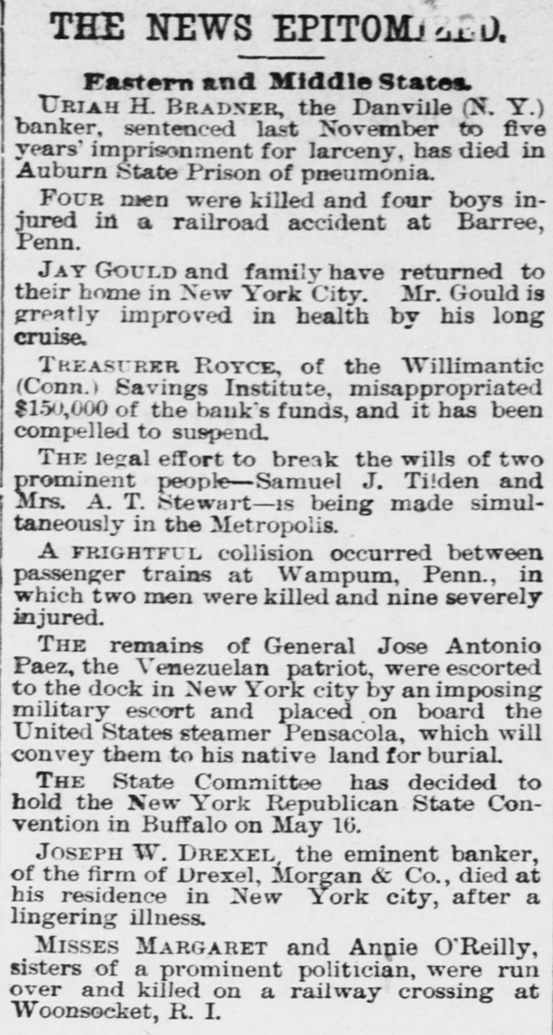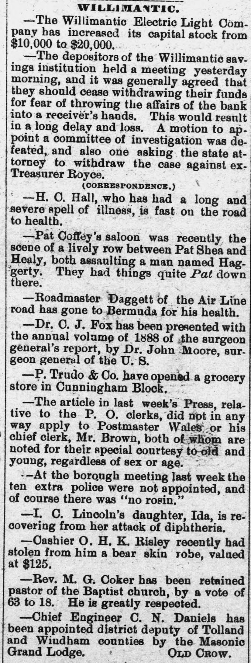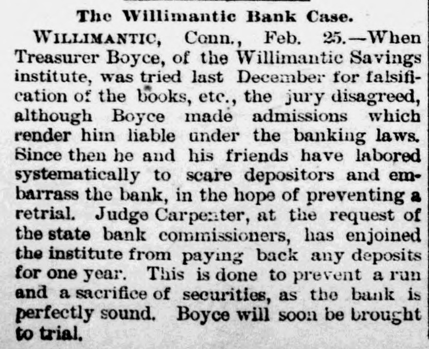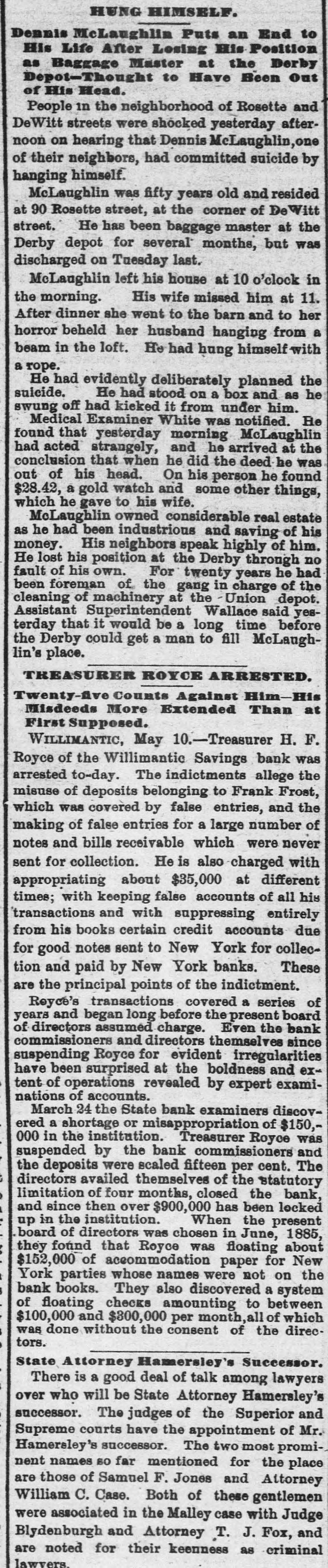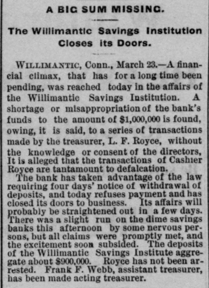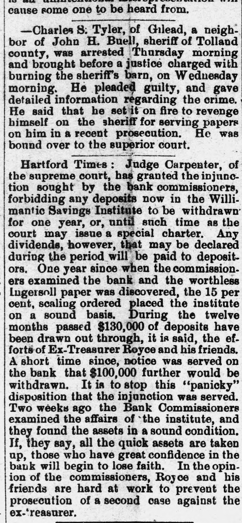 ROYCE AND THE INGERSOLLS. The New York End of the Willimantic Savings Bank Loans. NEW YORK, March 25.-The irregularities of Cashier H. R. Royce of the Willimantic Savings Institute were known to a few men in this city months ago. A gentleman who met Royce in this city four months ago said he told him then that he had discounted notes for the Ingersolls to the amount of $200,000 and that he was nearly crazy about it. The Ingersolls referred to are Lorin Ingersoll, who a few years ago was supposed to be a millionaire, and his sons, John E. and James H., who were the proprietors of the United States Stamping company. The dispatches from Willimantic say that Cashier Royce lent $70,000 on the property of the United States Stamping company at Portland, Conn., the security for which was very slender. In July last Mrs. Rebecca Ingersoll, wife of Lorin, obtained a judgment against the company for $98,591. The property at Portland, it is said, was sold out by the sheriff on execution of this judgment, and was bought in by Mrs. Ingersoll for her claim, and the Portland Stamping Works was the style used to continue the business. Lorin Ingersoll, it is said, managed the business by power of attorney from Mrs. Ingersoll. A week before Mrs. Ingersoll entered judgment against the company the company gave two chattel mortgages on machinery, stock, etc., one in favor of the Pottier & Stymus Manufacturing company for $39,702, and the other in favor of August Pottier for $59,620. Numerous judgments have since been entered against the company by various creditors and it is said the claims against the company aggregate ever $300,000. Last December Henry W. Bates was appointed receiver of the company. At the county clerk's office the judgment record shows upward of seventy-five judgments against Messrs. Lorin, John E. and James H. Ingersoll, aggregating about $300,000, principally on notes and endorsements. Among the banks which have entered judg ments against them are the Columbia, Oriental, North River, East River National, St. Nicholas and Germania of New York, the Grand National and Spring Garden of Philadelphia, the National Bank of Commerce, Third National and Farmers' and Mechanics' of Buffalo, the Farmers' and Manufacturers' of Poughkeepsie, the Old National bank of Whitehall, N. Y., the Bank of Attica, the Rhode Island National bank and Winnebago National bank of Rockford, Ill. WILLIMANTIC, March 24.-The report that H. F. Royce, treasurer of the Willimantic Savings Institute, had fled to Canada is no doubt untrue. Inquiry at the institute elicits the information that Royco went to New York last night to see about securing a settlement with parties there whose paper is held by the institute. This looks as if the directors were trying to save as much for the depositors as possible before taking steps to arrest Royce. The savings institute is crowded to-day with depositors demanding certificates on which to withdraw deposits four months hence. They are all accommodated and assured that they will not lose more than fifteen per cent. and perhaps only part of that. The chief credit for unearthing the Royce nest and rescuing the bank from wreck belongs to ex-State Treasurer Edwin A. Buck, who accepted the position of president in June, 1886, soon after which Royce's transactions began to be discovered.