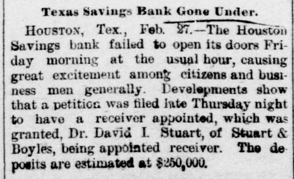 NEWS OF THE WORLD. A Bank Fails at Houston Texas, A MILLION DOLLARS. FOR The Troubles of a Bavarian Who Proved too Attractive to the Fair Sex. Special to the Herald by the Associated Press. HOUSTON, Tex., December 19.-Con siderable excitement was occasioned here this afternoon by the failure of the City Bank of Houston, one of the oldest financial institutions in the city and having a pa.d up capital of $500,000. The doors were closed at 1 o'clock, a notice being posted thereon that the bank had suspended payment pending an application for the appointment of a receiver. At 2:30 P. M. Judge Materson, of the District Court, on a petition filed by the bank's attorney, granted an order appointing Benj. F. Weems, receiver, and that gentleman immediately qualified in bonds of $300,000. Hon. Wm. R. Baker, present Mayor of the city, is President of the bank and Benj. F. Weems, Cashier. While the failure caused some consternation throughout the city, and a large crowd gathered about the bank clamoring for their money, yet the sus. was no surprise to the Total liabilities the a million dollars. other generally. pension including banks capital and An stock, exact business of will statement the exceed bank, men, of the bank's affairs at the time of the suspension is not obtainable to-night, but the last statement made, August 7 1885, gave the assets and liabilities as follows: Loans and discounts, $614,939; stocks and bonds, $343,662; bank building and furniture, $74,566; cash on hand, $145,445; exchange, $62,558; total, $1,241,230. Liabilities-Capital stock, $500,000; demand deposits, $417,841; time deposits, $255,589; due other banks, $65,047; profits, $2753; total, $1,241,230. The above statement is believed to represent nearly the condition of the bank's finances at the time of the suspension. The bank has been losing money for years. Since the time of the failure of William J. Hutchins who was indebted to the bank in $350,000. As security they held liens upon Hutchius' hotel property, the Eureka mills and several va. cant lots. This property constantly depressed in value on the bank's hands, and finally became a source of expense instead of revenue. Owing to the fact that several members of the directory of the Houston Savings Bank are also officers in the suspended bank, e run was immediately inaugurated on the savings bank, but all claims were promptly met. The bank, however, closed its doors at 3 o'clock, the usual closing hour, with a long line of anxious depositors waiting to reach the paying teller's window. If the run is continued on Monday it is believed that the savings bank will be prepared to meet the exigency. The deposits of the broken bank will reach over $500,000. Many poor people were among the depositors.