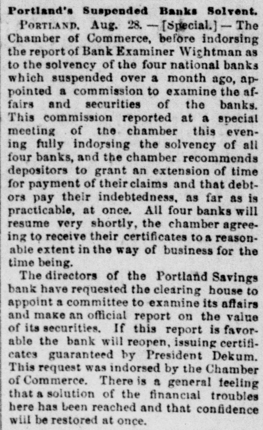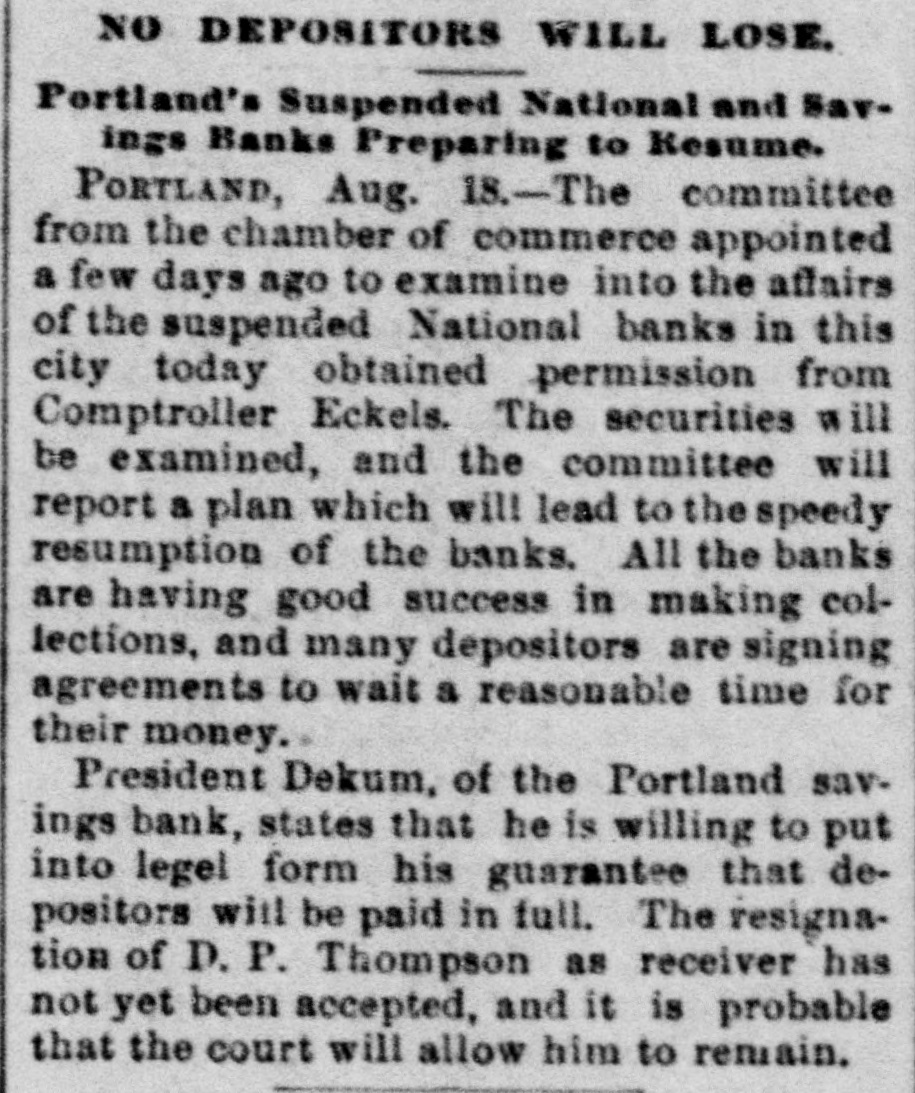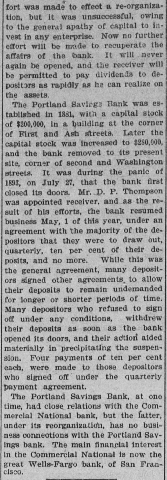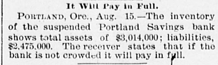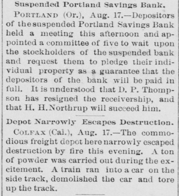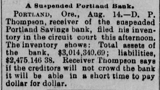 YET THEY GO DOWN. The Financial Cloud Hangs Low in the Eastern Sky. There Is a Brightening in Spots, but Still the Storm Is Not Over. Special to THE MORNING CALL PITTSBURG, Aug. 17.-The Oliver Iron and Steel Company, one of the largest concerns in this country, went into the hands of a receiver to-day, on the application of the National Tube Works Company of New Jersey and E. C. Converse of New York. The capital of the company is $1,000,000; apparent indebtedness, $600,000: bonded indebtedness, $585,000. H. W. Oliver was appointed receiver. The company has extensive plants in Pittsburg and Alleghany and employs 4000 inen. It is also largely interested in coke and natural gas, The sales aggregate $5,500,000 annually, George T. Oliver. president of the Oliver and Roberts Wire Company, said: "The appointment of a receiver for the Oliver Iron and Steel Company will not affect the other Oliver operations under my active egement. These companies, like other siness interests, are suffering from the gency in money and the unprecebusiness depression, but so far as I now see, they are fully able to meet liabilities." NDIANAPOLIS, Aug. 17. -Receiver Hawof the Indianapolis National Bank a a sworn statement to-day which indicates that perjury was committed by the bank's officers in making tax returns. CHICAGO, Aug. 17.-A proposition was made to-day to the creditors of John Cudaliy which will yield $1,300,000 instead of $800,000. John's brothers, Michael Edward and Patrick, have signed a contract to pay the creditors $500,000 in yearly installments and $100,000 in addition to the securities which Cudahy heretofore furnished. DENVER, Aug. 17.-The National Bank of Commerce reopened for business today with almost 100 per cent of its liabilities on hand. Three more of the suspended banks are expected to open by September 1. The American National Bank, which suspended July 1, resumed business this morning. DUBUQUE, Aug. 17.-The First National Bank, one of the oldest institutions in the city, with a capital of $200,000, suspended this morning. The last statement showed deposits of $520,890. The failure is due to withdrawals. CINCINNATI, Aug, 17.-The Standard Wagon Company, the largest company of its kind in the United States, assigned this morning to Grant H. Burrows. The assets are $1,200,000; liabilities, $700,000. NEW YORK, Aug: 17.-Davis & Co., wholesale dry-goods dealers of this city and Chicago, assigned to-day. The liabilities and assets are about $200,000 each; Stringency of the money market is the cause of the failure. HUNTINGTON, Pa., Aug. 17.- The national bank at Wyndham, Bedford County, closed its doors to-day. The bank was operated by John K. and George B. White, who besides operated four large tanneries located at Wyndham, Dry Run and Manns Choice, which were also forced to close down. The liabilities are estimated at $350,000, with assets of $450,000. PORTLAND, Or., Aug. 17.-Depositors of the suspended Portland Savings Bankheld a meeting this afternoon and appointed a committee of five to wait upon the stockholders of the suspended bank and request them to pledge their individual property as a guarantee that the depositors of the bank will be paid in fill. It is understood that D. P. Thompson has resigned the receivership and that H, H. Northrup will succeed him.