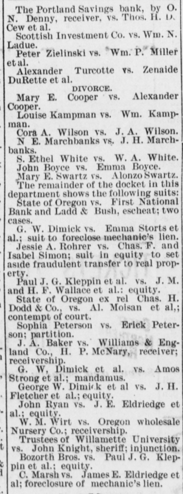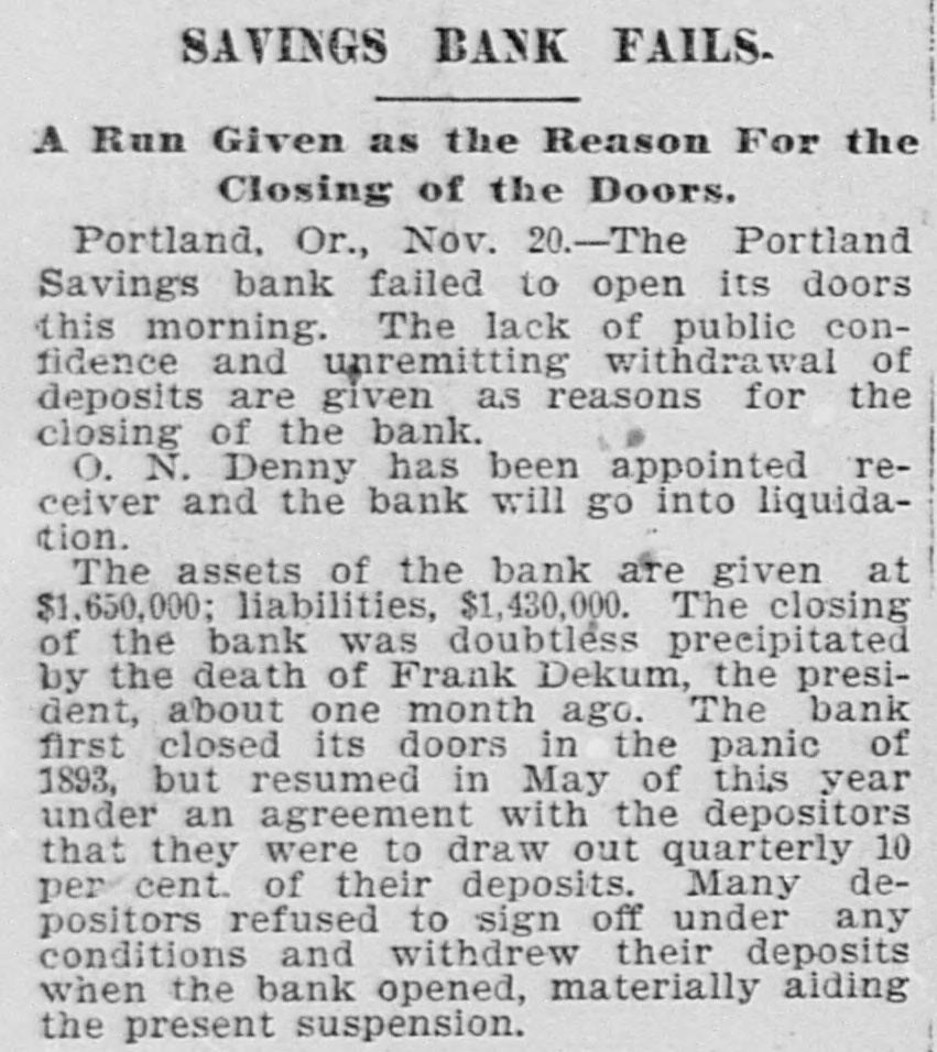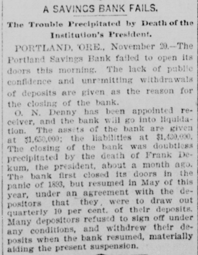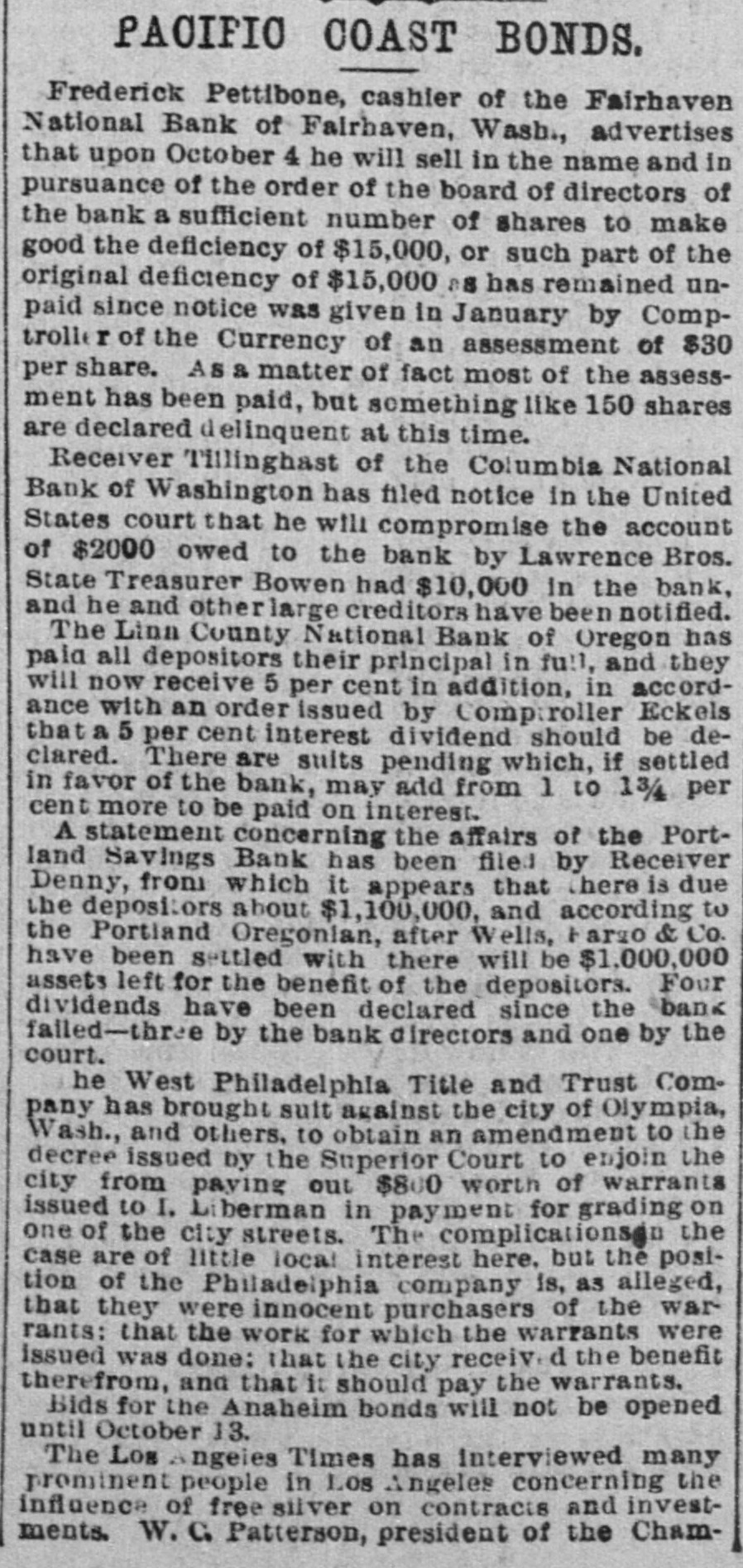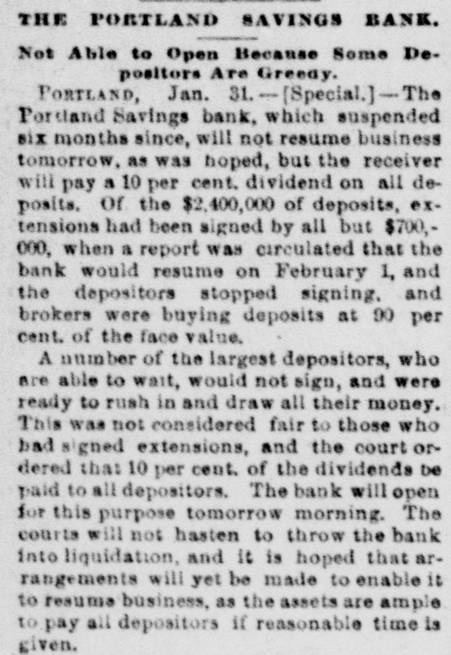 YET THEY GO DOWN. The Financial Cloud Hangs Low in the Eastern Sky. There Is a Brightening in Spots, but Still the Storm Is Not Over. Special to THE MORNING CALL PITTSBURG, Aug. 17.-The Oliver Iron and Steel Company, one of the largest concerns in this country, went into the hands of a receiver to-day, on the application of the National Tube Works Company of New Jersey and E. C. Converse of New York. The capital of the company is $1,000,000; apparent indebtedness, $600,000: bonded indebtedness, $585,000. H. W. Oliver was appointed receiver. The company has extensive plants in Pittsburg and Alleghany and employs 4000 inen. It is also largely interested in coke and natural gas, The sales aggregate $5,500,000 annually, George T. Oliver. president of the Oliver and Roberts Wire Company, said: "The appointment of a receiver for the Oliver Iron and Steel Company will not affect the other Oliver operations under my active egement. These companies, like other siness interests, are suffering from the gency in money and the unprecebusiness depression, but so far as I now see, they are fully able to meet liabilities." NDIANAPOLIS, Aug. 17. -Receiver Hawof the Indianapolis National Bank a a sworn statement to-day which indicates that perjury was committed by the bank's officers in making tax returns. CHICAGO, Aug. 17.-A proposition was made to-day to the creditors of John Cudaliy which will yield $1,300,000 instead of $800,000. John's brothers, Michael Edward and Patrick, have signed a contract to pay the creditors $500,000 in yearly installments and $100,000 in addition to the securities which Cudahy heretofore furnished. DENVER, Aug. 17.-The National Bank of Commerce reopened for business today with almost 100 per cent of its liabilities on hand. Three more of the suspended banks are expected to open by September 1. The American National Bank, which suspended July 1, resumed business this morning. DUBUQUE, Aug. 17.-The First National Bank, one of the oldest institutions in the city, with a capital of $200,000, suspended this morning. The last statement showed deposits of $520,890. The failure is due to withdrawals. CINCINNATI, Aug, 17.-The Standard Wagon Company, the largest company of its kind in the United States, assigned this morning to Grant H. Burrows. The assets are $1,200,000; liabilities, $700,000. NEW YORK, Aug: 17.-Davis & Co., wholesale dry-goods dealers of this city and Chicago, assigned to-day. The liabilities and assets are about $200,000 each; Stringency of the money market is the cause of the failure. HUNTINGTON, Pa., Aug. 17.- The national bank at Wyndham, Bedford County, closed its doors to-day. The bank was operated by John K. and George B. White, who besides operated four large tanneries located at Wyndham, Dry Run and Manns Choice, which were also forced to close down. The liabilities are estimated at $350,000, with assets of $450,000. PORTLAND, Or., Aug. 17.-Depositors of the suspended Portland Savings Bankheld a meeting this afternoon and appointed a committee of five to wait upon the stockholders of the suspended bank and request them to pledge their individual property as a guarantee that the depositors of the bank will be paid in fill. It is understood that D. P. Thompson has resigned the receivership and that H, H. Northrup will succeed him.