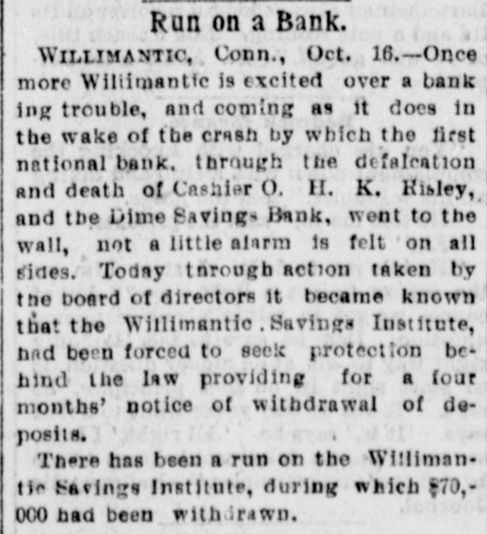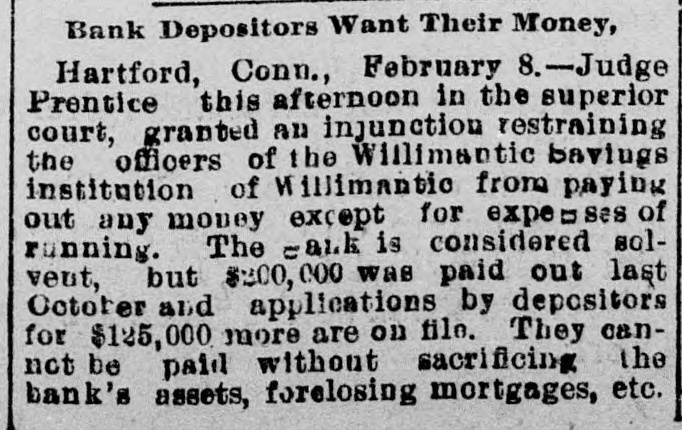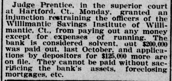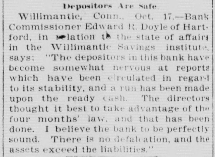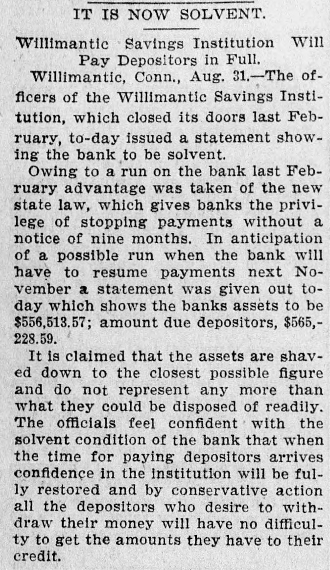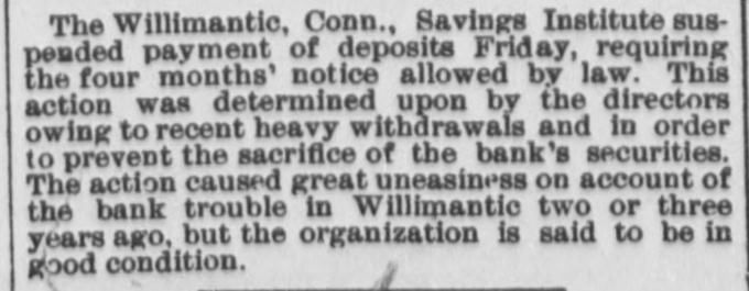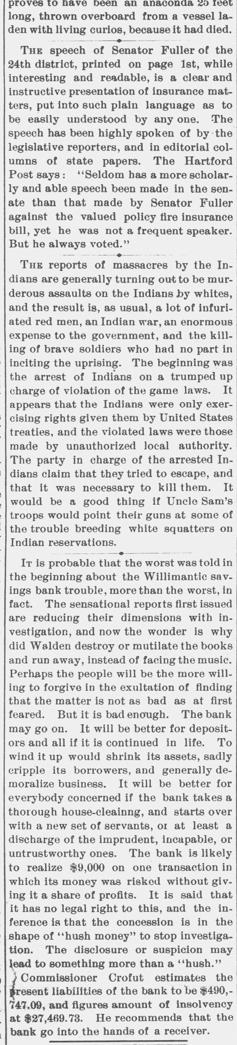 BANK EXAMINER BLAMED. The Public Think Cashier Walden Had too Good a Chance to Steal, Willimantic Conn. July 25.- Within the last few days there has [been"cc: siderable criticism in banking circles in regard to the way ex-Bank Examiner Buck has conducted the examinations of the Dime Savings Bank. It has been asserted that considerable blame rests upon him for the present condition of the banks He has always been considered a man of irreproachible character and well up in banking matters and fully capable of occupying the position he held. The last examination he made of the bank was June 15 just previous to his turning over the office to his successor. At that examination he found the bank had assets of $627,080 and was in a perfectly solvent condition On July 21 Mr. Crofut made an examination after the scale of 16 per_cent was declared placed with liabilities at $491,992; assets $483,301 pronouncing the bank insolvent. Buck procured a statement from Crofut and after a comparative examination made with one made by him June 15 gave the result to the press representative tonight. Buck's statement corresponds with Crofut's in every respect with the exception of three items. Mr. Buck places the expense account at $531 safe and fixtures $3411; cash on hand $5733. Mr. Crofut put the above items at $2904. Assuming that Mr. Buck's appraisal of three items is correct it will leave according to Mr. Crofut's statement a deficiency in the assets of about $1800 which is all that Walden could have possibly taken away with him. Mr. Buck considers that a large amount of paper Crofut has wiped out as of doubtful value "is collectible and dividends coming from Morrison Company and Allentown transactions place the bank in a solvent condition today. Mr. Buck's theory was if there was any stealing done it was probably $25000 Walden might have used to put into the Morrison Company. In his opinion to appoint a receiver would be the worst step the depositors could take as it would take a number of years to wind up the affairs of the institution with probably a loss of about two-thirds of the deposits. Kelley and Sumner returned from Allentown today and reported a meeting of the directors this evening. A deed was transferred from Walden to the bank and accepted by the directors. This means that the bank will receive $9800 on the transaction. The condition of the Dime Savings Bank occasioned a slight run on the Willimantic Savings Institution but it stands ready to meet all demands and is paying off depositors in gold. The directors decided to offeria reward for the arrest of Walden.