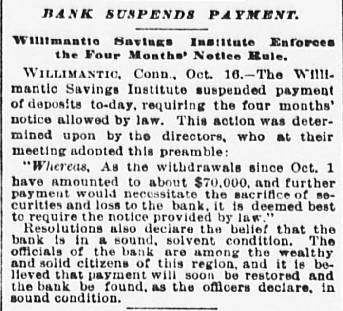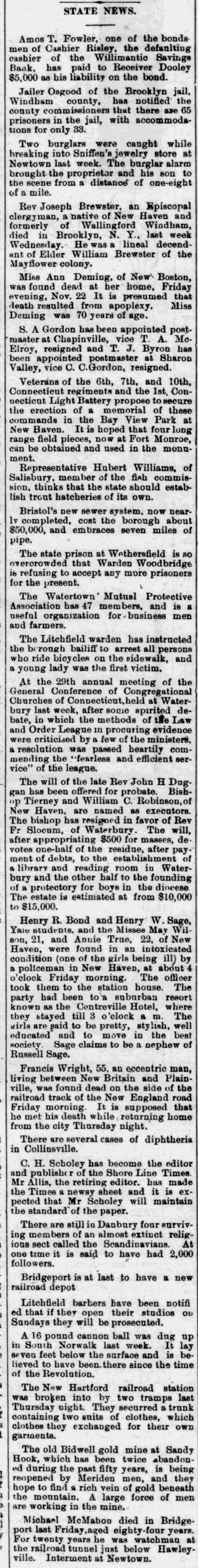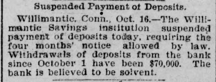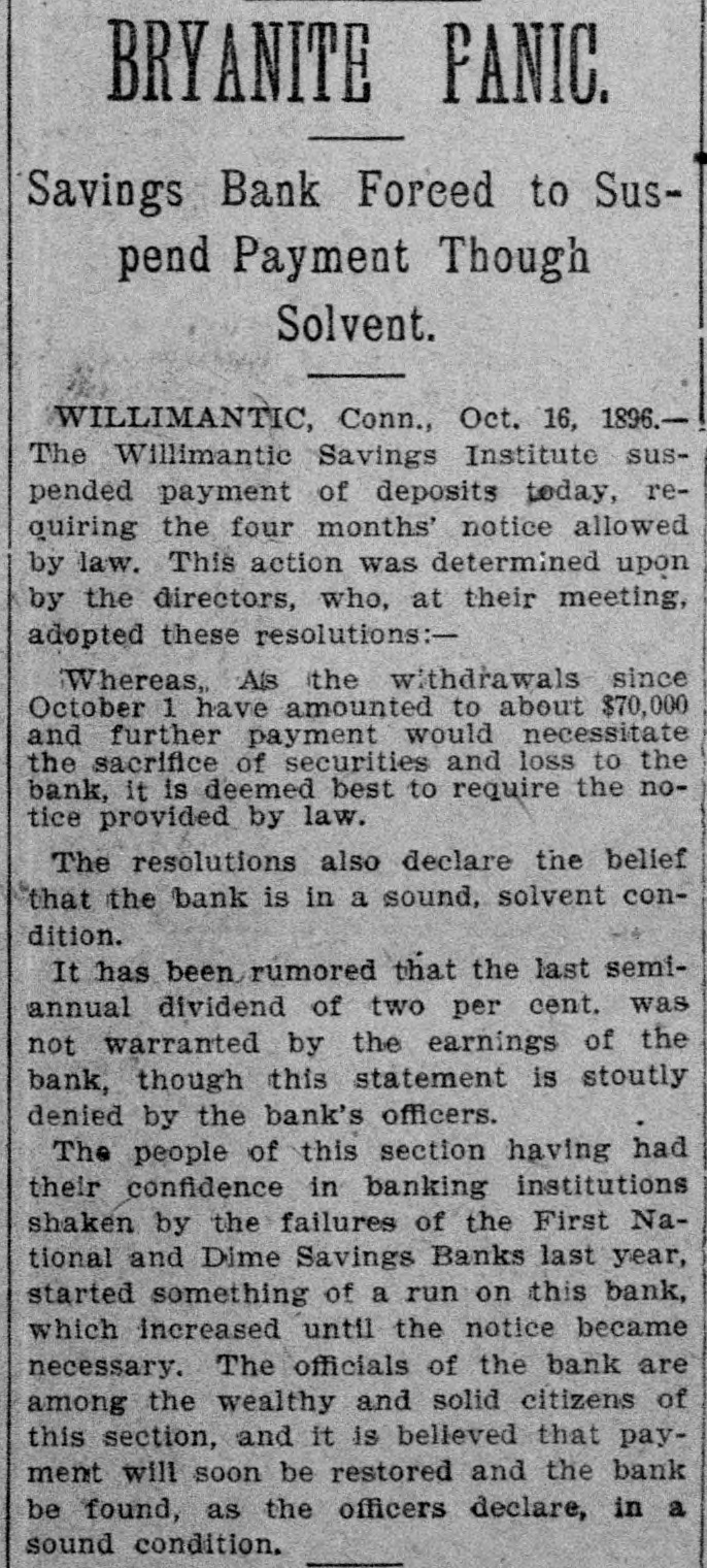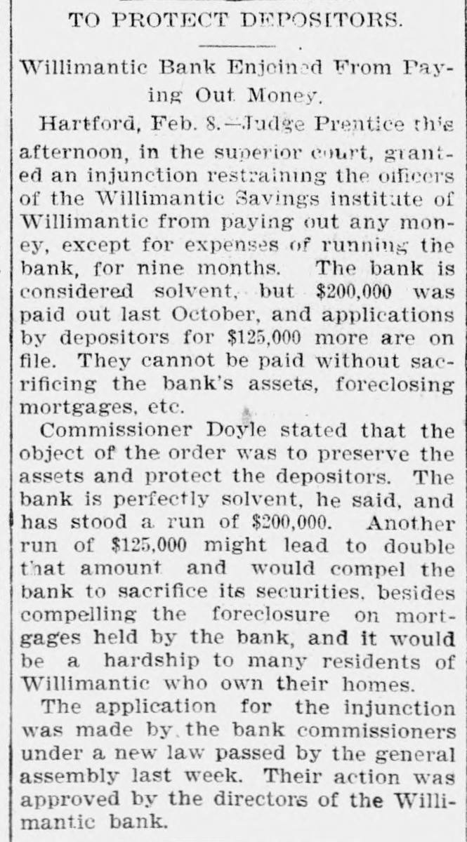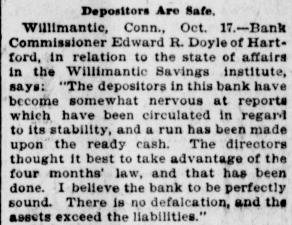 BANK EXAMINER BLAMED. The Public Think Cashier Walden Had too Good a Chance to Steal, Willimantic Conn. July 25.- Within the last few days there has [been"cc: siderable criticism in banking circles in regard to the way ex-Bank Examiner Buck has conducted the examinations of the Dime Savings Bank. It has been asserted that considerable blame rests upon him for the present condition of the banks He has always been considered a man of irreproachible character and well up in banking matters and fully capable of occupying the position he held. The last examination he made of the bank was June 15 just previous to his turning over the office to his successor. At that examination he found the bank had assets of $627,080 and was in a perfectly solvent condition On July 21 Mr. Crofut made an examination after the scale of 16 per_cent was declared placed with liabilities at $491,992; assets $483,301 pronouncing the bank insolvent. Buck procured a statement from Crofut and after a comparative examination made with one made by him June 15 gave the result to the press representative tonight. Buck's statement corresponds with Crofut's in every respect with the exception of three items. Mr. Buck places the expense account at $531 safe and fixtures $3411; cash on hand $5733. Mr. Crofut put the above items at $2904. Assuming that Mr. Buck's appraisal of three items is correct it will leave according to Mr. Crofut's statement a deficiency in the assets of about $1800 which is all that Walden could have possibly taken away with him. Mr. Buck considers that a large amount of paper Crofut has wiped out as of doubtful value "is collectible and dividends coming from Morrison Company and Allentown transactions place the bank in a solvent condition today. Mr. Buck's theory was if there was any stealing done it was probably $25000 Walden might have used to put into the Morrison Company. In his opinion to appoint a receiver would be the worst step the depositors could take as it would take a number of years to wind up the affairs of the institution with probably a loss of about two-thirds of the deposits. Kelley and Sumner returned from Allentown today and reported a meeting of the directors this evening. A deed was transferred from Walden to the bank and accepted by the directors. This means that the bank will receive $9800 on the transaction. The condition of the Dime Savings Bank occasioned a slight run on the Willimantic Savings Institution but it stands ready to meet all demands and is paying off depositors in gold. The directors decided to offeria reward for the arrest of Walden.