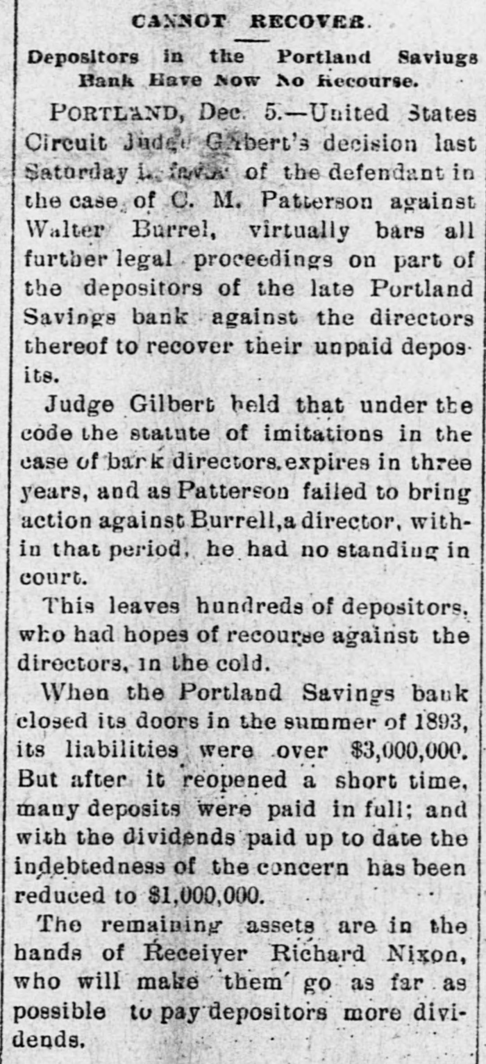 The question was raised in the Portland hospital receivership. In that case the company which holds a mortgage on the building tried to defeat the claims of certain creditors against the receiver, on the plea that the appointment of the receiver, to begin with, was illegal. Judge Cleland held that while that was deubtless true, the receivership was a fact, and had been permitted to exist and do business without any protest by the mortgage company or any one else interested, and they were stopped from raising the issue now. The court would probably make the same ruling in the Portland Savings bank, and other receivership cases, but Judge Cleland, while holding that the old receiverships of this kind will stand law, does not intend to appoint any more such receivers.