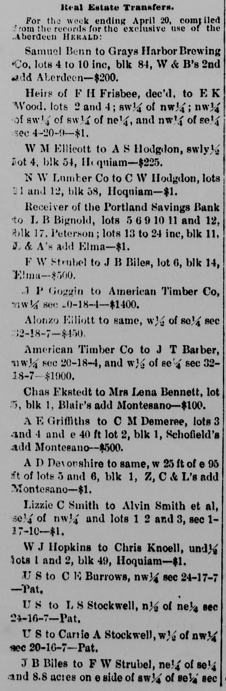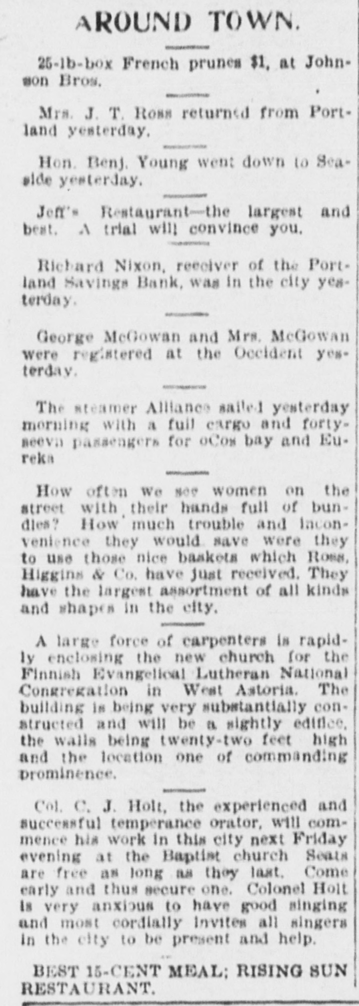 AROUND TOWN. 25-lb-box French prunes $1, at Johnson Bros. Mrs. J. T. Ross returned from Portland yesterday. Hon. Benj. Young went down to Seaside yesterday. Jeff's Restaurant-the largest and best. A trial will convince you. Richard Nixon, receiver of the Portland Savings Bank, was in the city yesterday. George McGowan and Mrs. McGowan were registered at the Occident yesterday. The steamer Alliance sailed yesterday morning with a full cargo and forty-seven passengers for oCos bay and Eureka How often we see women on the street with their hands full of bundles? How much trouble and incon-venience they would save were they to use those nice baskets which Ross, Higgins & Co. have just received. They have the largest assortment of all kinds and shapes in the city. A large force of carpenters is rapidly enclosing the new church for the Finnish Evangelical Lutheran National Congregation in West Astoria. The building is being very substantially con-structed and will be a sightly edifice, the walls being twenty-two feet high and the location one of commanding prominence. Col. C. J. Holt, the experienced and successful temperance orator, will commence his work in this city next Friday evening at the Baptist church Seats are free as long as they last. Come early and thus secure one. Colonel Holt is very anxious to have good singing and most cordially invites all singers in the city to be present and help. BEST 15-CENT MEAL; RISING SUN RESTAURANT.
