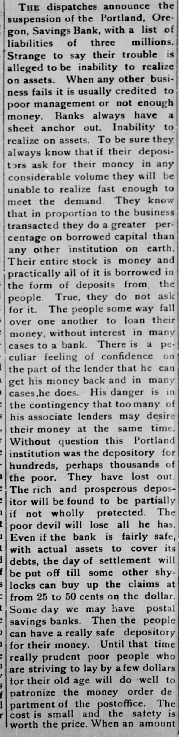 THE dispatches announce the suspension of the Portland, Oregon, Savings Bank, with a list of liabilities of three millions. Strange to say their trouble is alleged to be inability to realize on assets. When any other business fails it is usually credited to poor management or not enough money. Banks always have a sheet anchor out. Inability to realize on assets. To be sure they always know that if their depositors ask for their money in any considerable volume they will be unable to realize fast enough to meet the demand. They know that in proportion to the business transacted they do a greater percentage on borrowed capital than any other institution on earth. Their entire stock is money and practically all of it is borrowed in the form of deposits from the people. True, they do not ask for it. The people some way fall over one another to loan their money, without interest in many cases to a bank. There is a peculiar feeling of confidence on the part of the lender that he can get his money back and in many cases he does. His danger is in the contingency that too many of his associate lenders may desire their money at the same time. Without question this Portland institution was the depository for hundreds, perhaps thousands of the poor. They have lost out. The rich and prosperous depositor will be found to be partially if not wholly protected. The poor devil will lose all he has. Even if the bank is fairly safe, with actual assets to cover its debts, the day of settlement will be put off till some other shylocks can buy up the claims at from 25 to 50 cents on the dollar. Some day we may have postal savings banks. Then the people can have a really safe depository for their money. Until that time really prudent poor people who are striving to lay by a few dollars for their old age will do well to patronize the money order de partment of the postoffice. The cost is small and the safety is worth the price. When an amount
