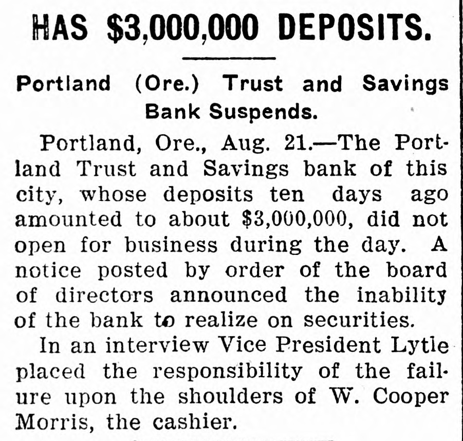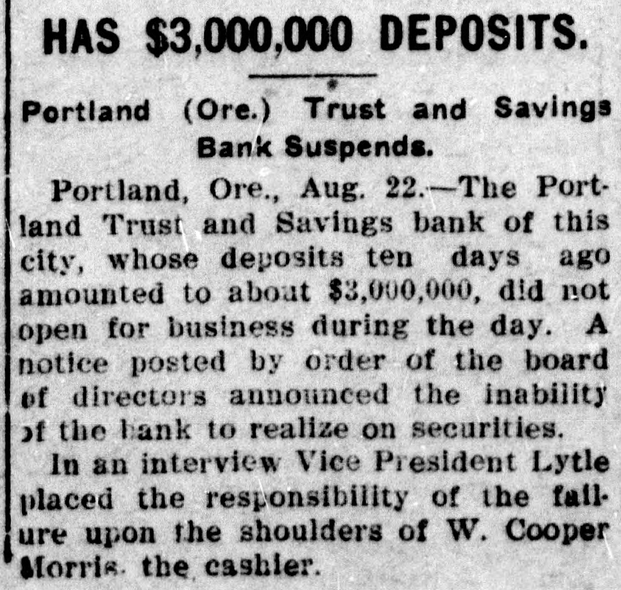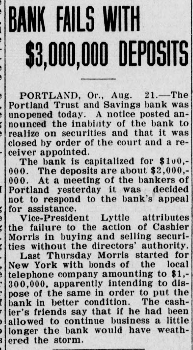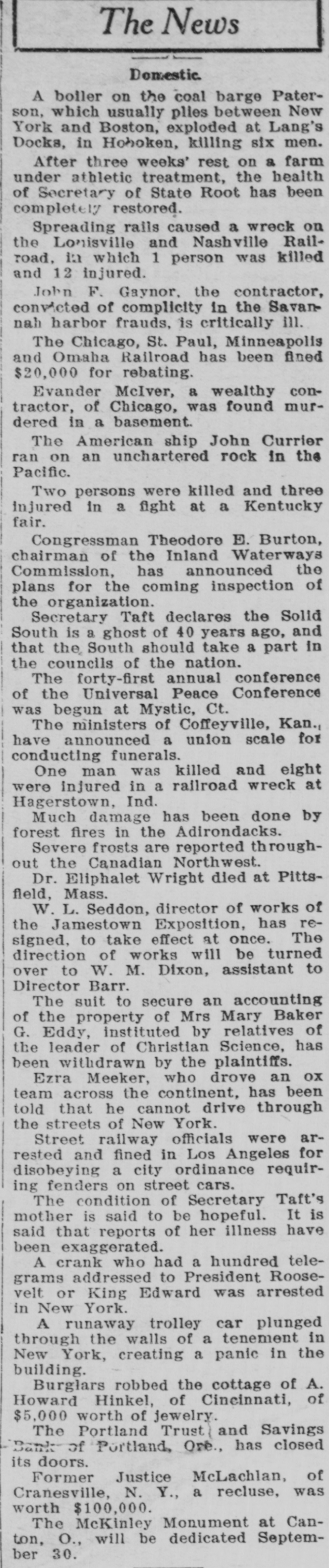 The News Domestic. A boiler on the coal barge Paterson, which usually plies between New York and Boston, exploded at Lang's Docks, in Hoboken, killing six men. After three weeks' rest on a farm under athletic treatment, the health of Secretary of State Root has been completely restored. Spreading rails caused a wreck on the Lonisville and Nashville Railroad, ia which 1 person was killed and 12 injured. John F. Gaynor, the contractor, convicted of complicity in the Savannah harbor frauds, is critically ill. The Chicago, St. Paul, Minneapolis and Omaha Railroad has been fined $20,000 for rebating. Evander McIver, a wealthy contractor, of Chicago, was found murdered in a basement. The American ship John Currier ran on an unchartered rock in the Pacific. Two persons were killed and three injured in a fight at a Kentucky fair. Congressman Theodore E. Burton, chairman of the Inland Waterways Commission, has announced the plans for the coming inspection of the organization. Secretary Taft declares the Solid South is a ghost of 40 years ago, and that the South should take a part in the councils of the nation. The forty-first annual conference of the Universal Peace Conference was begun at Mystic, Ct. The ministers of Coffeyville, Kan., have announced a union scale for conducting funerals. One man was killed and eight were injured in a railroad wreck at Hagerstown, Ind. Much damage has been done by forest fires in the Adirondacks. Severe frosts are reported throughout the Canadian Northwest. Dr. Eliphalet Wright died at Pittsfield, Mass. W. L. Seddon, director of works of the Jamestown Exposition, has resigned, to take effect at once. The direction of works will be turned over to W. M. Dixon, assistant to Director Barr. The suit to secure an accounting of the property of Mrs Mary Baker G. Eddy, instituted by relatives of the leader of Christian Science, has been withdrawn by the plaintiffs. Ezra Meeker, who drove an ox team across the continent, has been told that he cannot drive through the streets of New York. Street railway officials were arrested and fined in Los Angeles for disobeying a city ordinance requiring fenders on street cars. The condition of Secretary Taft's mother is said to be hopeful. It is said that reports of her illness have been exaggerated. A crank who had a hundred telegrams addressed to President Roosevelt or King Edward was arrested in New York. A runaway trolley car plunged through the walls of a tenement in New York, creating a panic in the building. Burglars robbed the cottage of A. Howard Hinkel, of Cincinnati, of $5,000 worth of jewelry. The Portland Trust and Savings Bank of Portland, Ore., has closed its doors. Former Justice McLachlan, of Cranesville, N. Y., a recluse, was worth $100,000. The McKinley Monument at Canton, O., will be dedicated September 30.