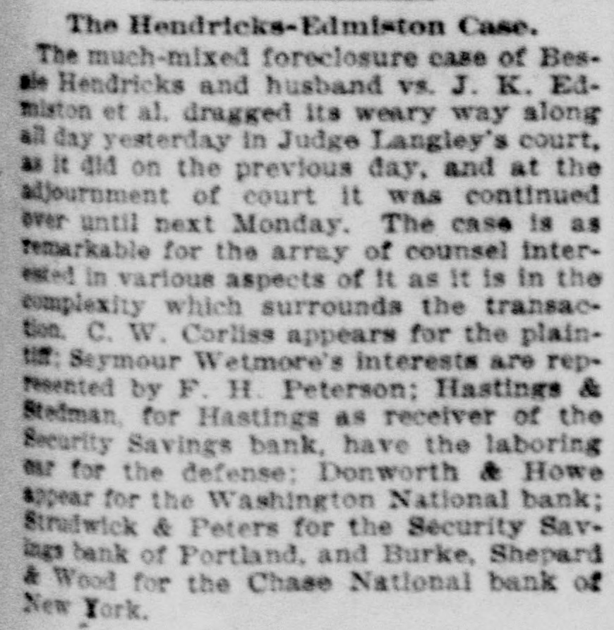 The Hendricks-Edmiston Case. The much-mixed foreclosure case of BesHendricks and husband vs. J. K. Edmiston et al. dragged its weary way along all day yesterday in Judge Langley's court, as It did on the previous day, and at the adjournment of court It was continued over until next Monday. The case is as remarkable for the array of counsel interested in various aspects of It as It is in the complexity which surrounds the transaction, C. W. Corliss appears for the plaintiff: Seymour Wetmore's interests are represented by F. H. Peterson: Hastings & Stedman, for Hastings as receiver of the Security Savings bank, have the laboring 012 for the defense: Donworth & Howe appear for the Washington National bank; Strudwick & Peters for the Security Savings bank of Portland, and Burke, Shepard & Wood for the Chase National bank of New York.