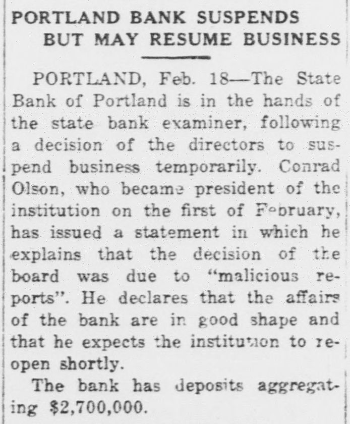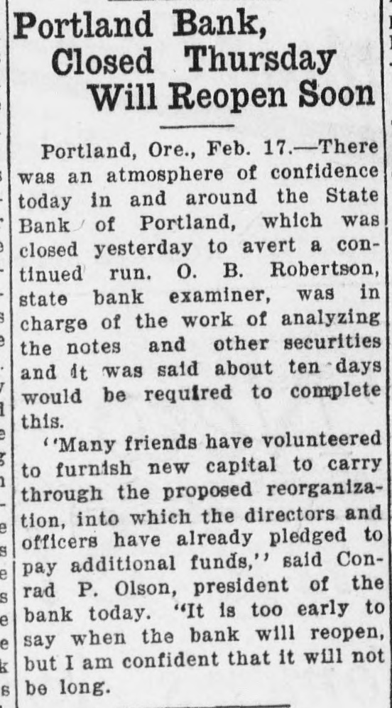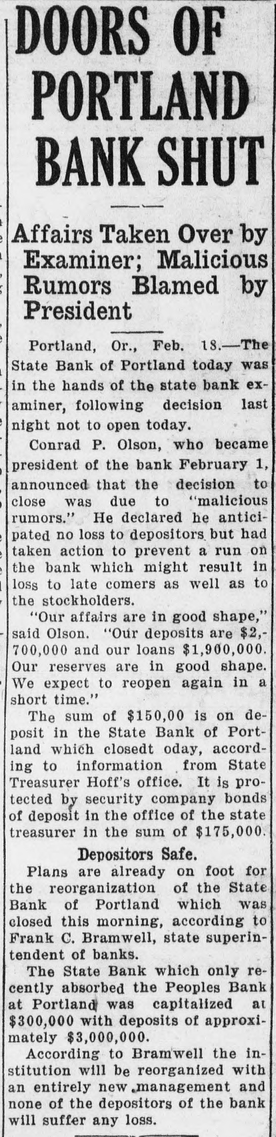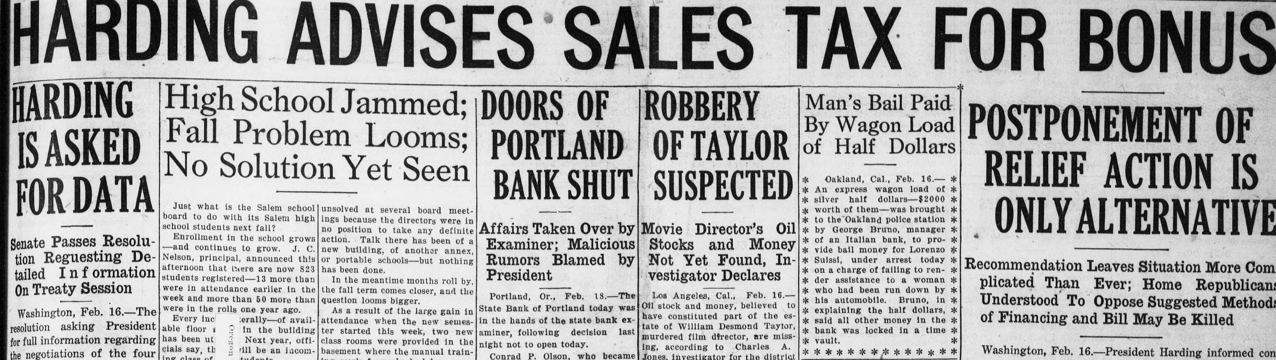 TAX HARDING ADVISES SALES FOR BONUS Man's Bail Paid High School Jammed; ROBBERY DOORS OF HARDING By Wagon Load Fall POSTPONEMENT OF Problem Looms; of Half Dollars PORTLAND OF TAYLOR ASKED No Solution Yet Seen Oakland, Cal., Feb. 16. * RELIEF ACTION IS An express wagon load of * BANK SHUT SUSPECTED silver half dollars-$2000 * Just what is the Salem school worth of them-was brought * unsolved at several board meetFOR DATA board to do with its Salem high to the Oakland police station * ings because the directors were in school students next fall? by George Bruno, manager * Movie Director's Oil no position to take any definite ONLY ALTERNATIVE Affairs Taken Over by Enrollment in the school grows of an Italian bank, to pro- * action. Talk there has been of a Senate Passes ResoluExaminer; Malicious Stocks and Money -and continues to grow. J. C. vide bail money for Lorenzo * new building, of another annex, Nelson, principal, announced this Suissi, under arrest today * tion Reguesting Deor portable schools-but nothing Rumors Blamed by Not Yet Found, Inafternoon that there are now 823 Recommendation Leaves Situation More Com has been done. on a charge of failing to ren- * tailed Inf ormation President students registered-13 more than vestigator Declares der assistance to a woman * In the meantime months roll by, plicated Than Ever; Home Republicans were in attendance earlier in the who had been run down by * the fall term comes closer, and the On Treaty Session Los Angeles, Cal., Feb. 16. Portland, Or., Feb. The week and more than 50 more than his automobile. Bruno, in * question looms bigger. Understood To Oppose Suggested Methods Oil stock and money, believed to State Bank of Portland today was * were in the rolls one year ago. explaining the half dollars, * As a result of the large gain in Washington, Feb. 16.-The have constituted part of the esEvery inc * in the hands of the state bank exterally-of availsaid all other money in the * attendance when the new semesof Financing and Bill May Be Killed tate of William Desmond Taylor, able floor resolution asking President * bank was locked in a time * in the building last ter started this week, two new aminer, following decision murdered film dfrector, are misshas been ut * vault. Next year, officlass rooms were provided in the for full information regarding night not to open today. ing, according to Charles A. rill be an incomcials say, th * basement where the manual trainWashington, Feb. 16.-President Harding informed con the negotiations of the four Conrad P. Olson, who became tudanta ing class of Jones. investigator for the district