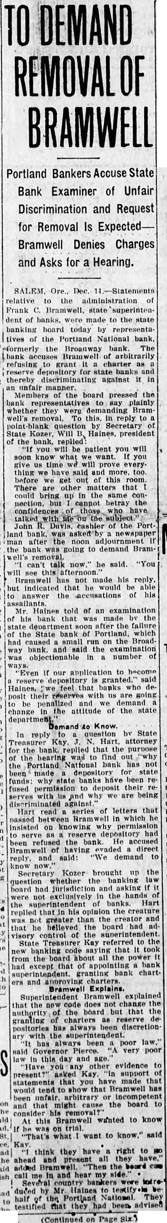 DEMAND OF BRAMWELL Portland Bankers Accuse State Bank Examiner of Unfair Discrimination and Request for Removal Is ExpectedBramwell Denies Charges and Asks for a Hearing. SALEM, Ore., Dec. 11.-Statements relative to the administration of Frank C. Bramwell, state superintendent of banks. were made to the state banking board today by representatives of the Portland National bank, formerly the Broanway bank. The bank Bramwell of arbitrarily refusing to grant charter as reserve depository for state and thereby discriminating against it in an unfair manner. Members of the board pressed the bank say plainly whether they were demanding Bramwell's removal. To this, in reply to question by Secretary of State Kozer, Will Haines, president of the bank, replied you will be patient you will soon know what we want. If you give us time will prove everything we said and more, too. before we get of this room. There are other matters that could bring up in the same connection, but cannot betray the confidences of those talked the John Davis, cashier of the Portland bank. was asked by newspaper man after the noon adjournment if the bank was going to demand Bramcan't talk now." he said. "You will see afternoon. Bramwell has not made his reply. but indicated that he would be able to answer the accusations of his Mr. Haines told of an examination of his bank that was the state department after the failure of the State bank of Portland, which had caused small run on the Broadway bank. and said the examination was objectionable in number of ways. "Even If our application to become reserve depository is granted. said Haines, that banks who deposit their reserves with us are going be penalized and we demand change the attitude of the state Demand Know. In reply question bv State Treasurer Kay Hart, attorney for the bank. replied that the purpose of the hearing to find out the Portland bank has not been made depository for state funds: why banks have been refused permission to deposit their serves with us and why we are being discriminated against Hart read series of letters that passed Bramwell in which he insisted on knowing why permission serve as reserve depository had been refused the bank. He accused Bramwell of having evaded direct and said: "We demand to reply. know now." Secretary Kozer brought up the question whether banking law board had jurisdiction and asking were exclusively in the hands of superintendent banks. Hart replied that his opinion the creature was not greater than the creator and that believed the board had advisory control of the superintendent. State Treasurer Kay referred to the new banking code saying that it took from the board about all the power had except that of appointing bank superintendent. granting bank charters and annroving charters. Bramwell Explains. Superintendent Bramwell explained that the new code does not change of the board but that the authority charters as reserve degranting positories has always been discretion with the superintendent. has always been poor law." said Governor Pierce. very poor in this day and age. 'Have you any other evidence to support of present?" asked Kay. statements that you have made that would tend to show that Bramwell has unfair. arbitrary or incompetent been might cause the board to and that consider his removal? Bramwell wanted to know At this was on what want to said "That's think they have right to ahead and present all they added Bramwell. the call in and hear my side. me Several country bankers were duced by Mr. Haines to testify be Portland National They half of the had been advised testified that they (Continued on Page