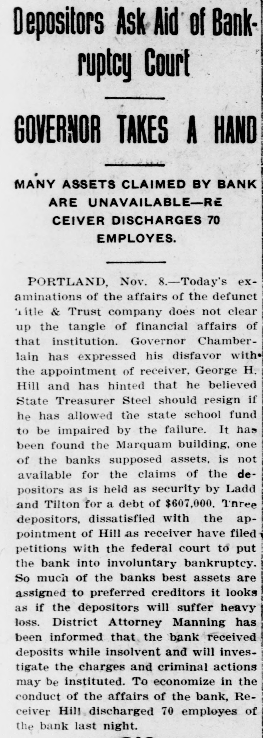Depositors Ask Aid of Bankruptcy Court GOVERNOR TAKES A HAND MANY ASSETS CLAIMED BY BANK ARE UNAVAILABLE-RE CEIVER DISCHARGES 70 EMPLOYES. PORTLAND, Nov. 8.-Today's examinations of the affairs of the defunct Title & Trust company does not clear up the tangle of financial affairs of that institution. Governor Chamberlain has expressed his disfavor with the appointment of receiver, George H. Hill and has hinted that he believed State Treasurer Steel should resign if he has allowed the state school fund to be impaired by the failure. It has been found the Marquam building, one of the banks supposed assets, is not available for the claims of the depositors as is held as security by Ladd and Tilton for a debt of $607,000. Three depositors, dissatisfied with the appointment of Hill as receiver have filed petitions with the federal court to put the bank into involuntary bankruptcy. So much of the banks best assets are assigned to preferred creditors it looks as if the depositors will suffer heavy loss. District Attorney Manning has been informed that the bank received deposits while insolvent and will investigate the charges and criminal actions may be instituted. To economize in the conduct of the affairs of the bank, Receiver Hill discharged 70 employes of the bank last night.